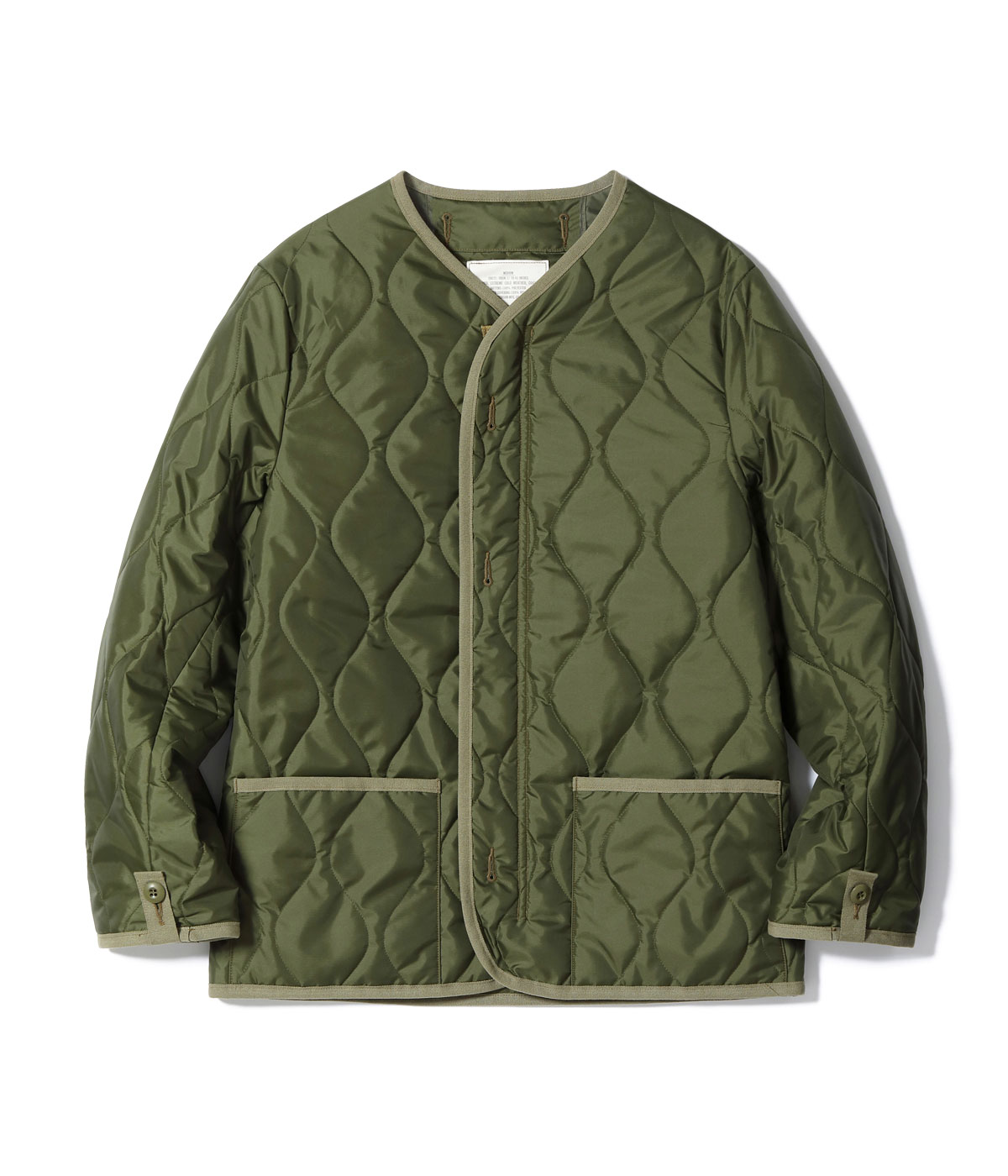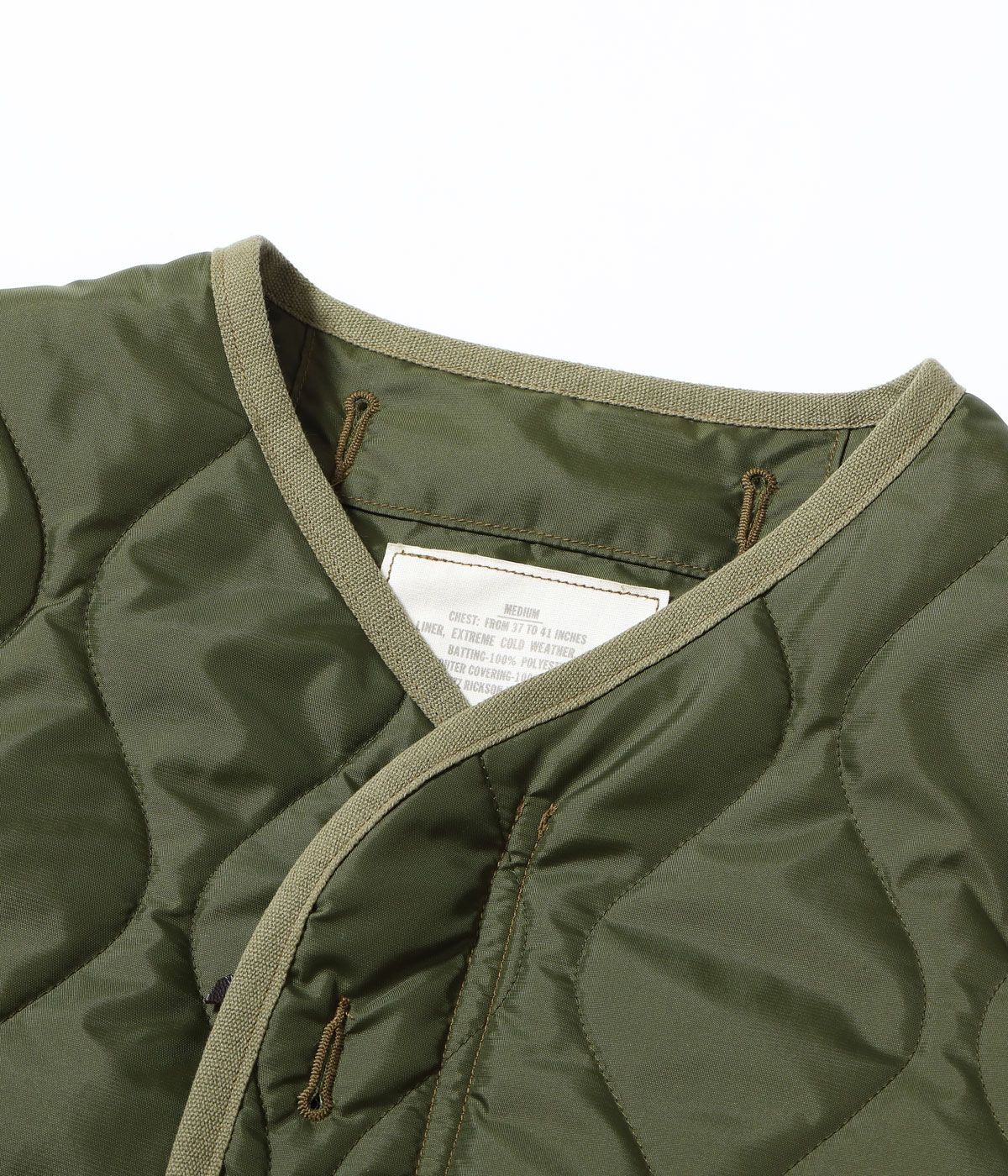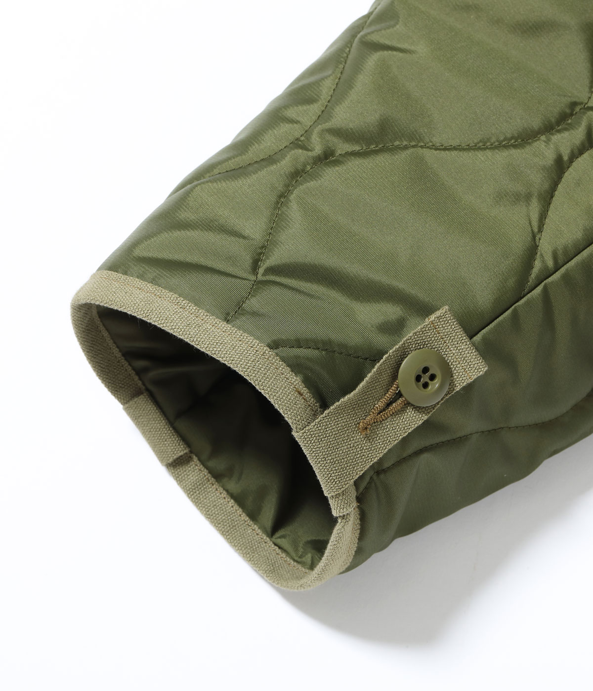 M-65 필드 자켓에는 방한성을 높이기 위해 전용 라이너가 포함되어 있습니다. 이 라이너는 충전재를 원단으로 퀼팅 처리하여, 기존 알파카나 울 소재를 사용한 라이너에 비해 가볍고 보온성이 뛰어난 것이 특징입니다. 목 부분, 소매 끝, 전면 여밈 부분에는 버튼홀이 마련되어 있으며, 이는 자켓 안쪽의 버튼과 연결하여 고정하는 방식입니다.