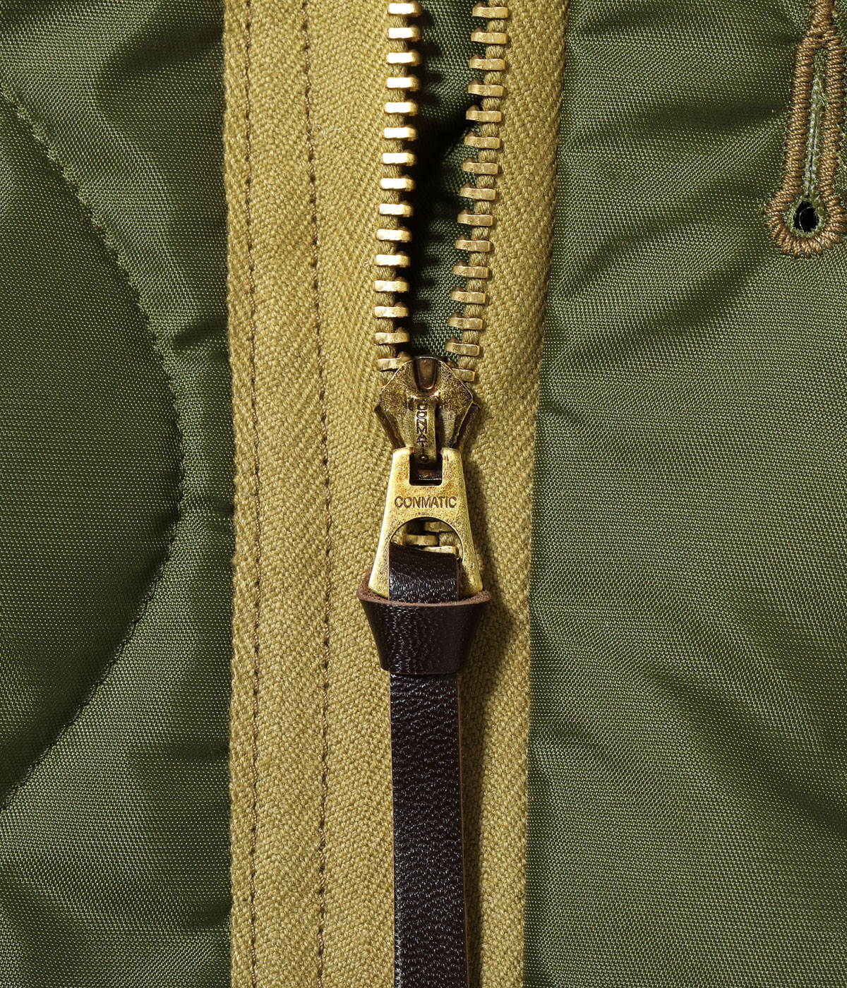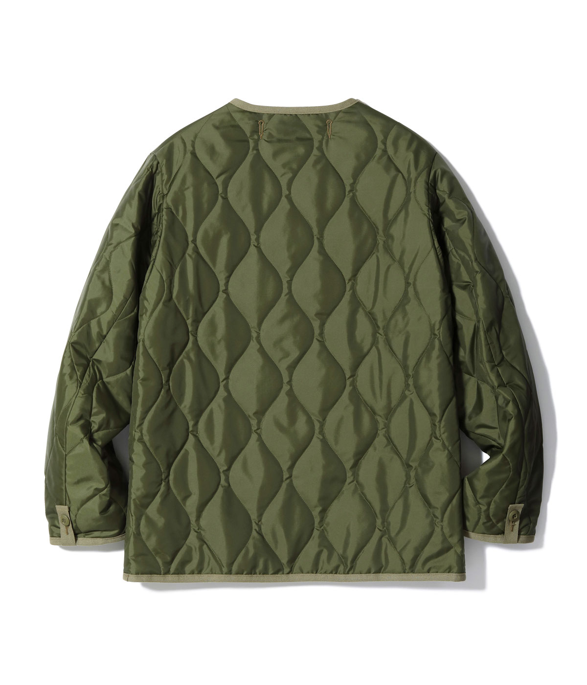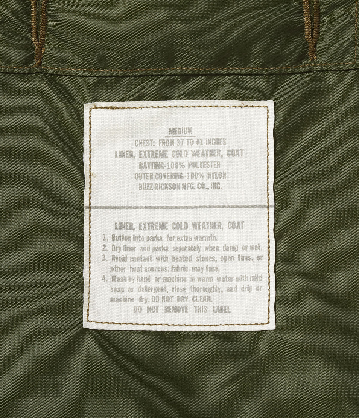 M-65 필드 자켓에는 방한성을 높이기 위해 전용 라이너가 포함되어 있습니다. 이 라이너는 충전재를 원단으로 퀼팅 처리하여, 기존 알파카나 울 소재를 사용한 라이너에 비해 가볍고 보온성이 뛰어난 것이 특징입니다. 목 부분, 소매 끝, 전면 여밈 부분에는 버튼홀이 마련되어 있으며, 이는 자켓 안쪽의 버튼과 연결하여 고정하는 방식입니다.