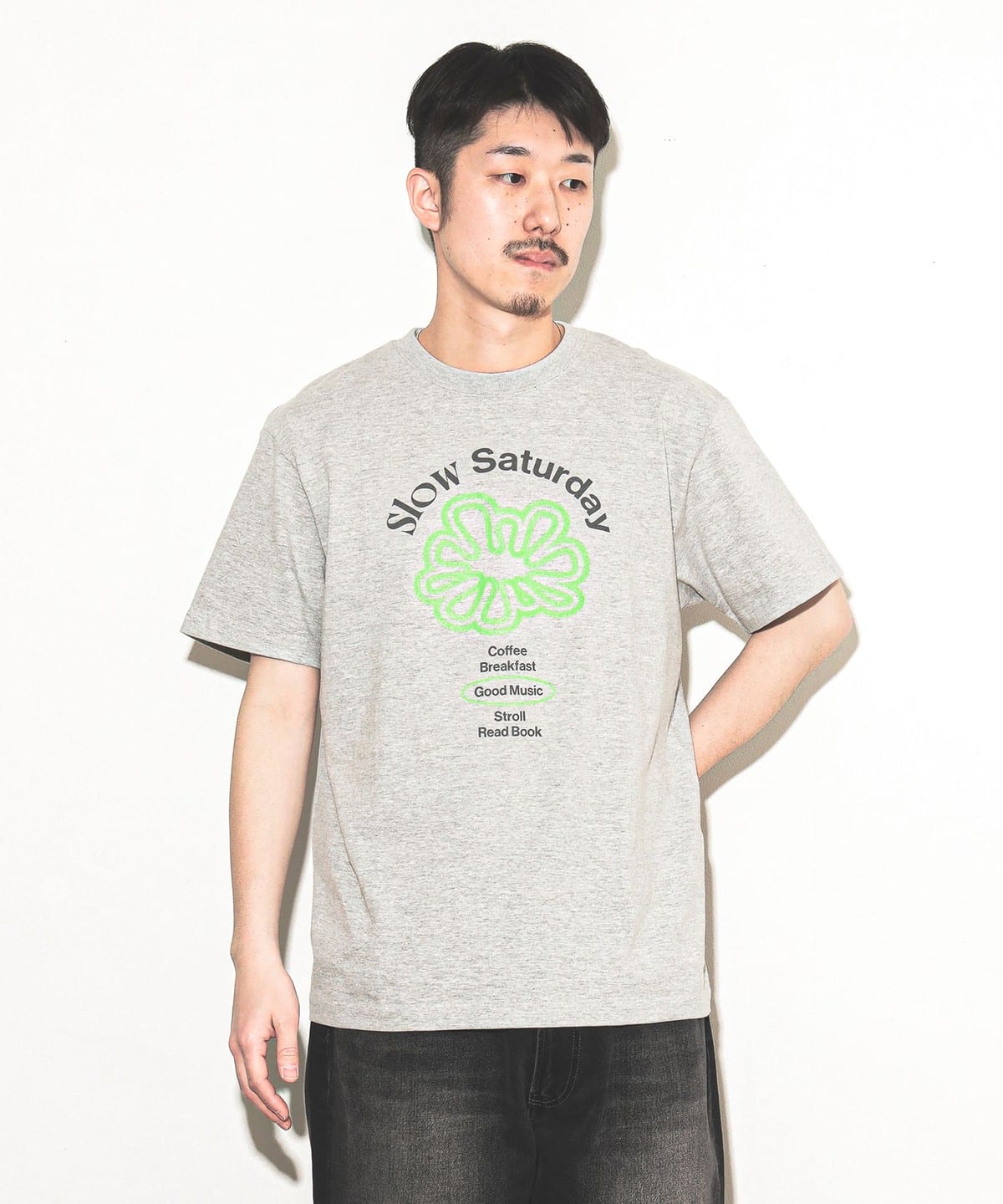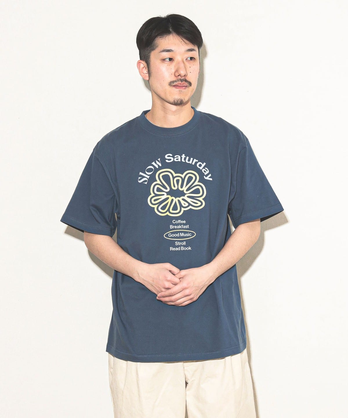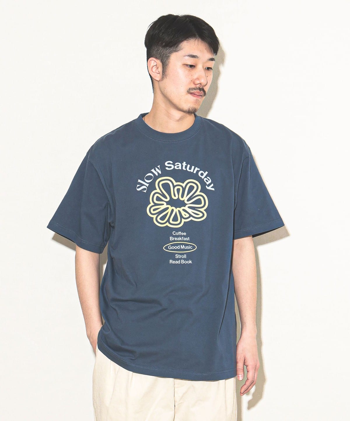 프런트에 “Slow Saturday”의 캐치한 프린트가 들어간 티셔츠