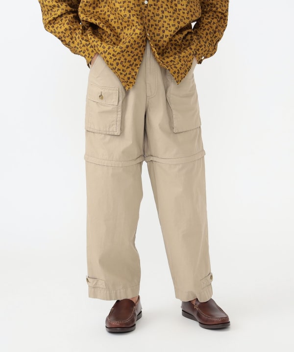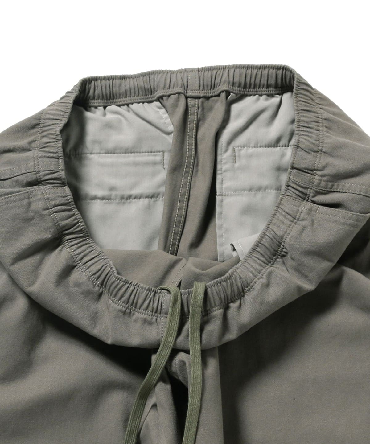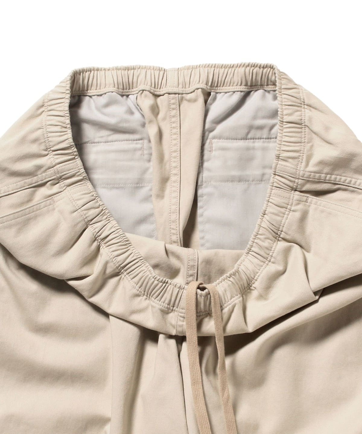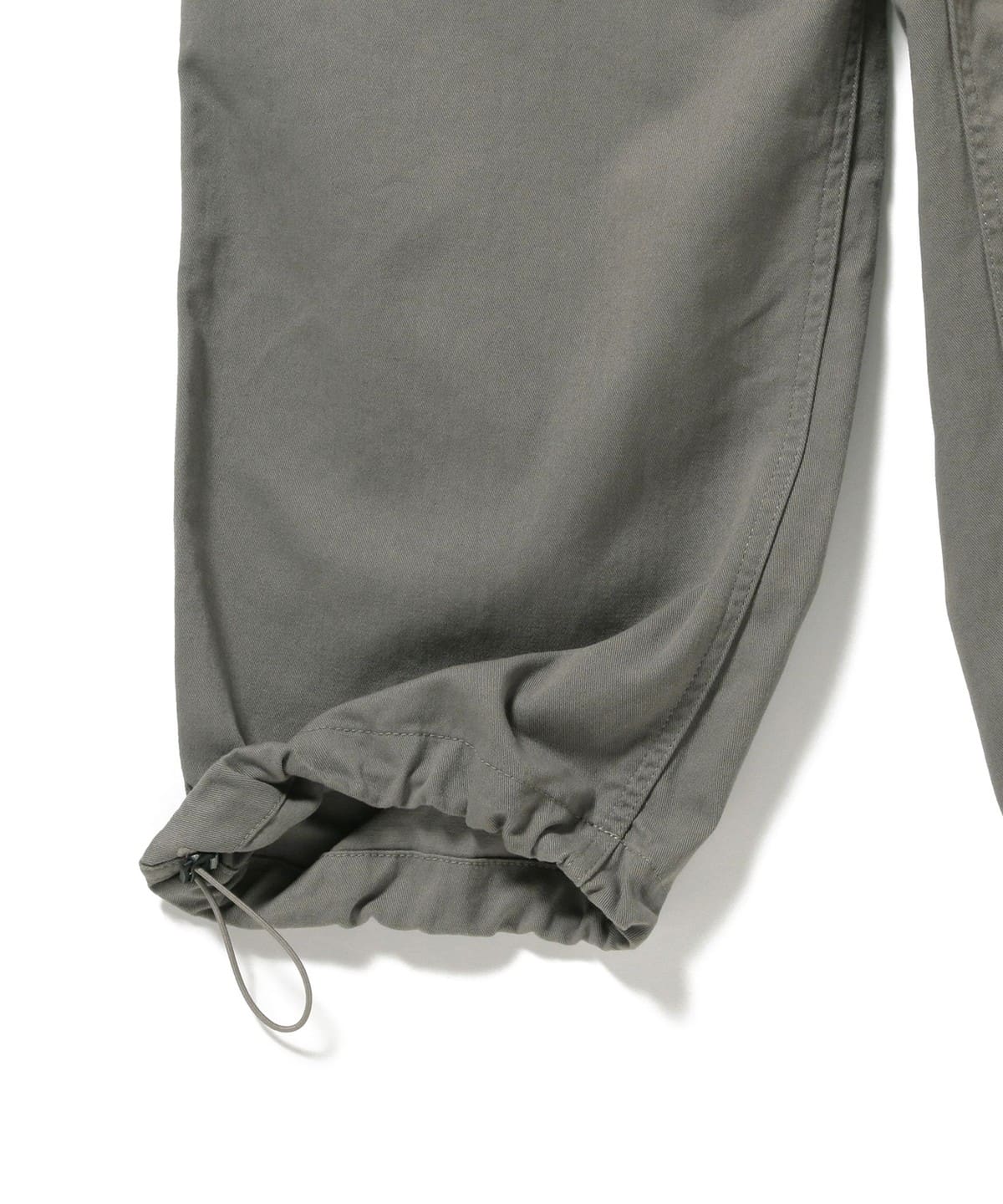 허리는 밴딩 셔링과 스트링 조절 방식으로 착용이 편리하며, 밑단은 조절 가능한 스트랩으로 실루엣을 자유롭게 변형할 수 있습니다. 뒷면 오른쪽 포켓에는 BEAMS 로고 탭을 배치하여 포인트를 더했습니다.