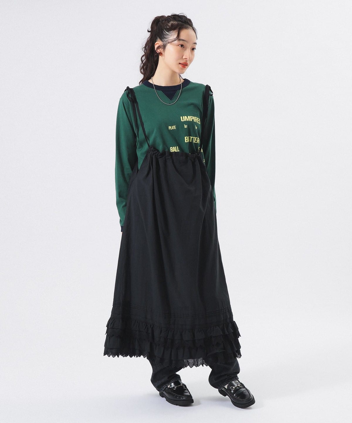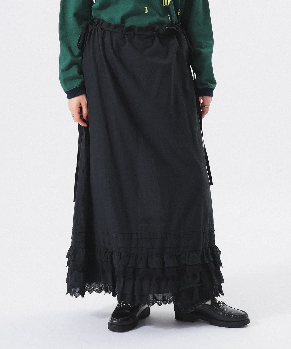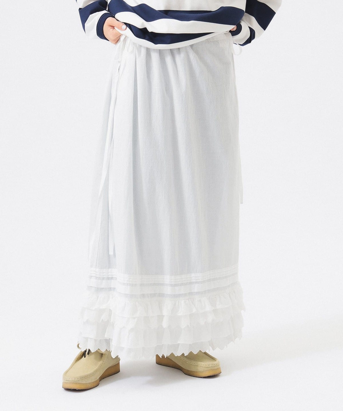 풍성한 프릴과 클래식한 텍스처가 특징인 스커트. 어깨 끈을 묶어 원피스처럼 입을 수 있습니다.