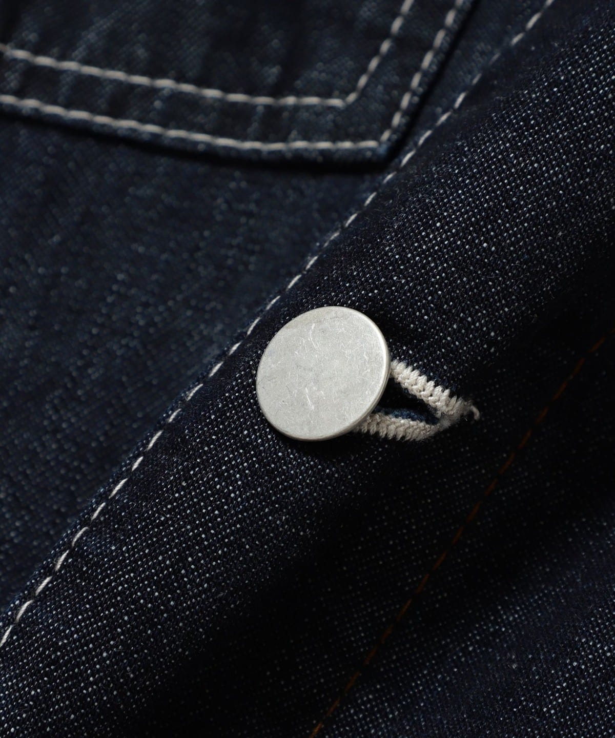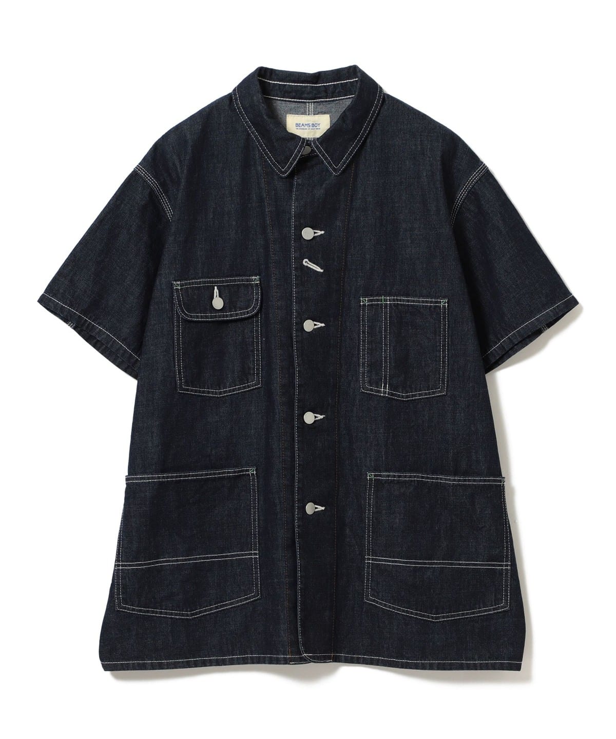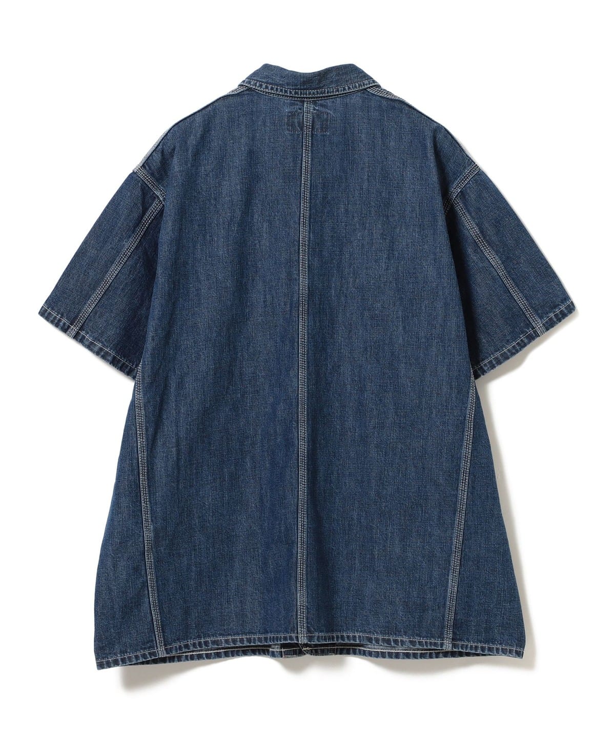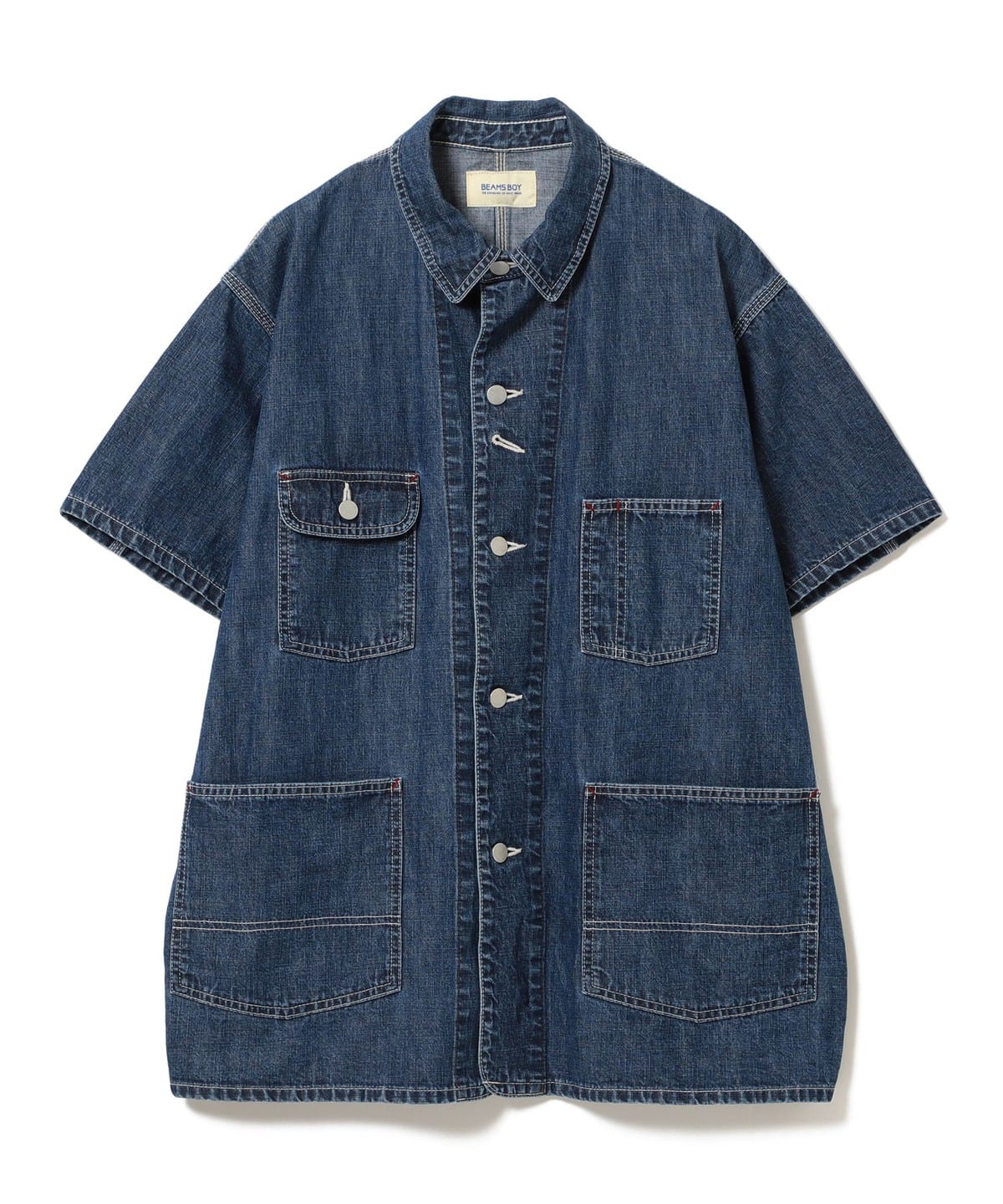 반소매 디자인의 커버올입니다. 오버사이즈 실루엣이며 버튼 수가 적고 포켓이 간소화되어 있는 디자인입니다.