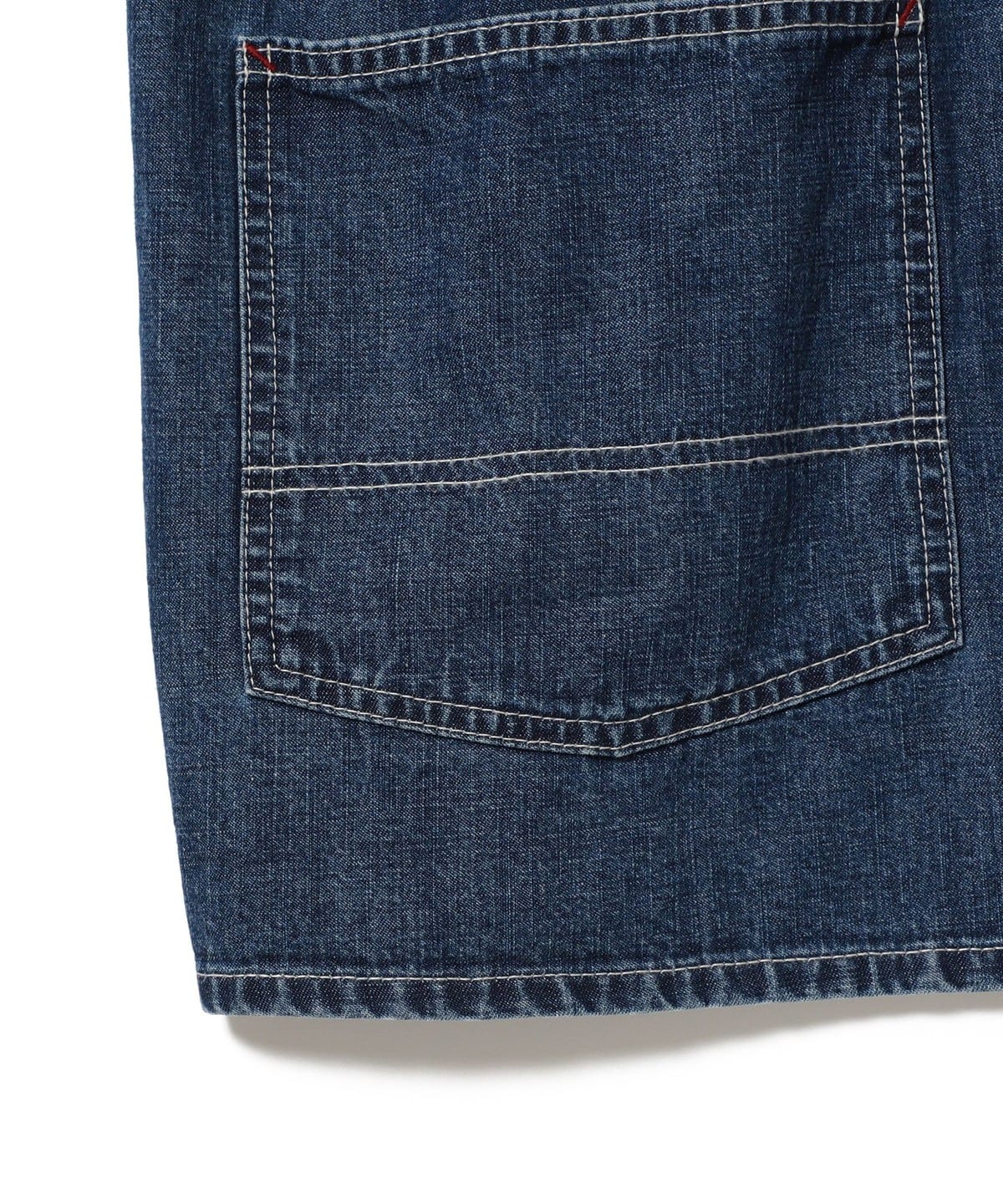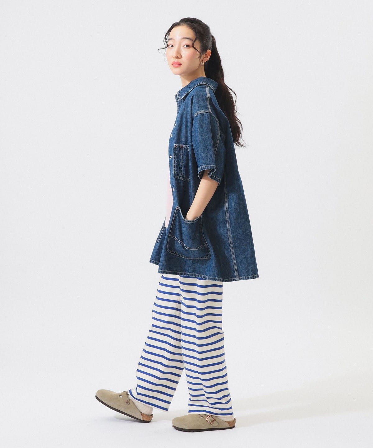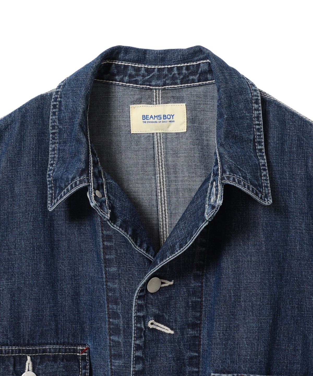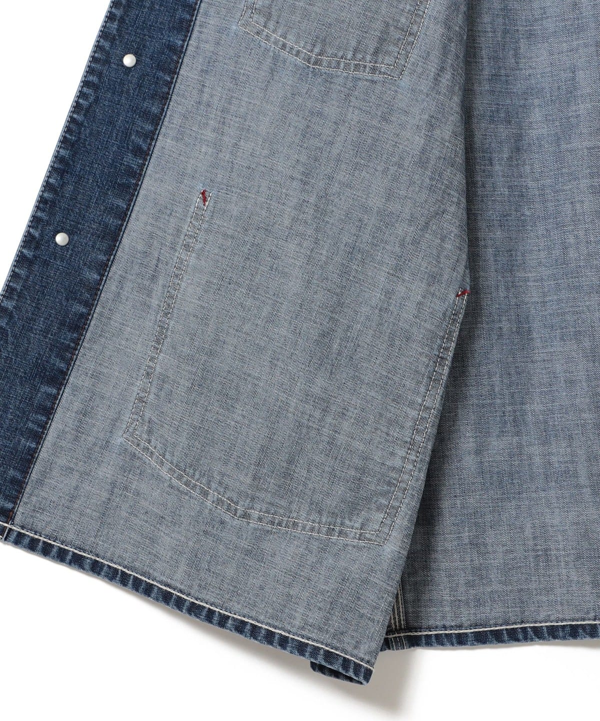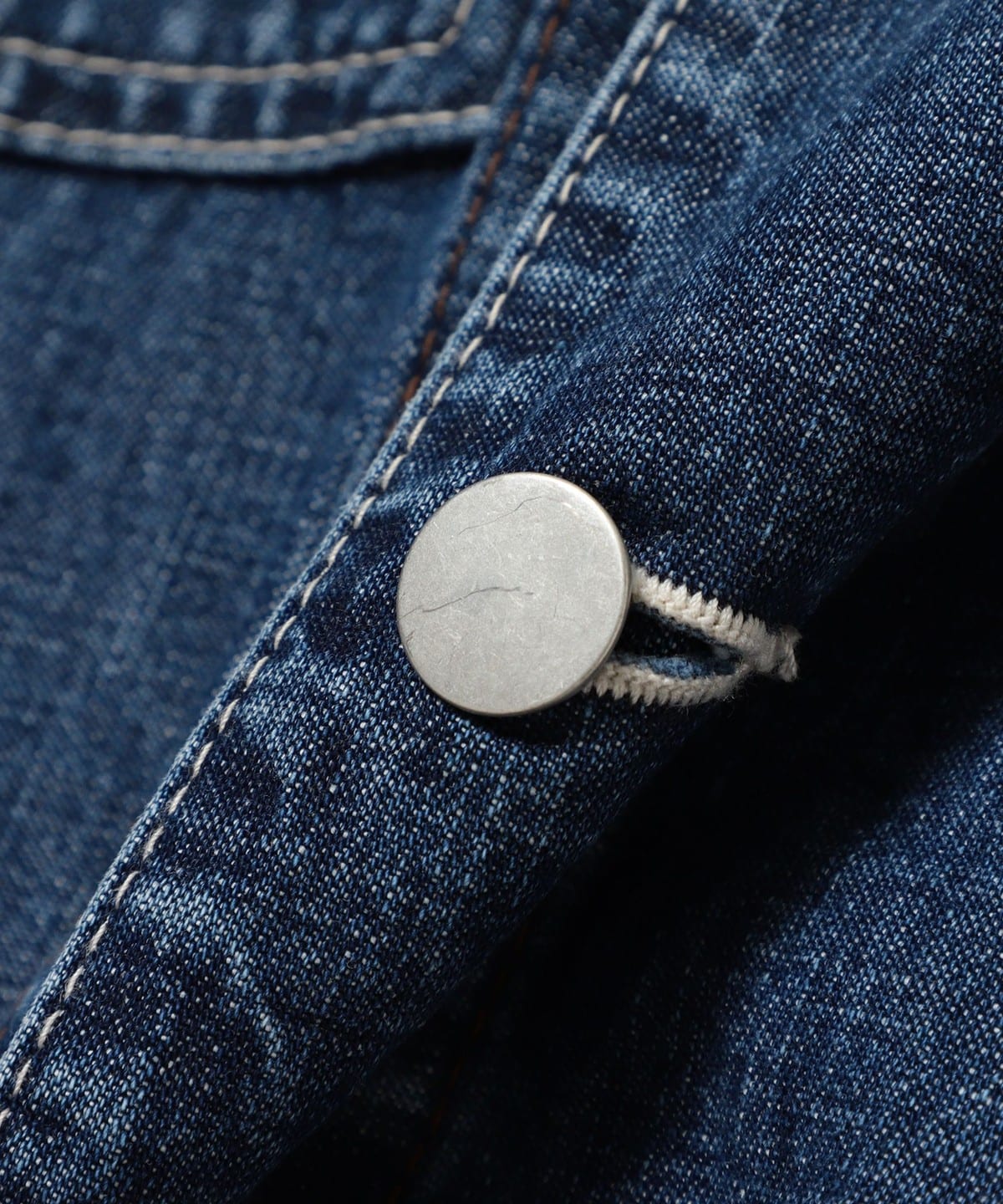 반소매 디자인의 커버올입니다. 오버사이즈 실루엣이며 버튼 수가 적고 포켓이 간소화되어 있는 디자인입니다.