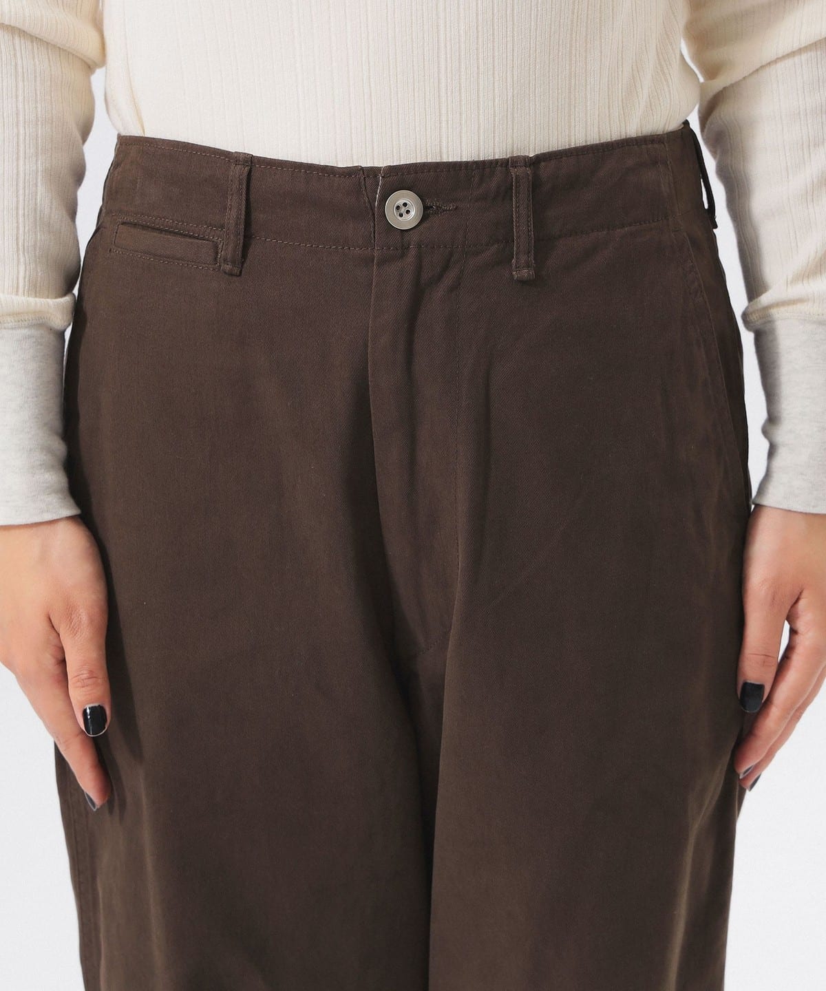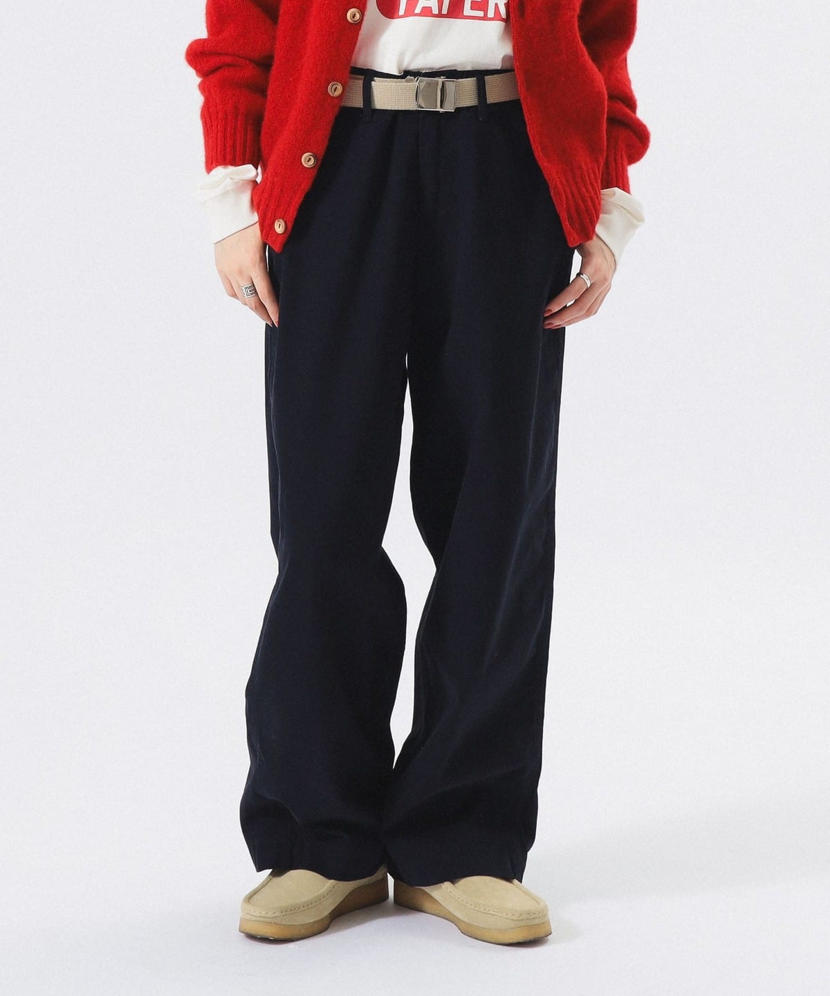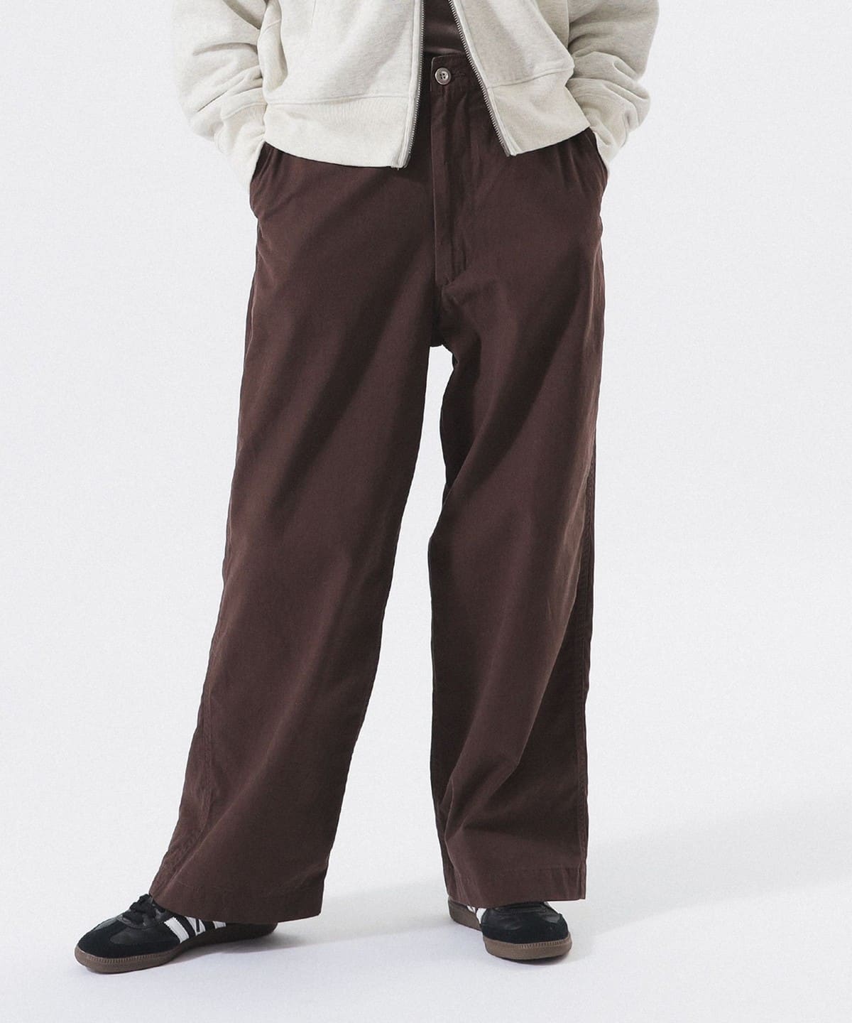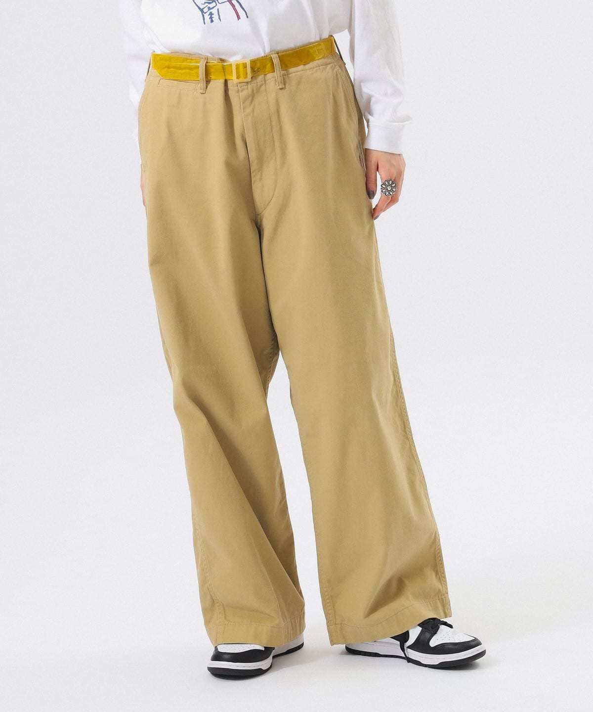 허벅지부터 밑단까지 여유 있는 와이드 스트레이트 핏의 치노 팬츠