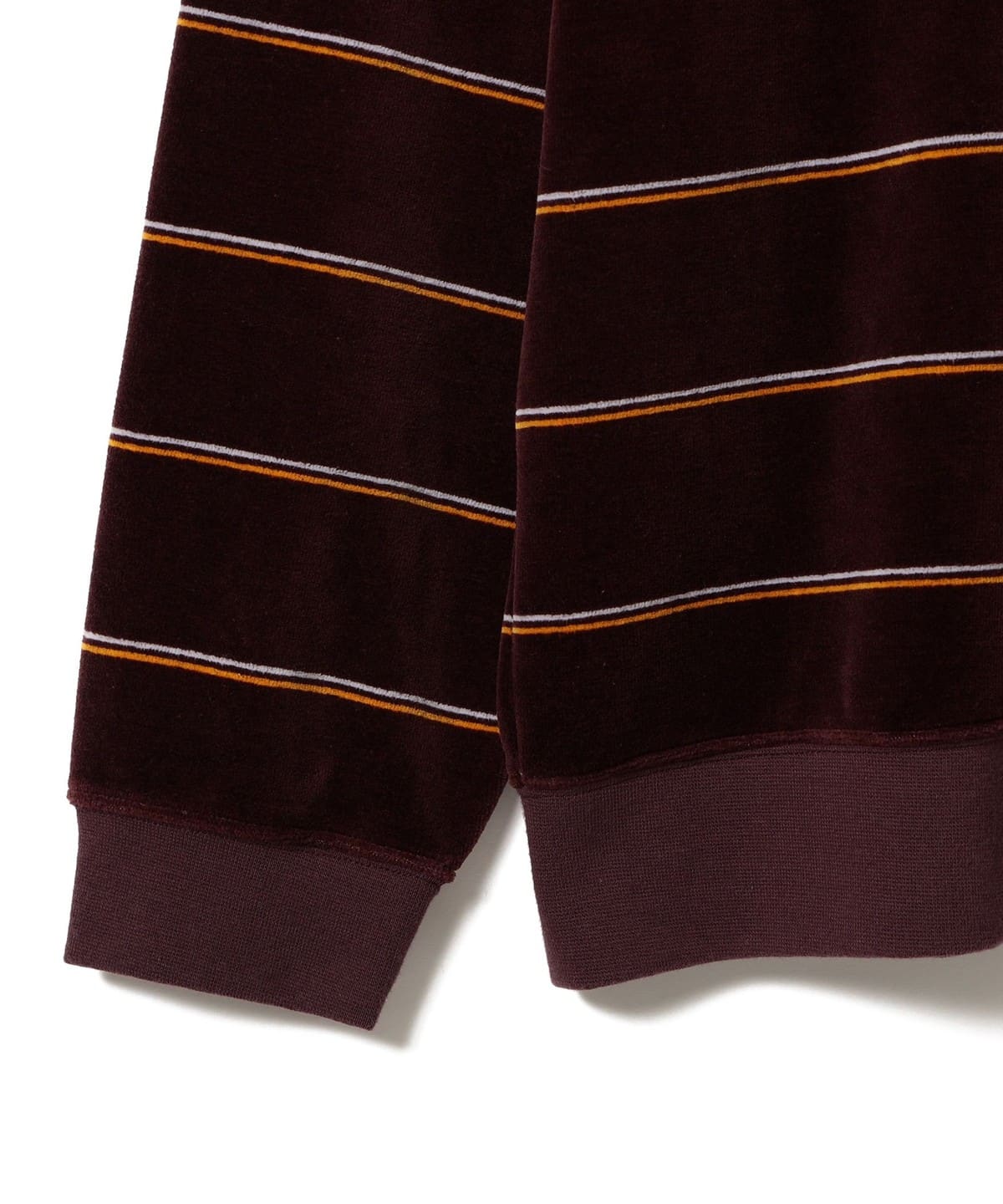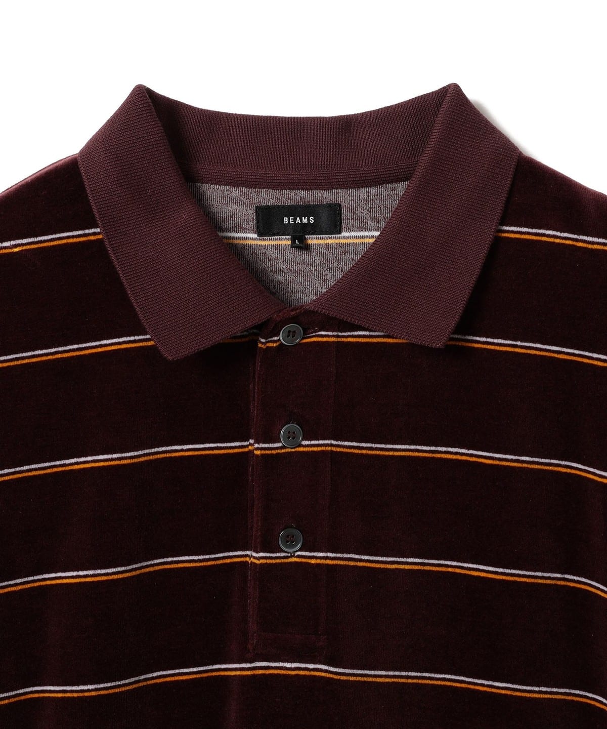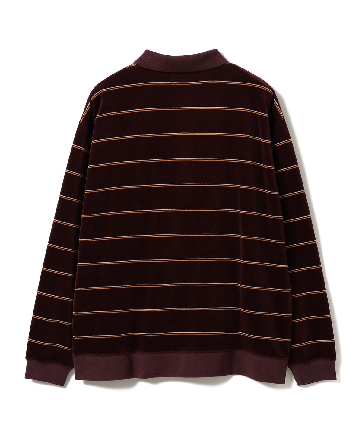 부드러운 촉감이 특징인 벨벳 소재를 사용한 스트라이프 폴로 셔츠입니다.