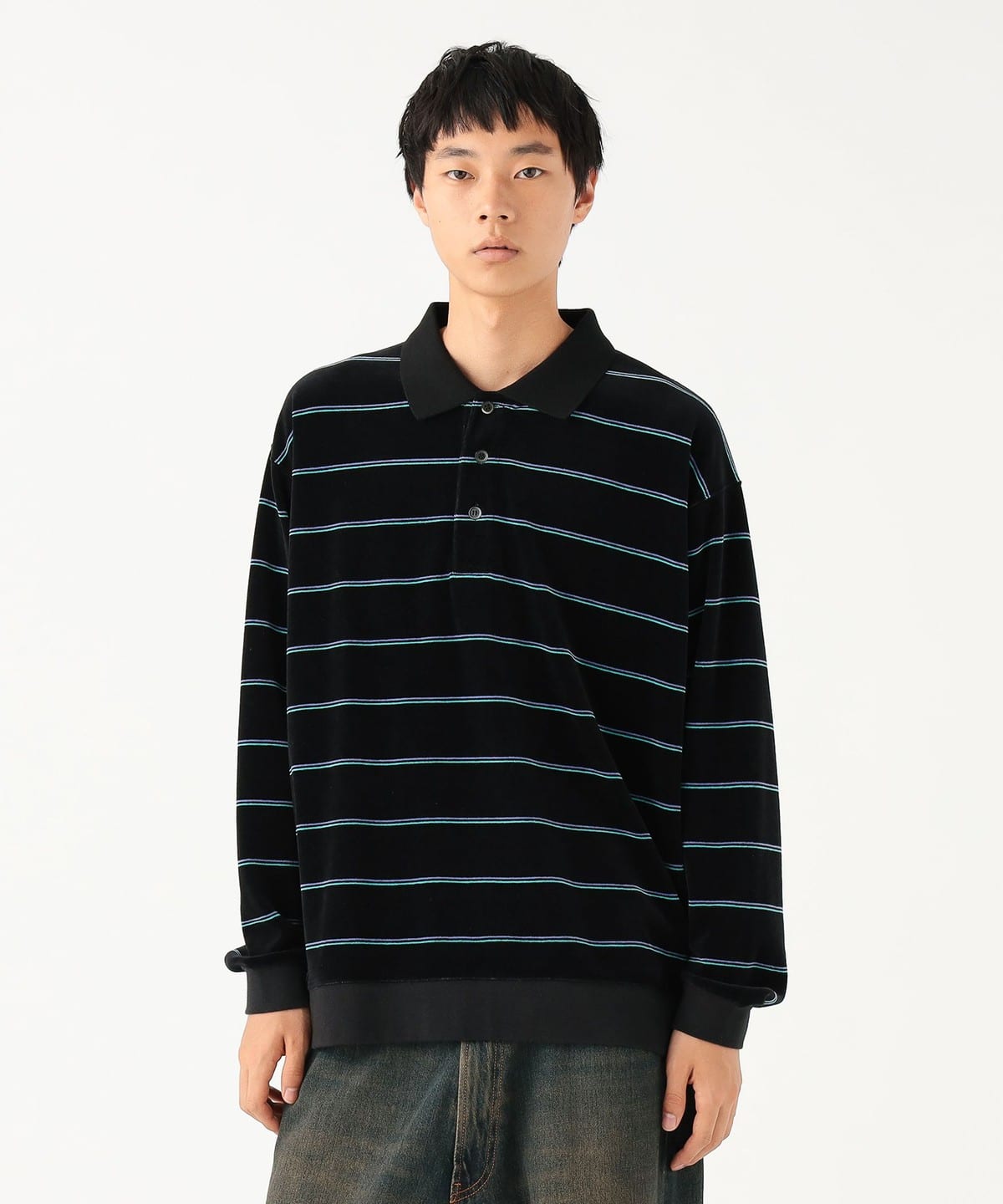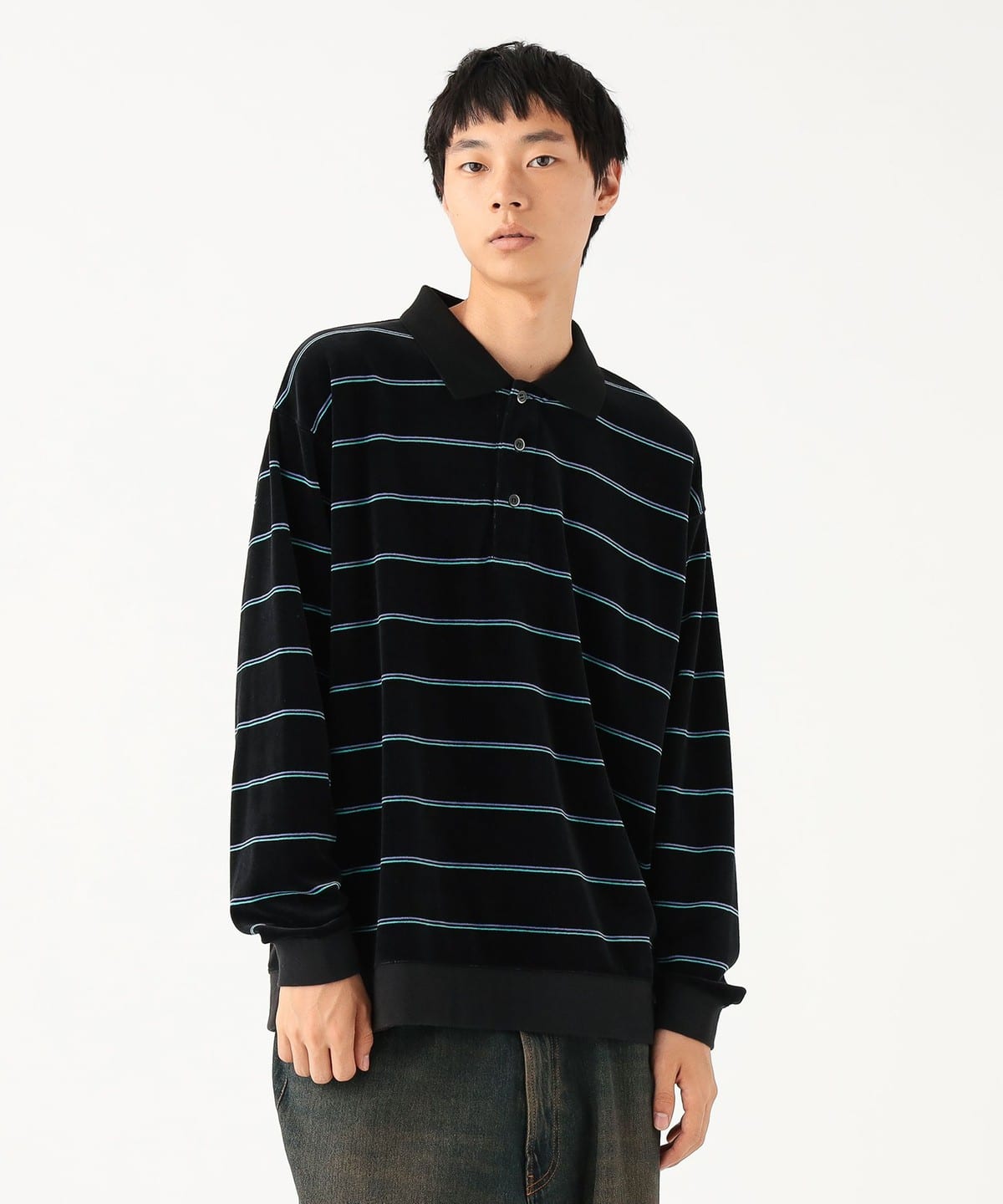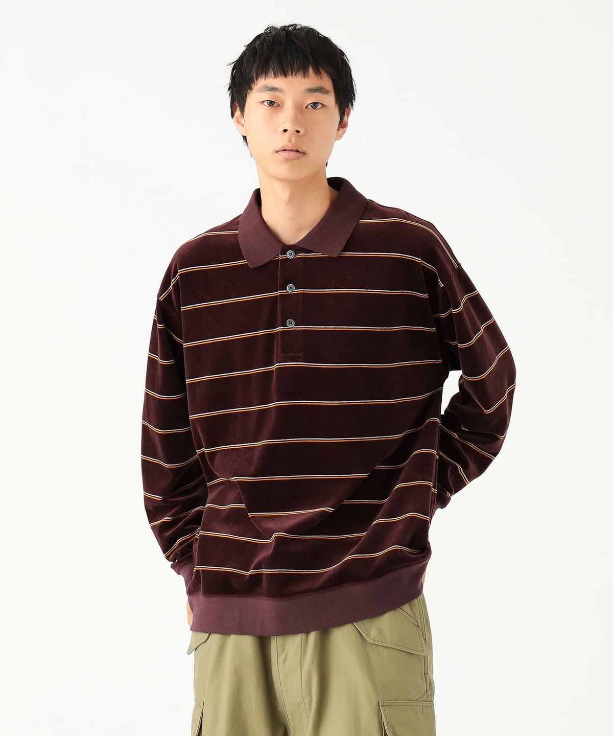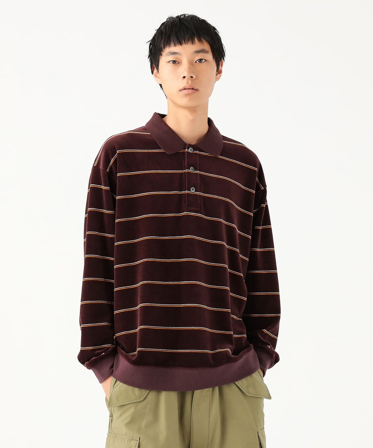 부드러운 촉감이 특징인 벨벳 소재를 사용한 스트라이프 폴로 셔츠입니다.
