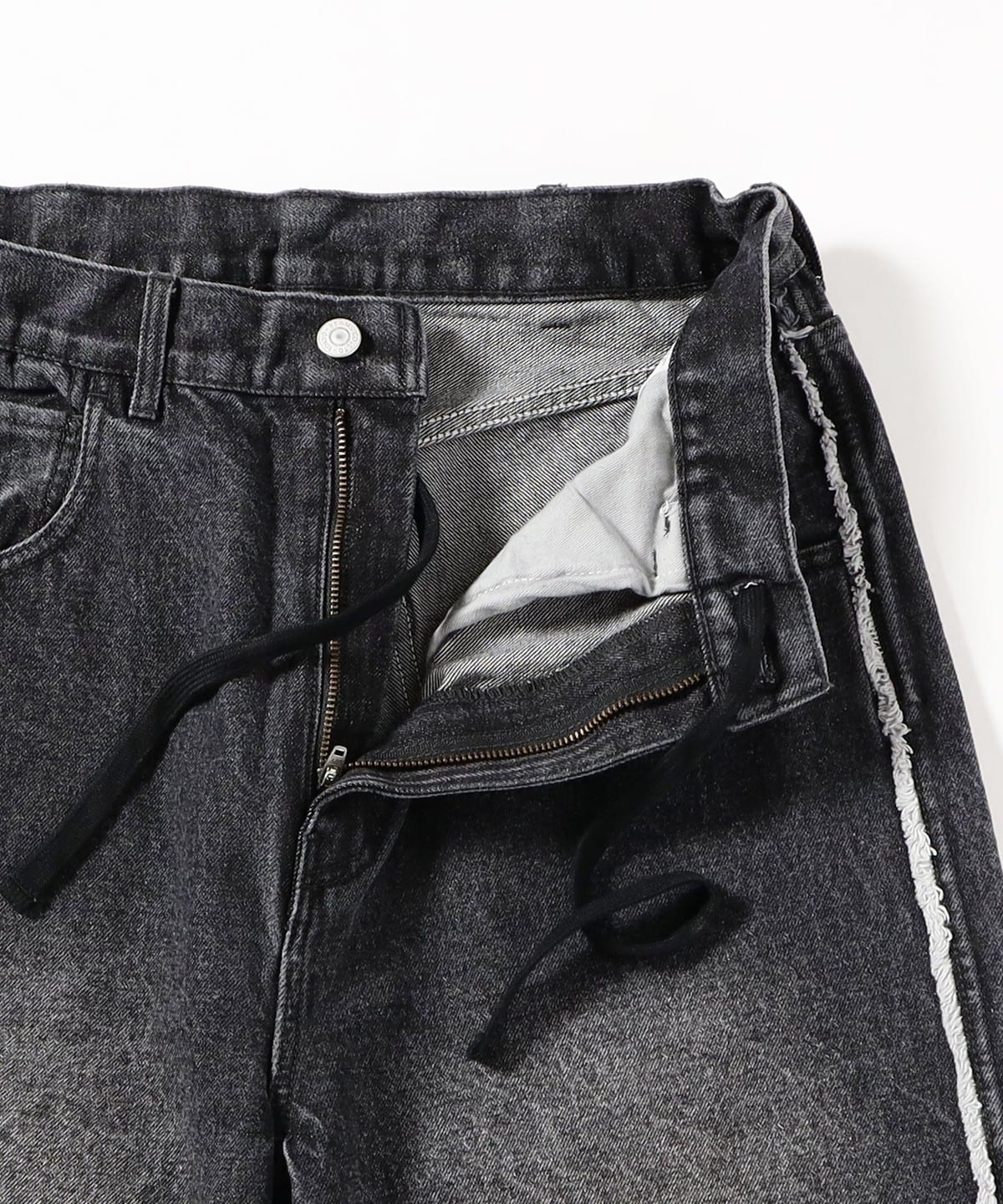 옆선에 존재감을 더하는 프린지를 장식한 와이드 실루엣의 5포켓 데님 팬츠입니다. 허리 안쪽에 드로스트링이 있어, 벨트 없이도 허리 사이즈를 조절할 수 있는 실용적인 구조입니다.