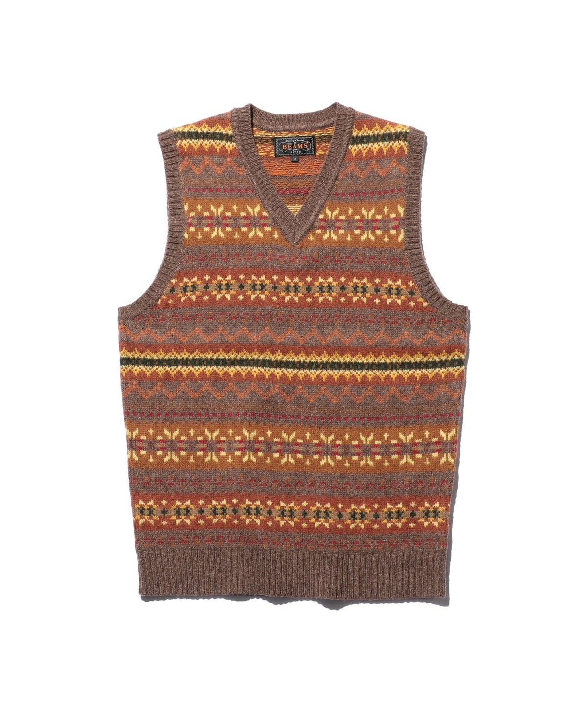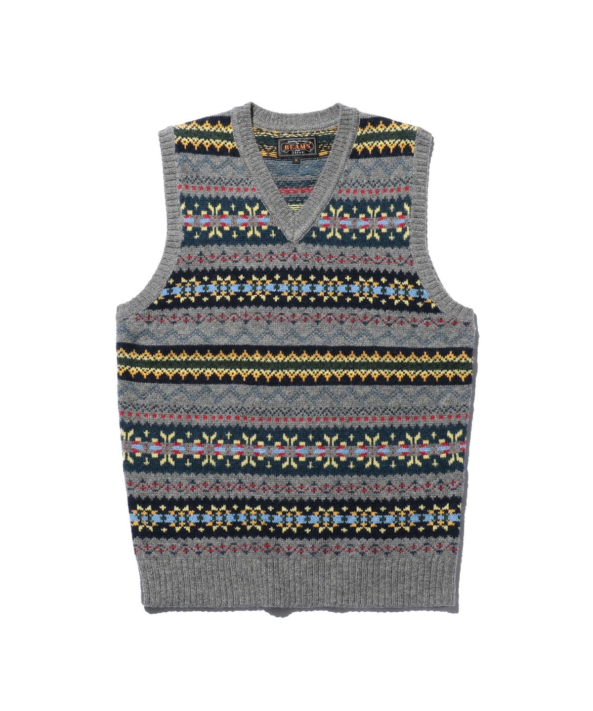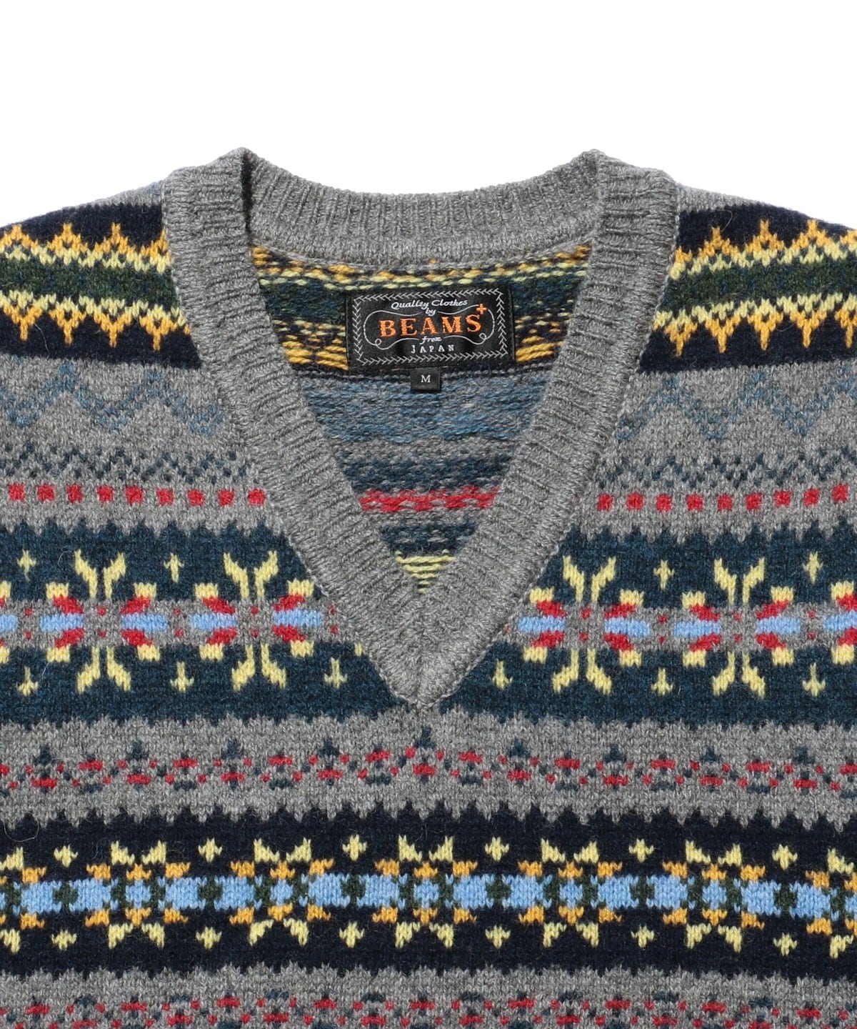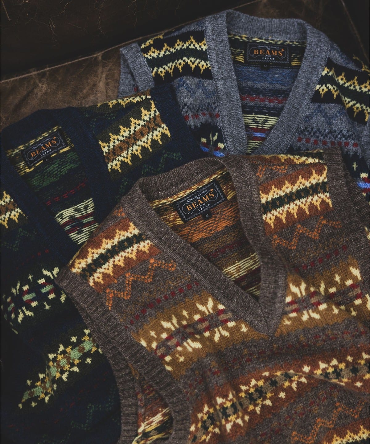 BEAMS PLUS의 클래식 감성을 담은 페어아일 패턴 V넥 니트 베스트 입니다.
