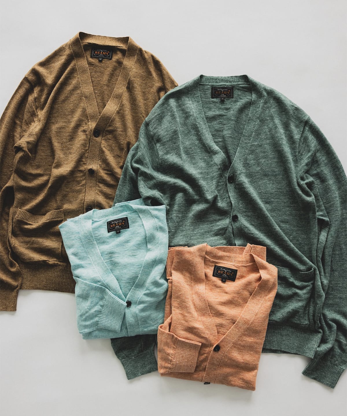 촉촉하고 산뜻한 터치감이 특징인 린넨 니트 가디건입니다. BEAMS PLUS가 독자적으로 개발한 실을 사용하고, 표면에는 단백질 가공 처리를 통해 부드러운 착용감을 완성했습니다.