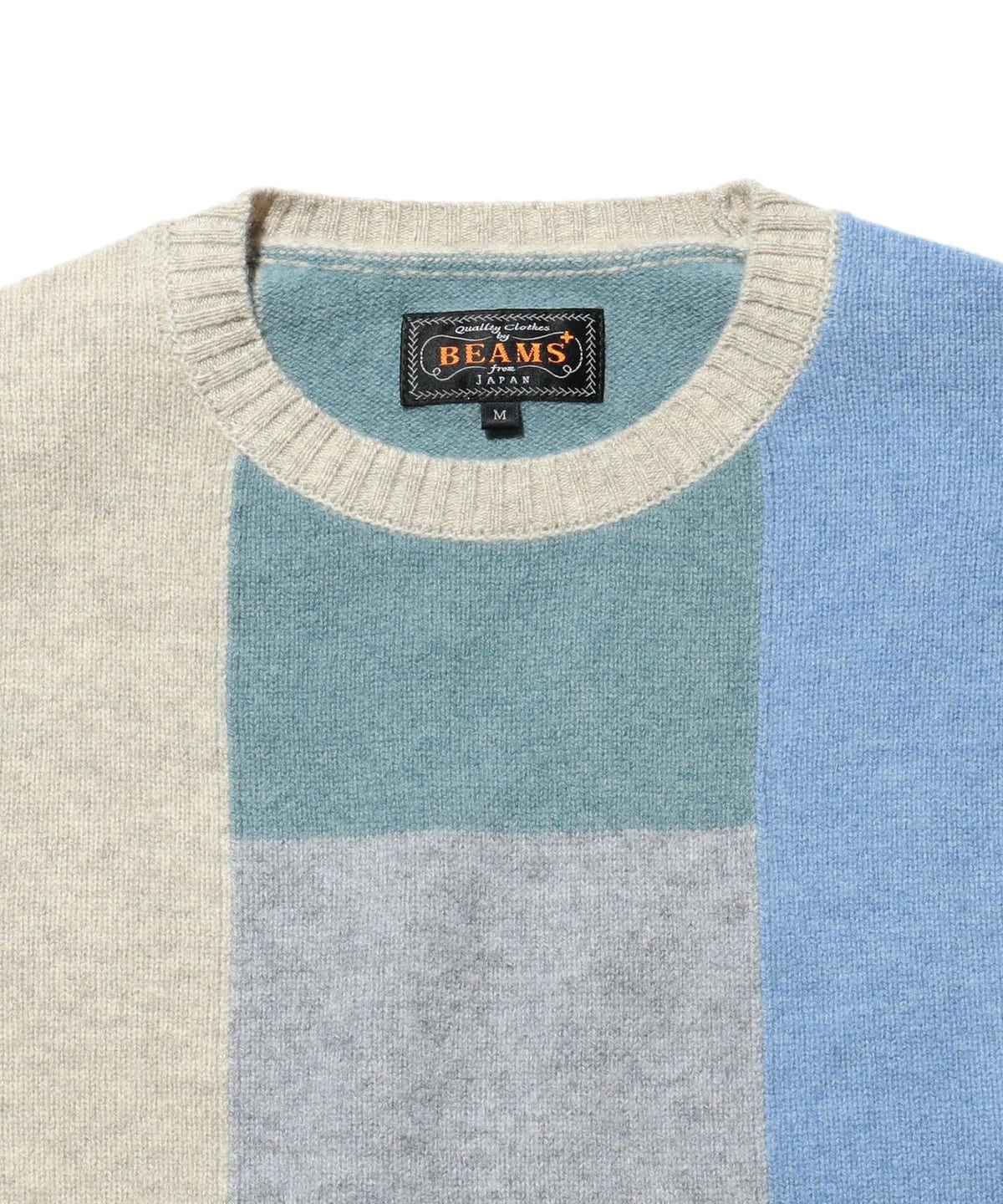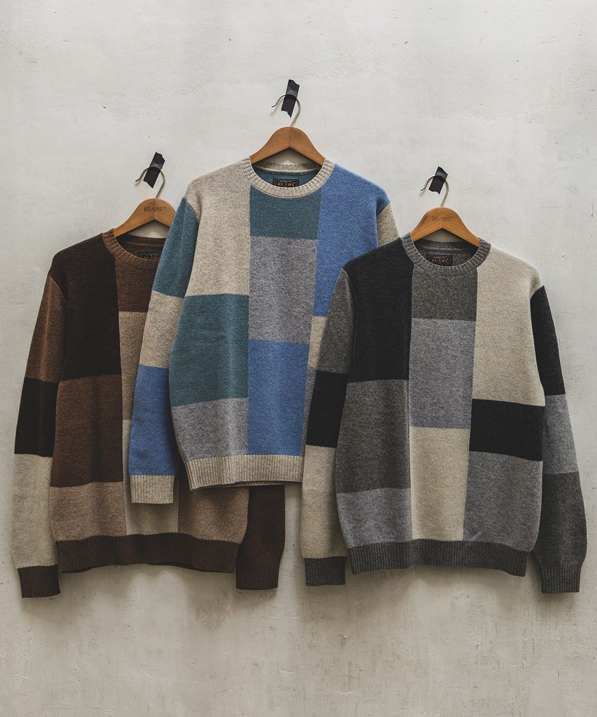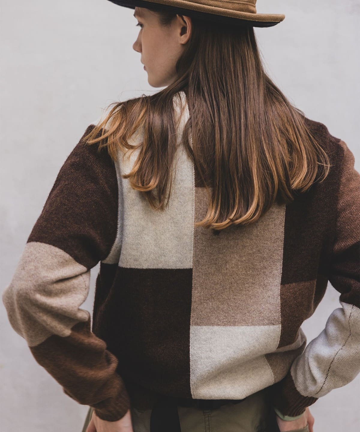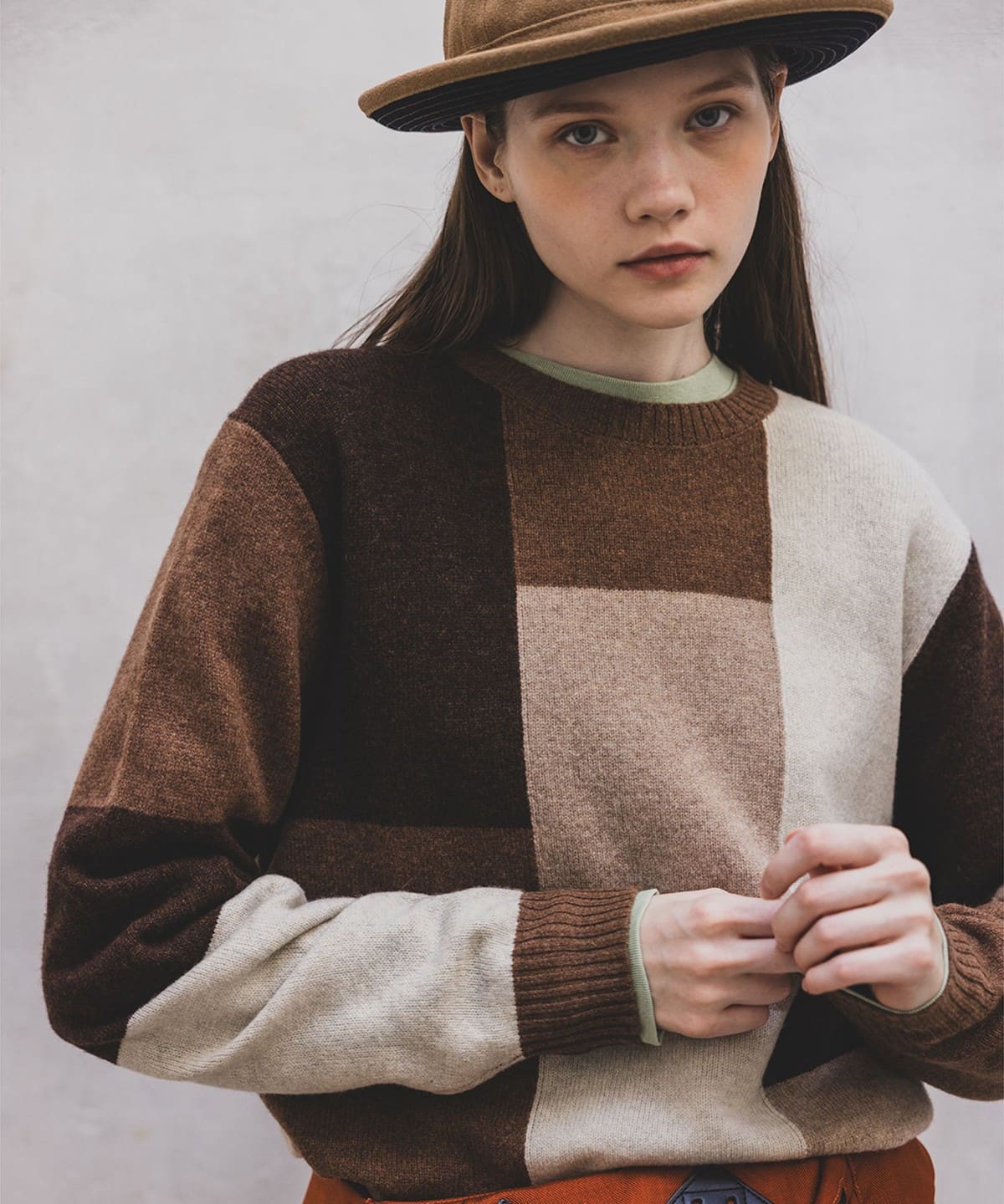 컬러 블록 디자인의 울 니트. 깔끔한 편직과 선명한 대비가 돋보이는 인트라시아 편직을 사용합니다.