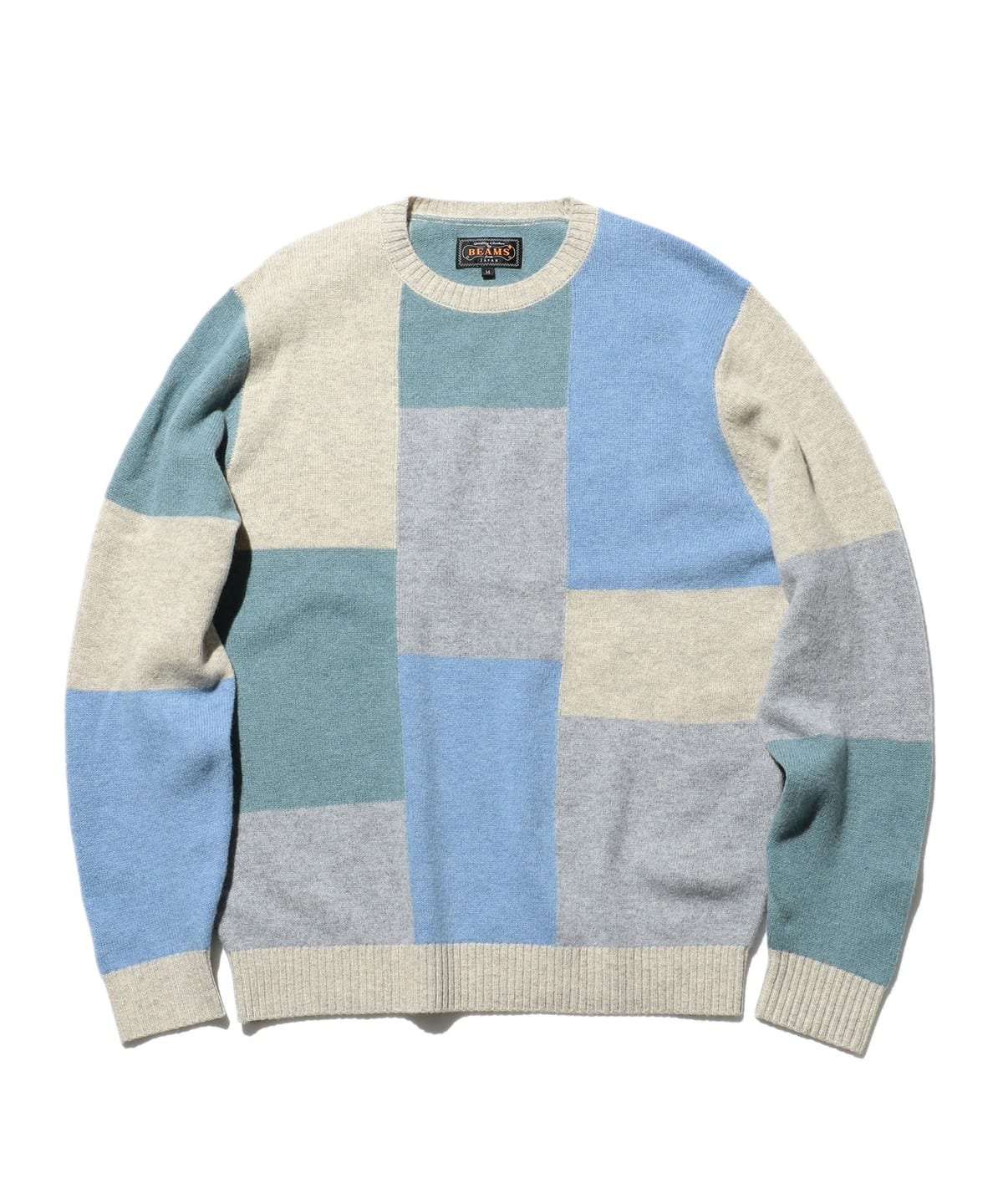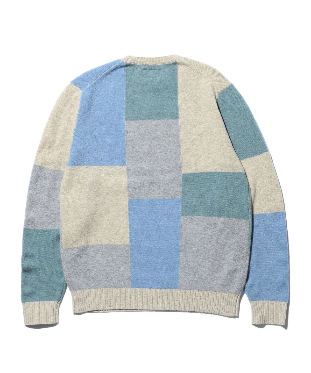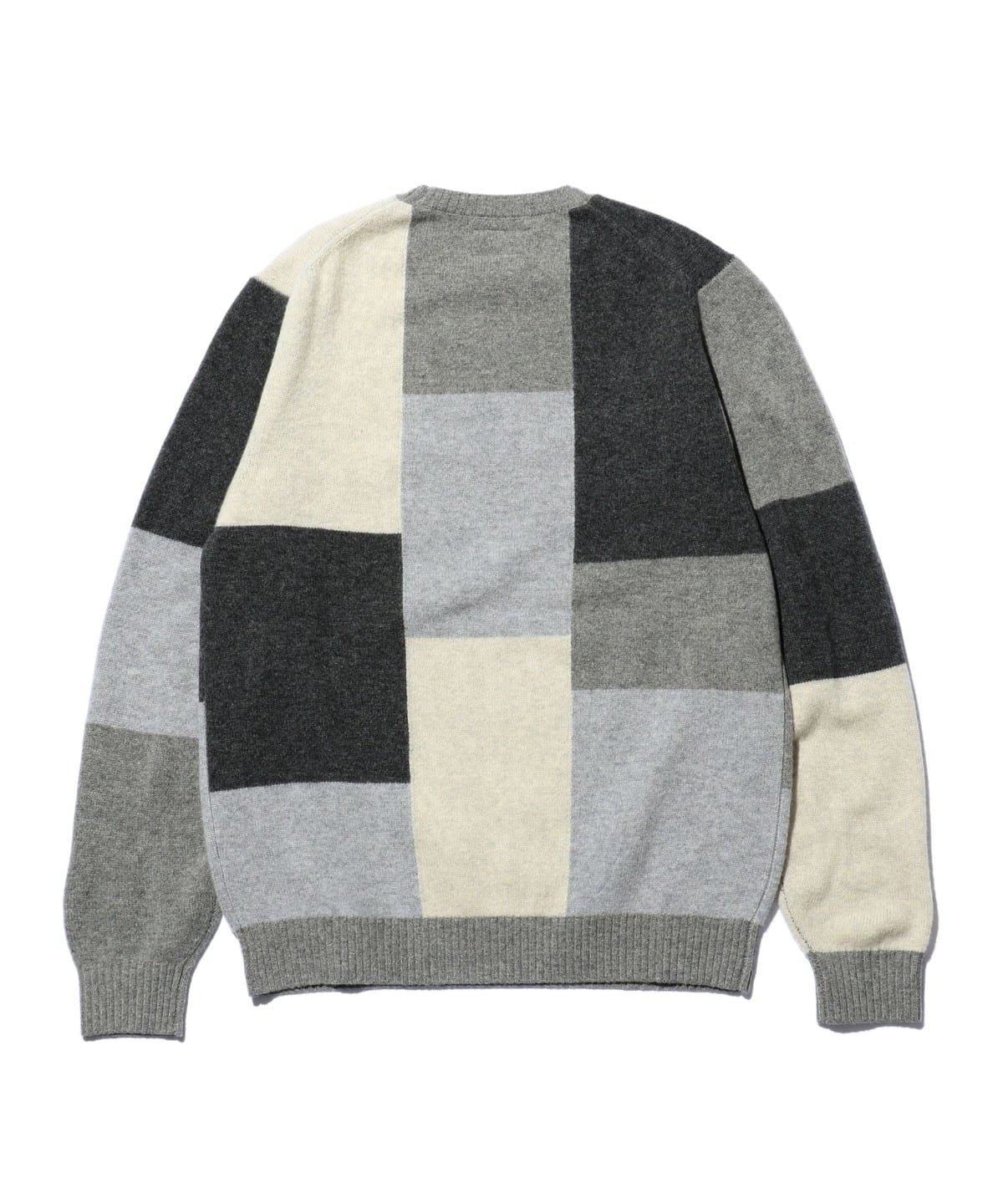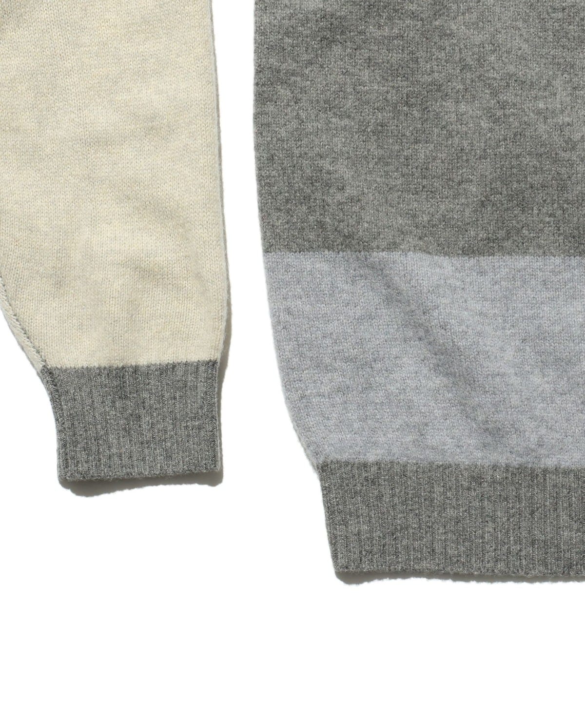 컬러 블록 디자인의 울 니트. 깔끔한 편직과 선명한 대비가 돋보이는 인트라시아 편직을 사용합니다.