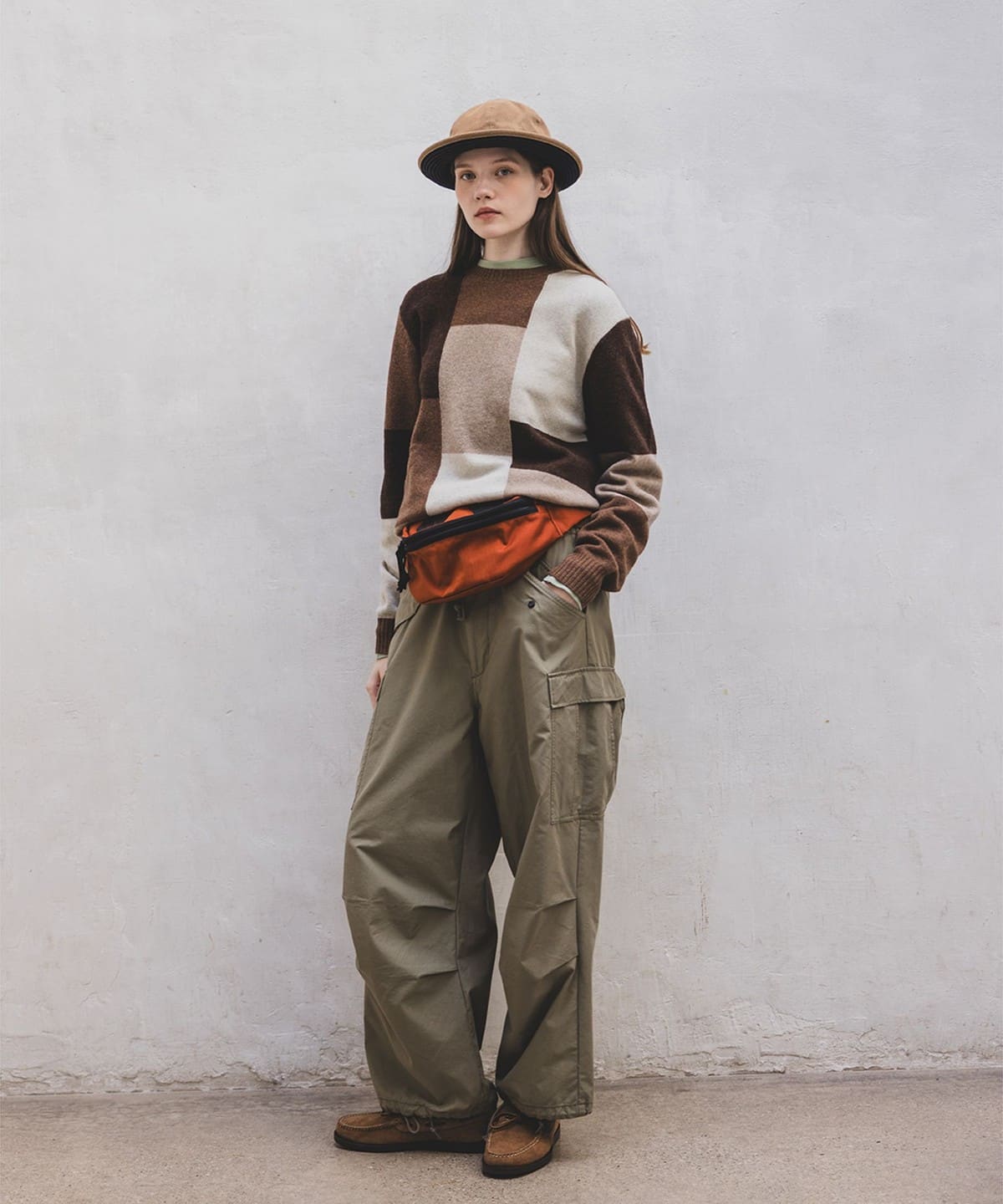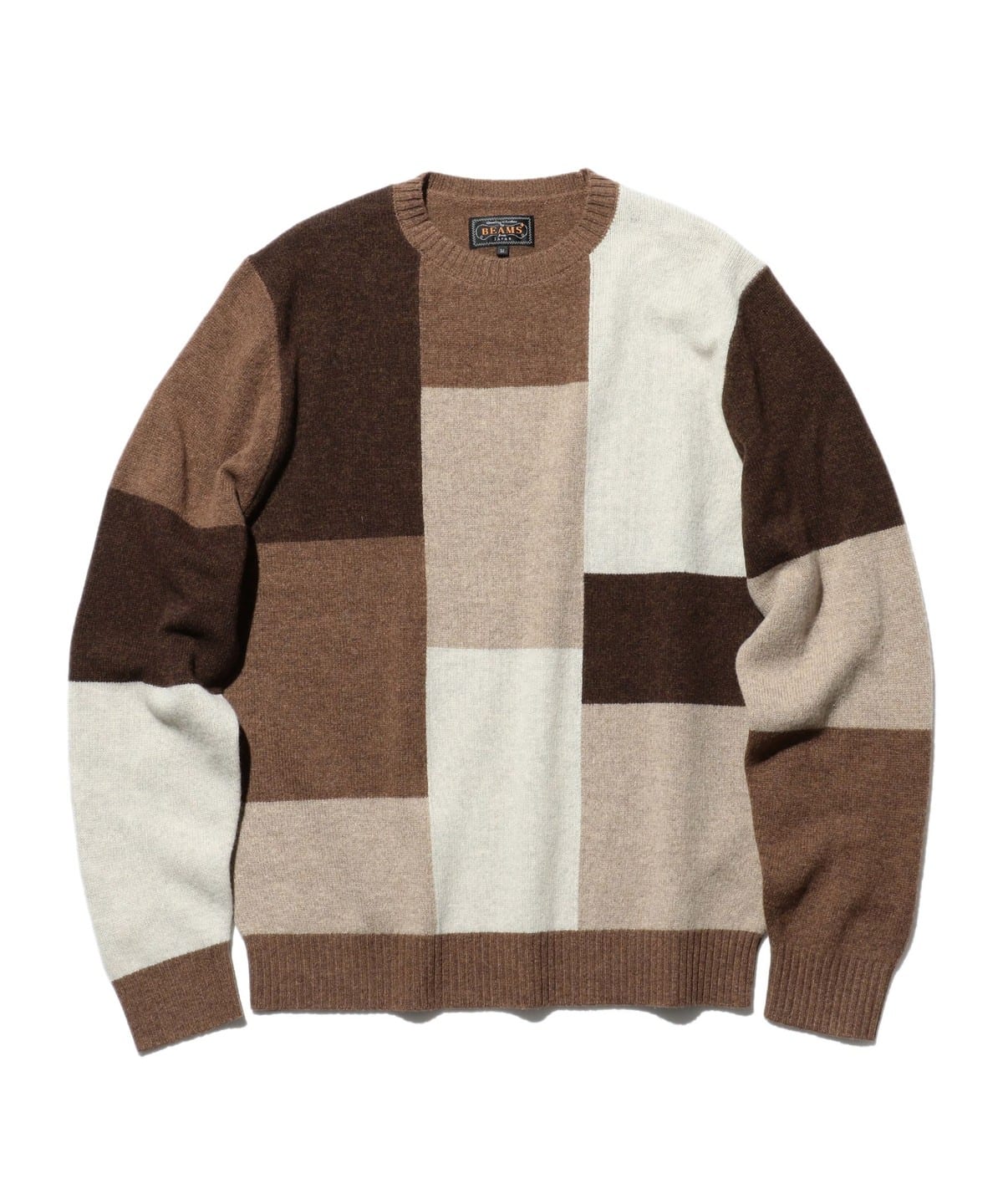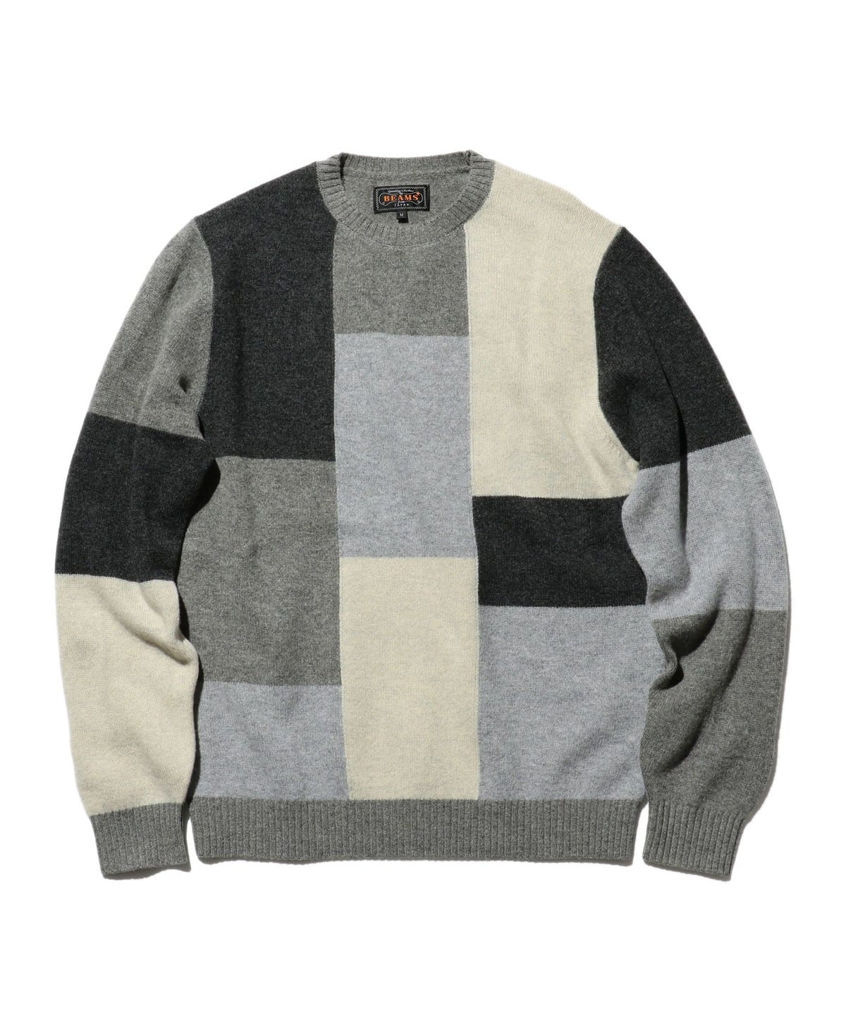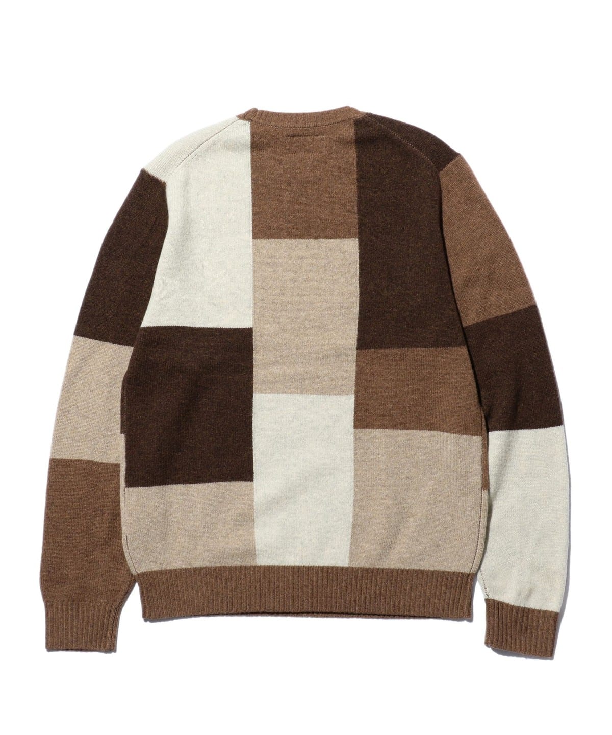 컬러 블록 디자인의 울 니트. 깔끔한 편직과 선명한 대비가 돋보이는 인트라시아 편직을 사용합니다.