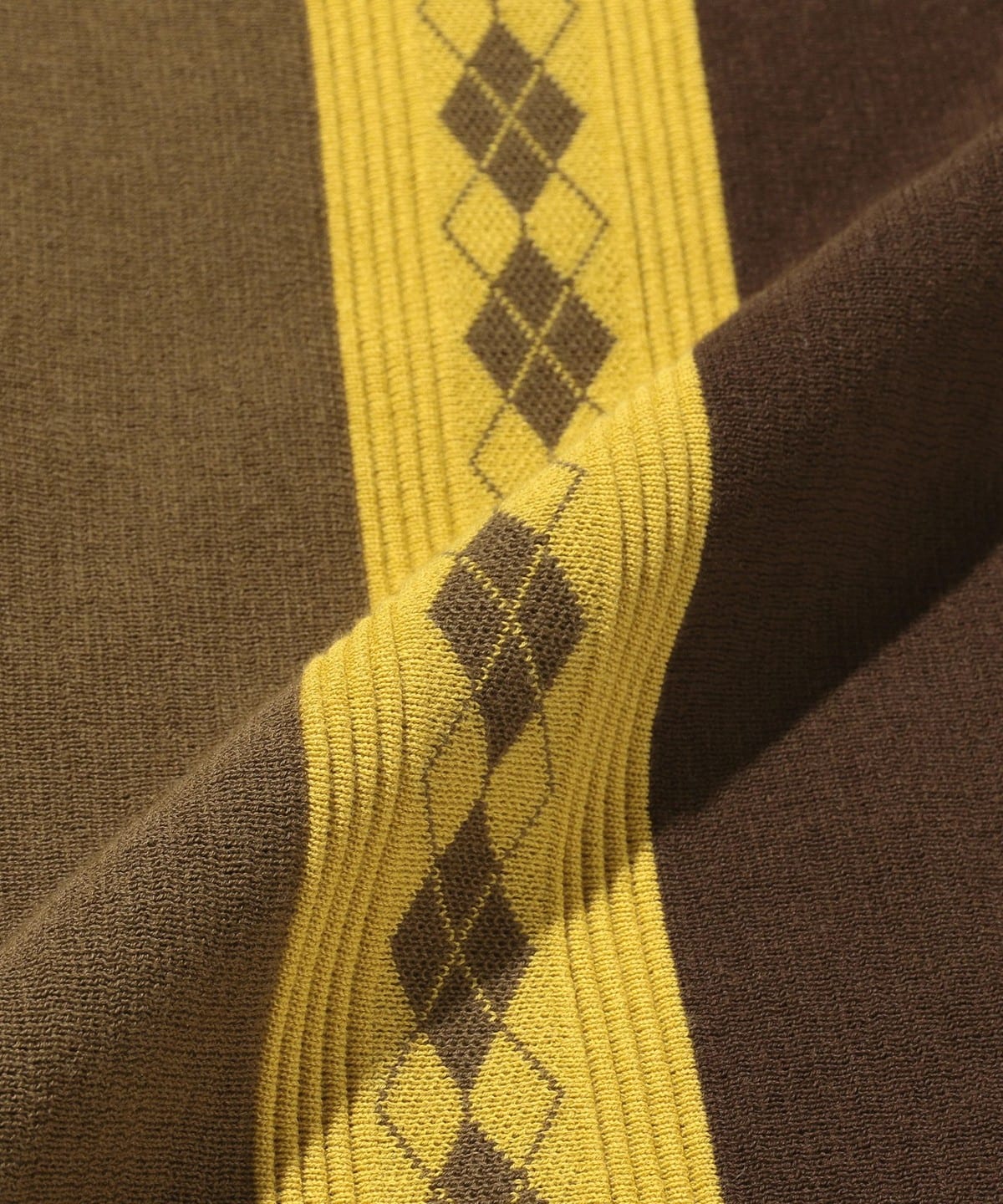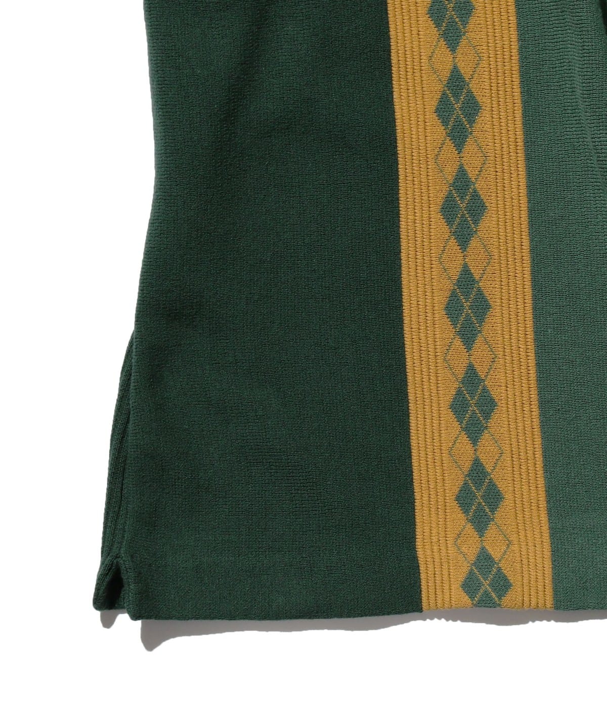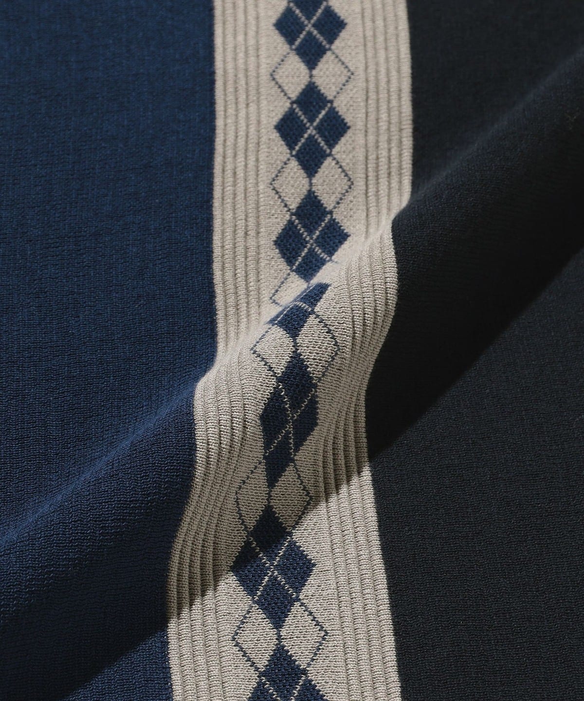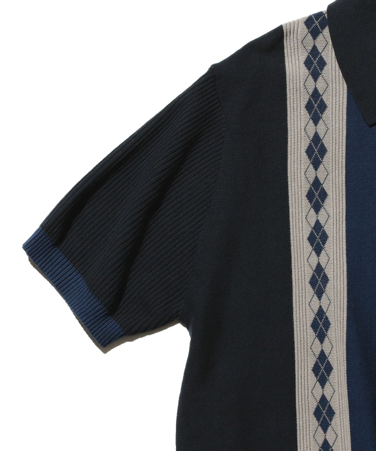 전면에는 스트라이프 패턴 안에 아가일 무늬를 섬세하게 배치 한 클래식한 니트 폴로 셔츠.