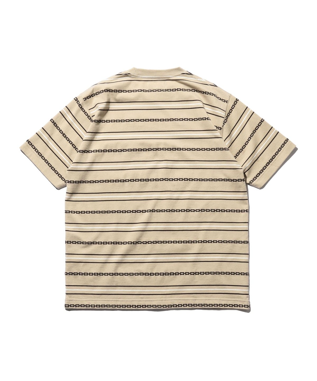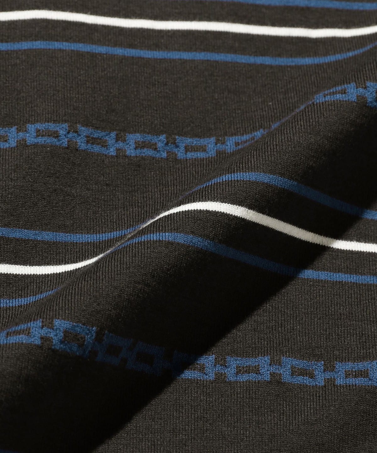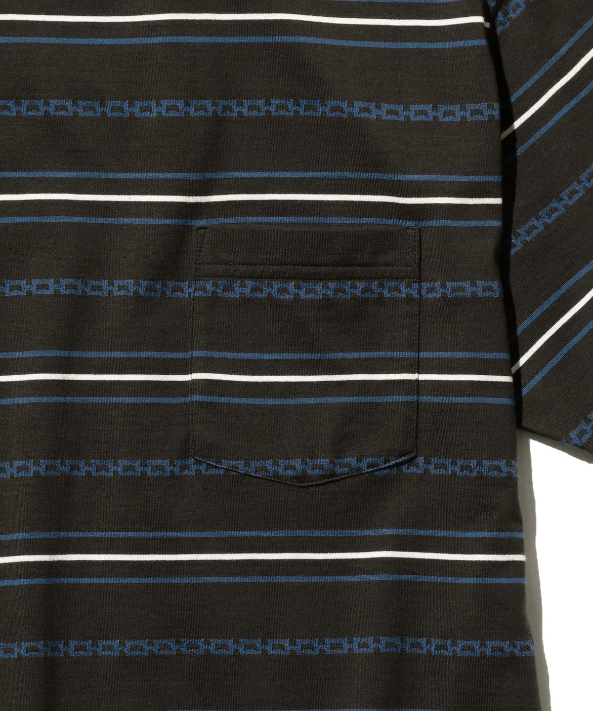 자카드 조직 특유의 섬세한 무늬와 보더 스트라이프가 절묘하게 어우러진 포켓 티셔츠입니다.