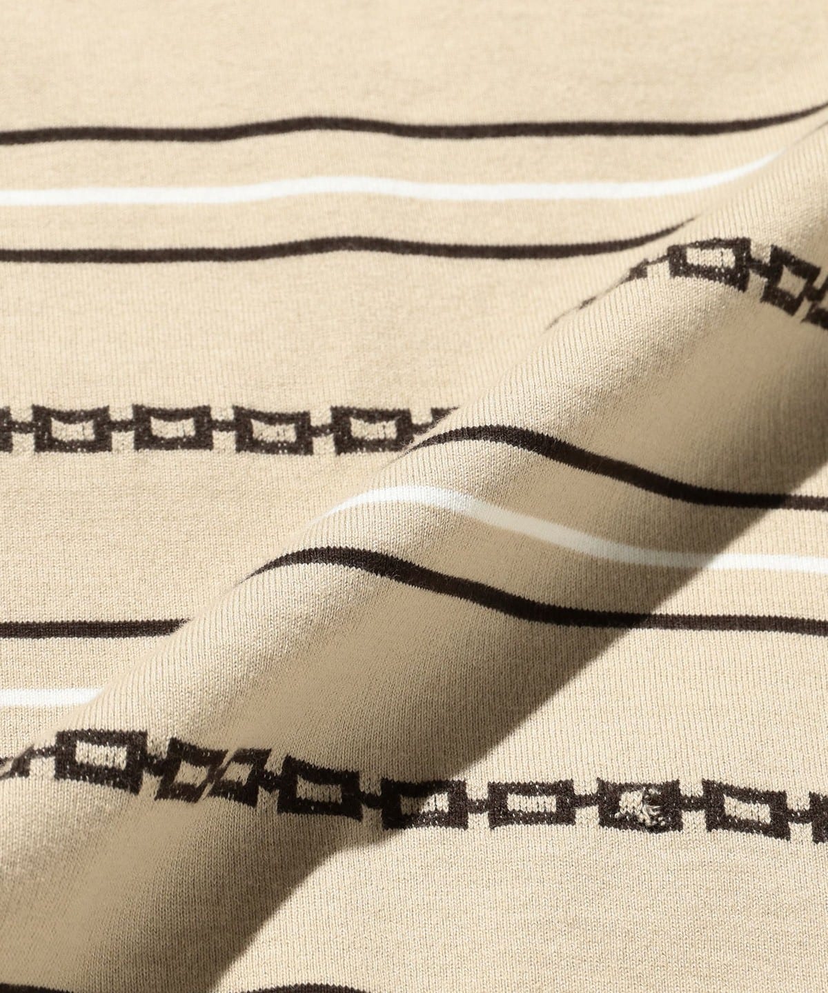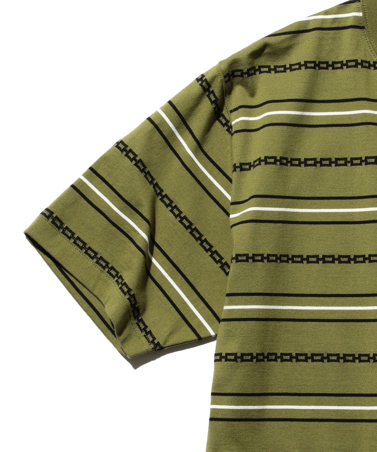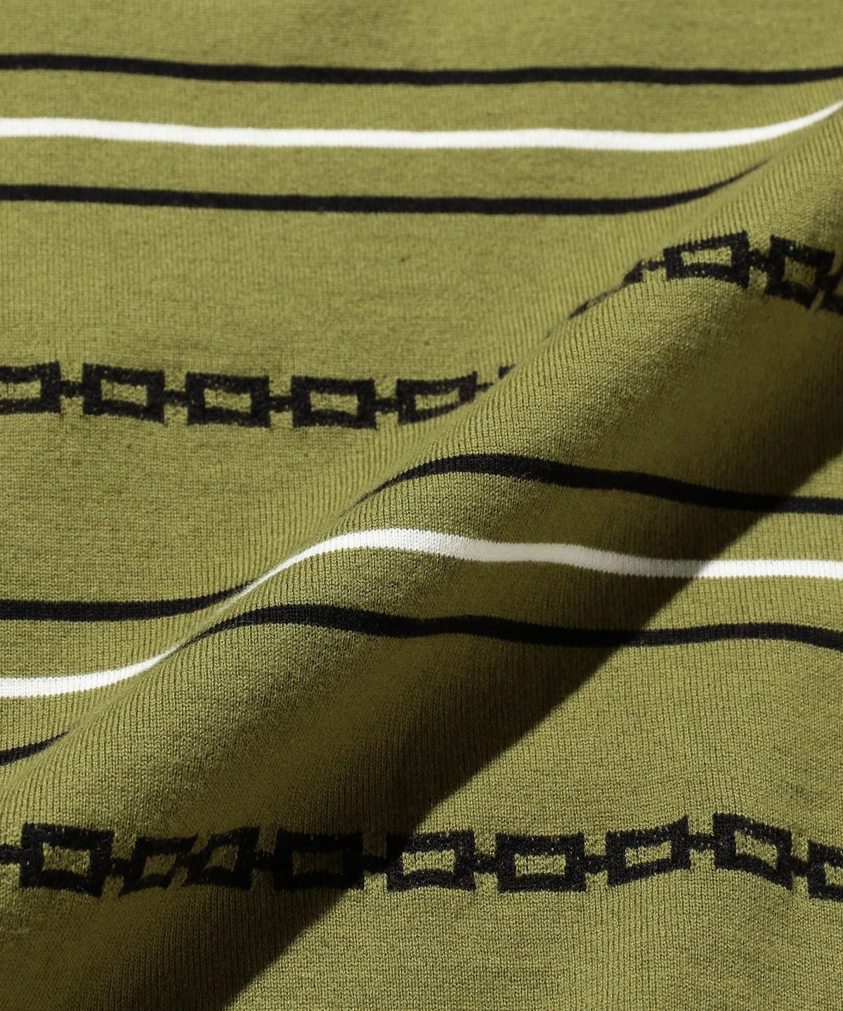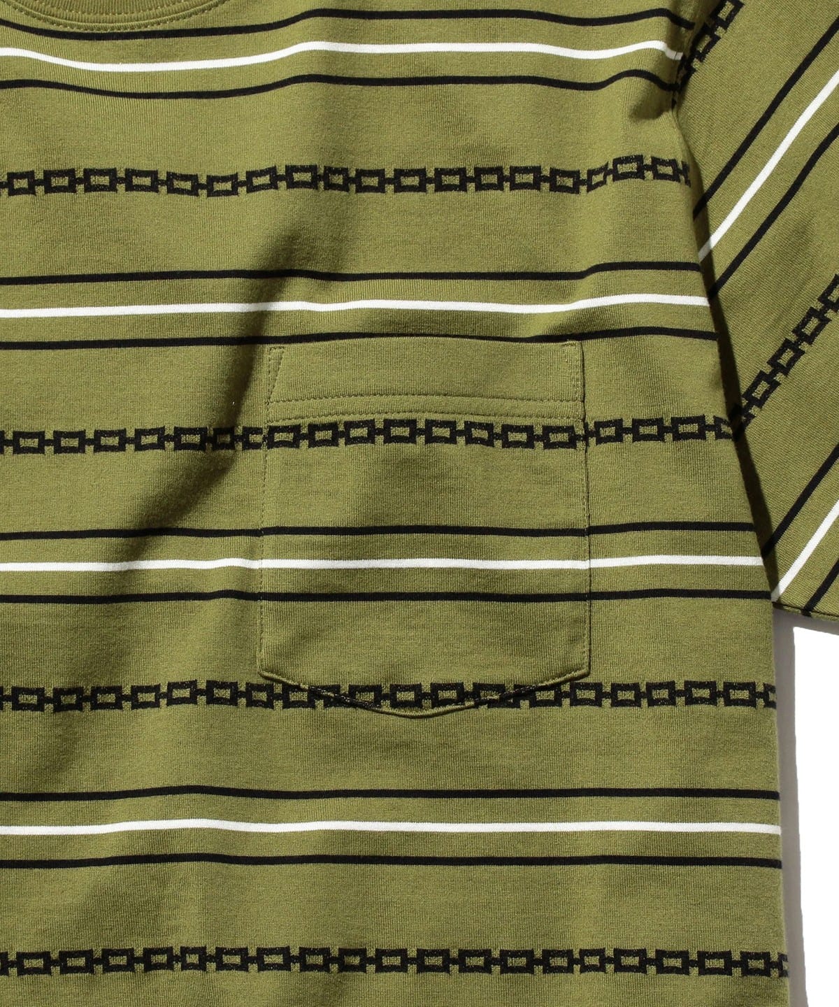 자카드 조직 특유의 섬세한 무늬와 보더 스트라이프가 절묘하게 어우러진 포켓 티셔츠입니다.