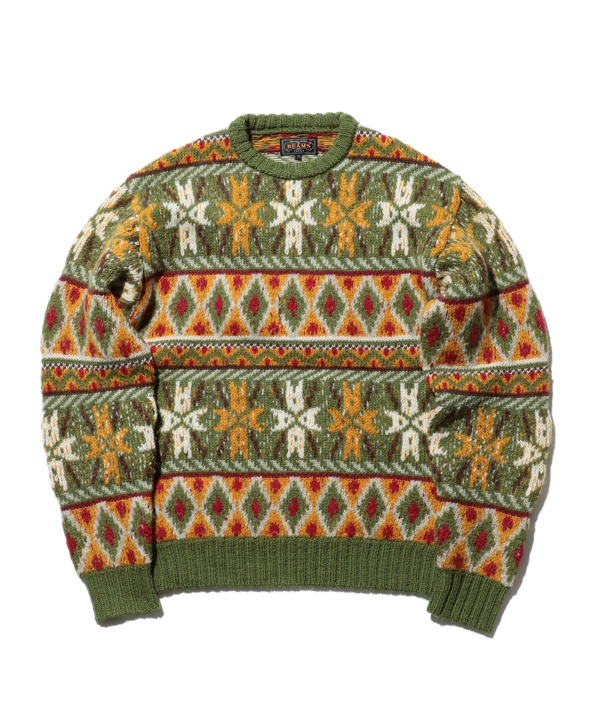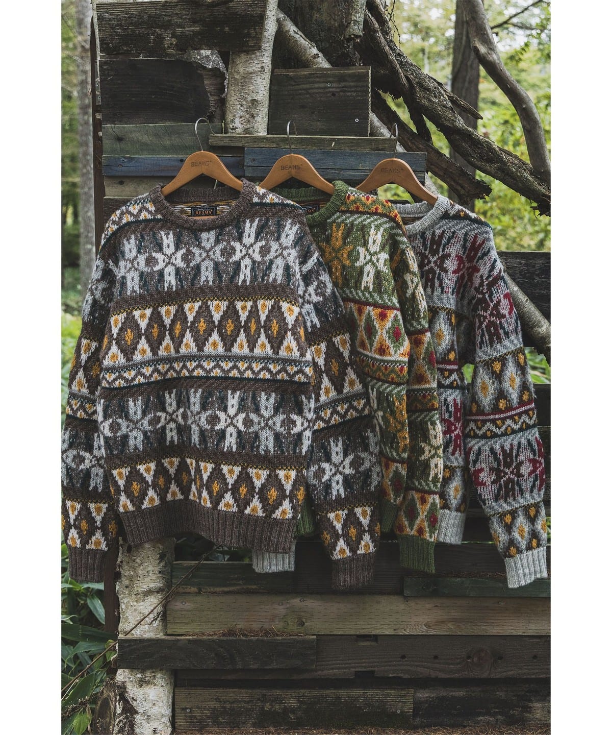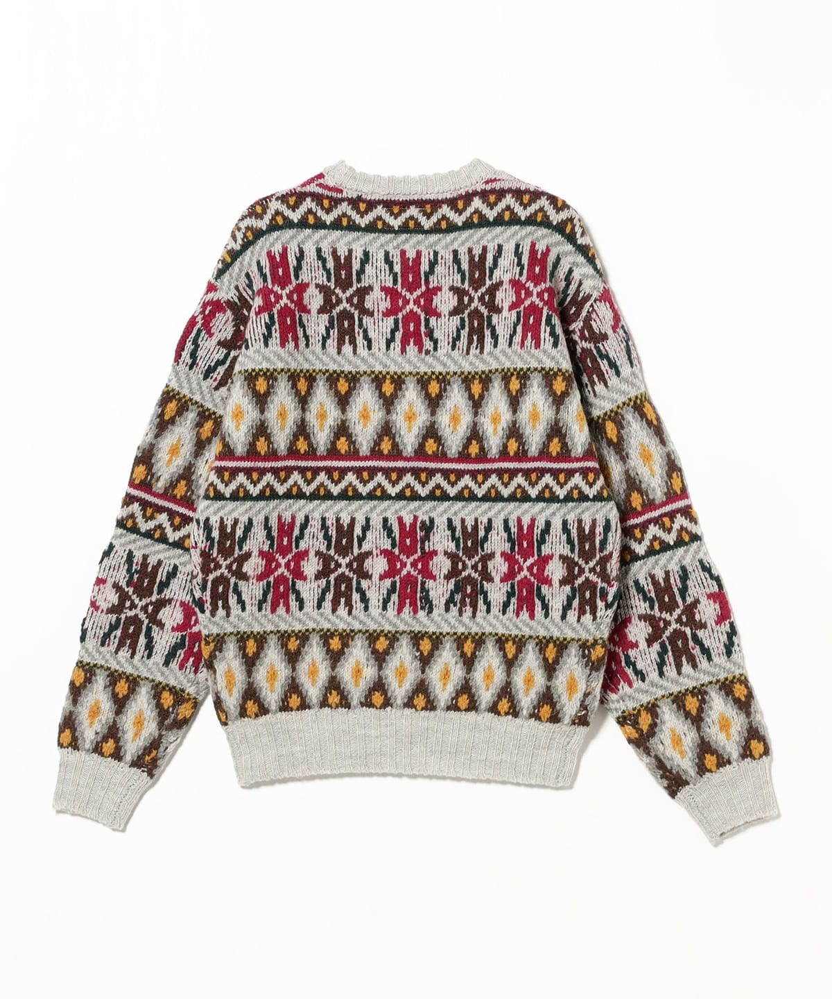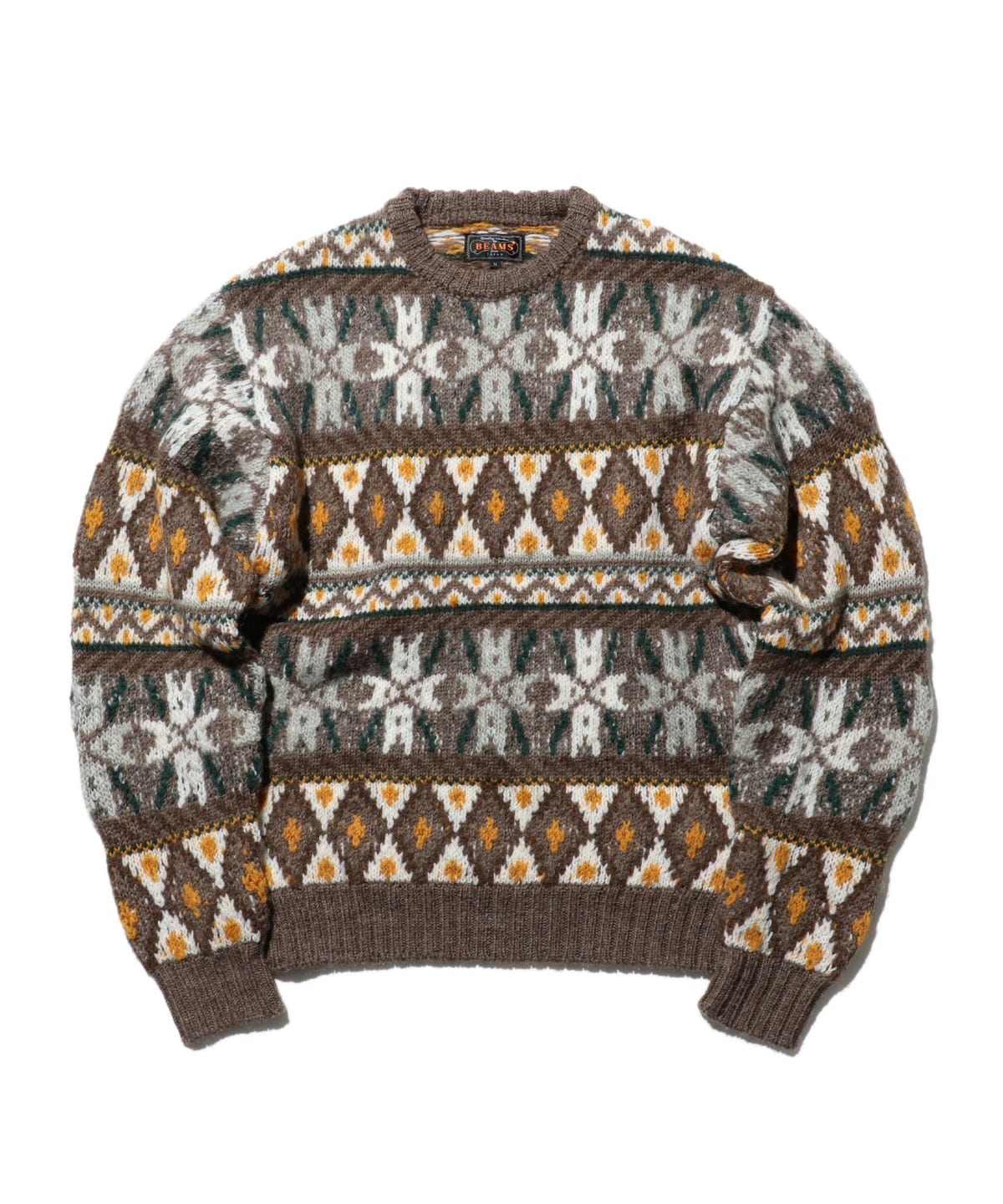 다색 자카드 직조 방식으로 표현된 가을·겨울 시즌을 상징하는 페어아일 패턴의 BEAMS PLUS 크루넥 니트입니다. 여유 있는 품으로 편안한 착용감을 주는 실루엣입니다.