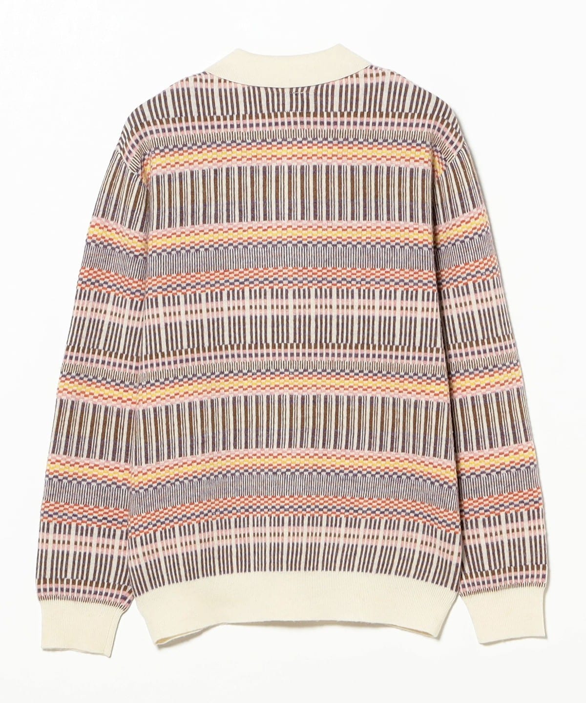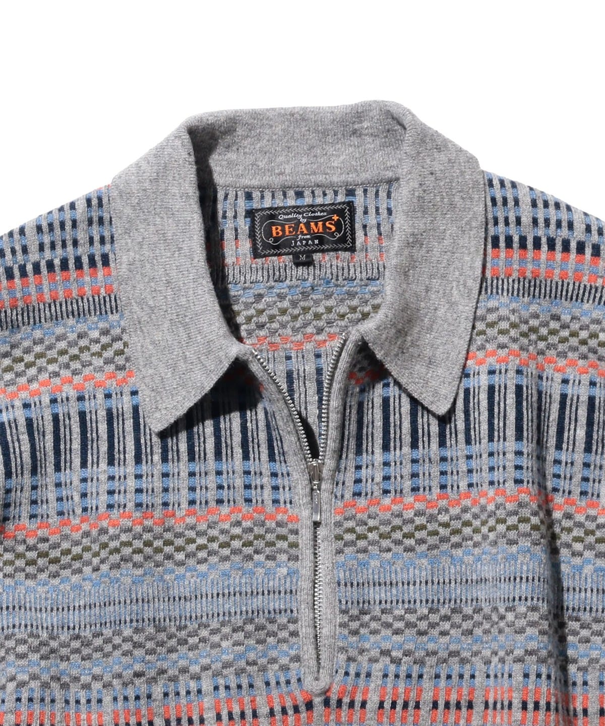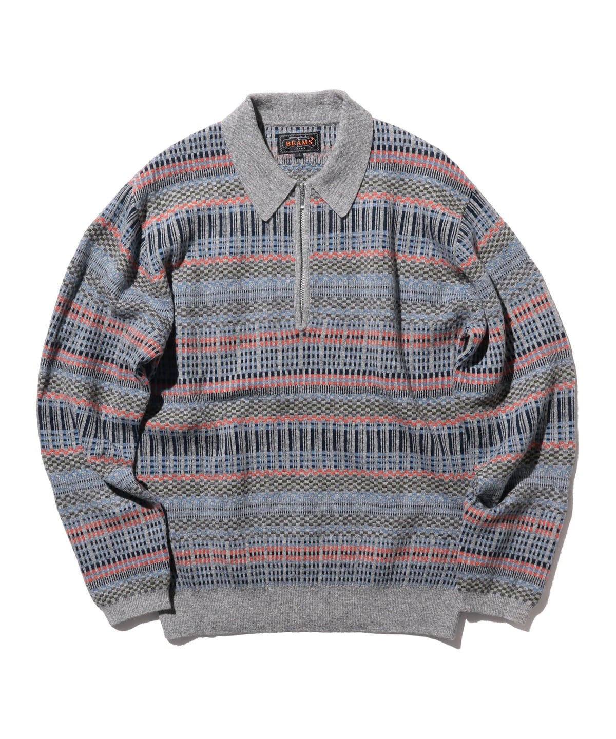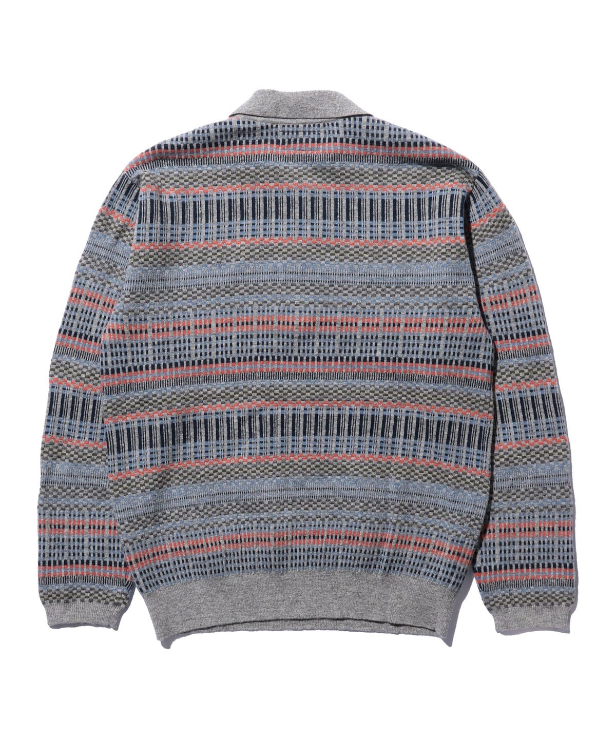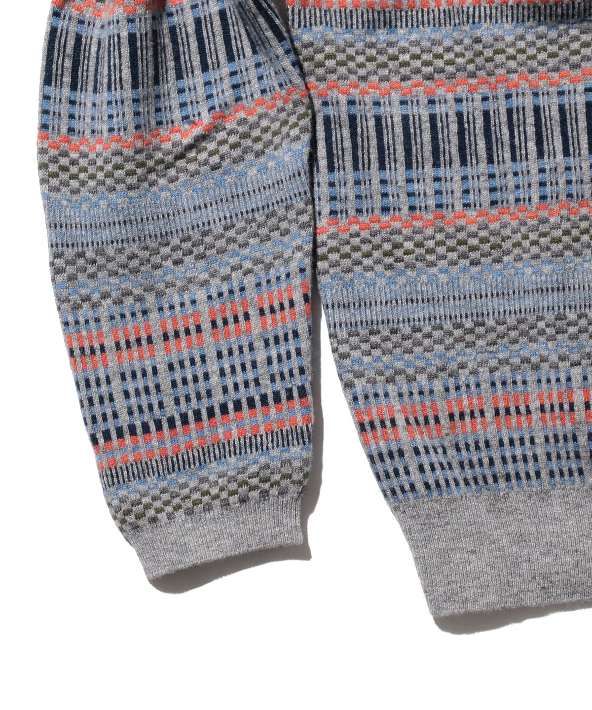빈티지 폴로셔츠를 모티브로 디자인된 하프지퍼 니트 폴로입니다. 6가지 색상을 조합해 짜올린 복잡한 자카드 패턴입니다. 보온성과 통기성을 가진 울과 가볍고 내구성이 뛰어난 나일론을 50:50으로 혼방한 실을 사용하여 가볍지만 따뜻한 소재입니다.