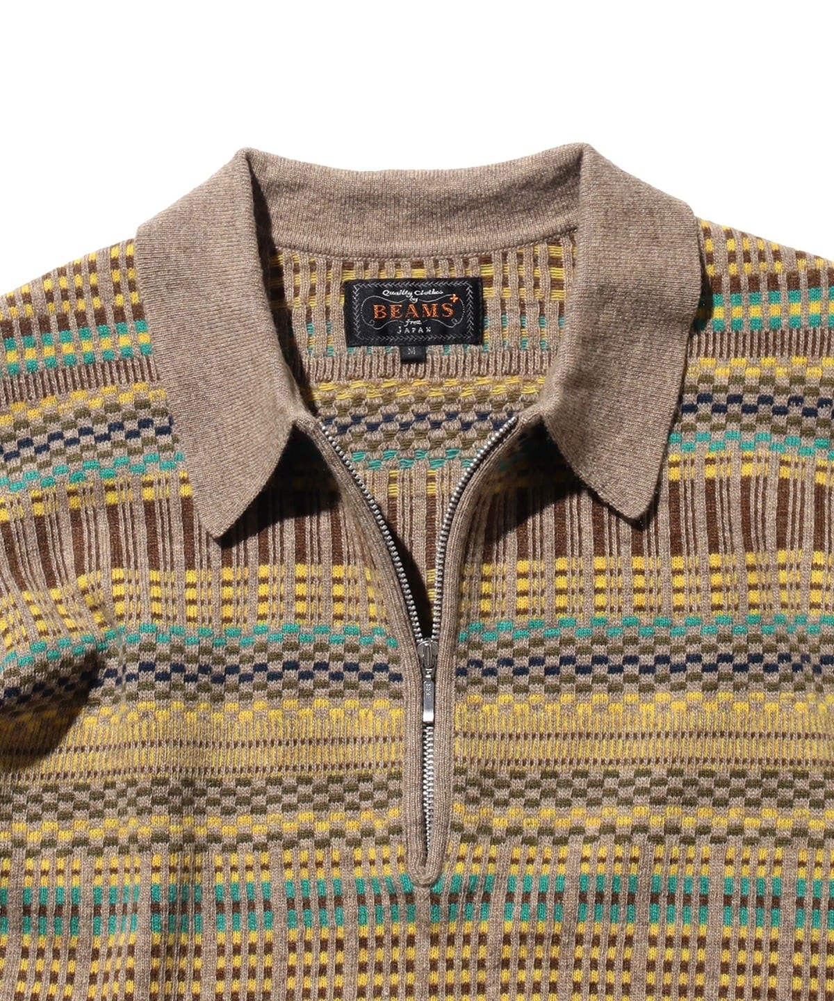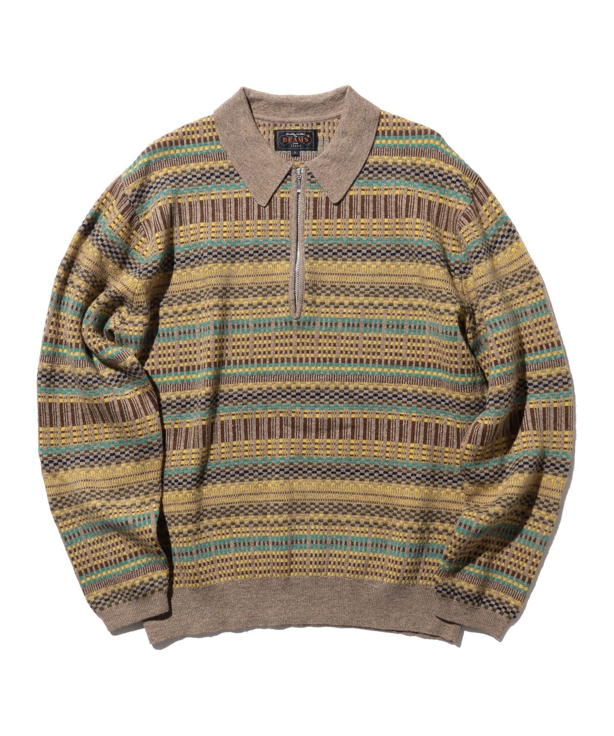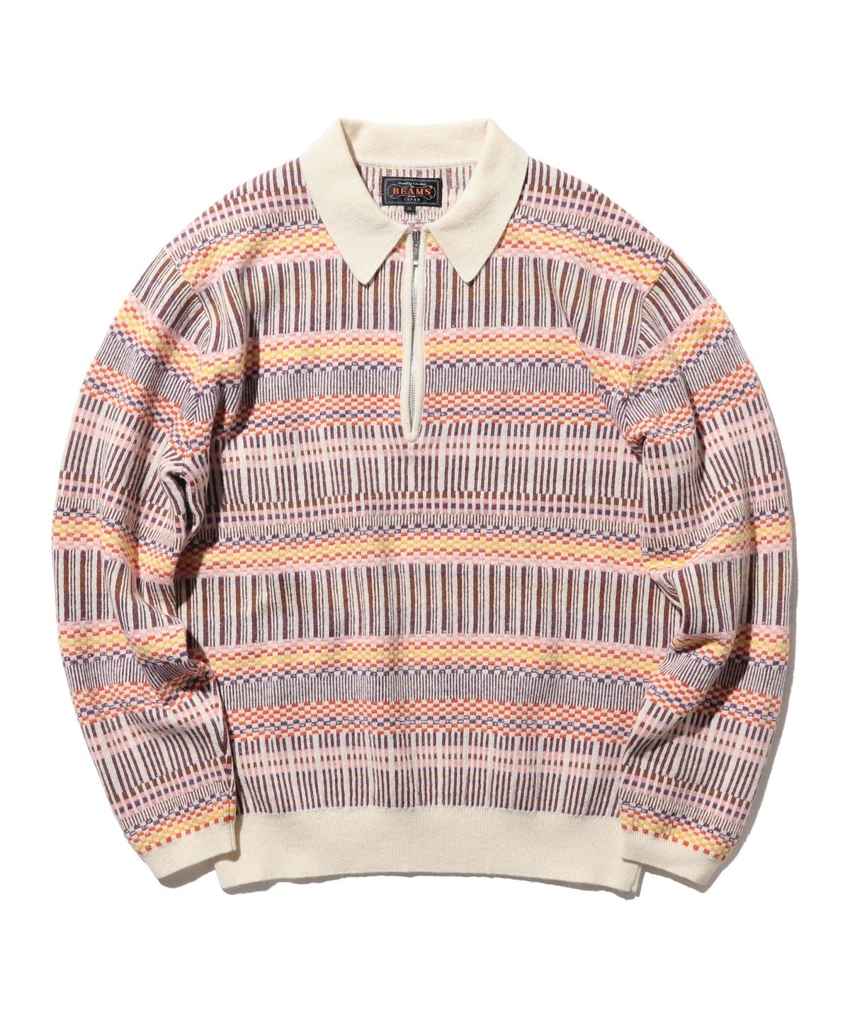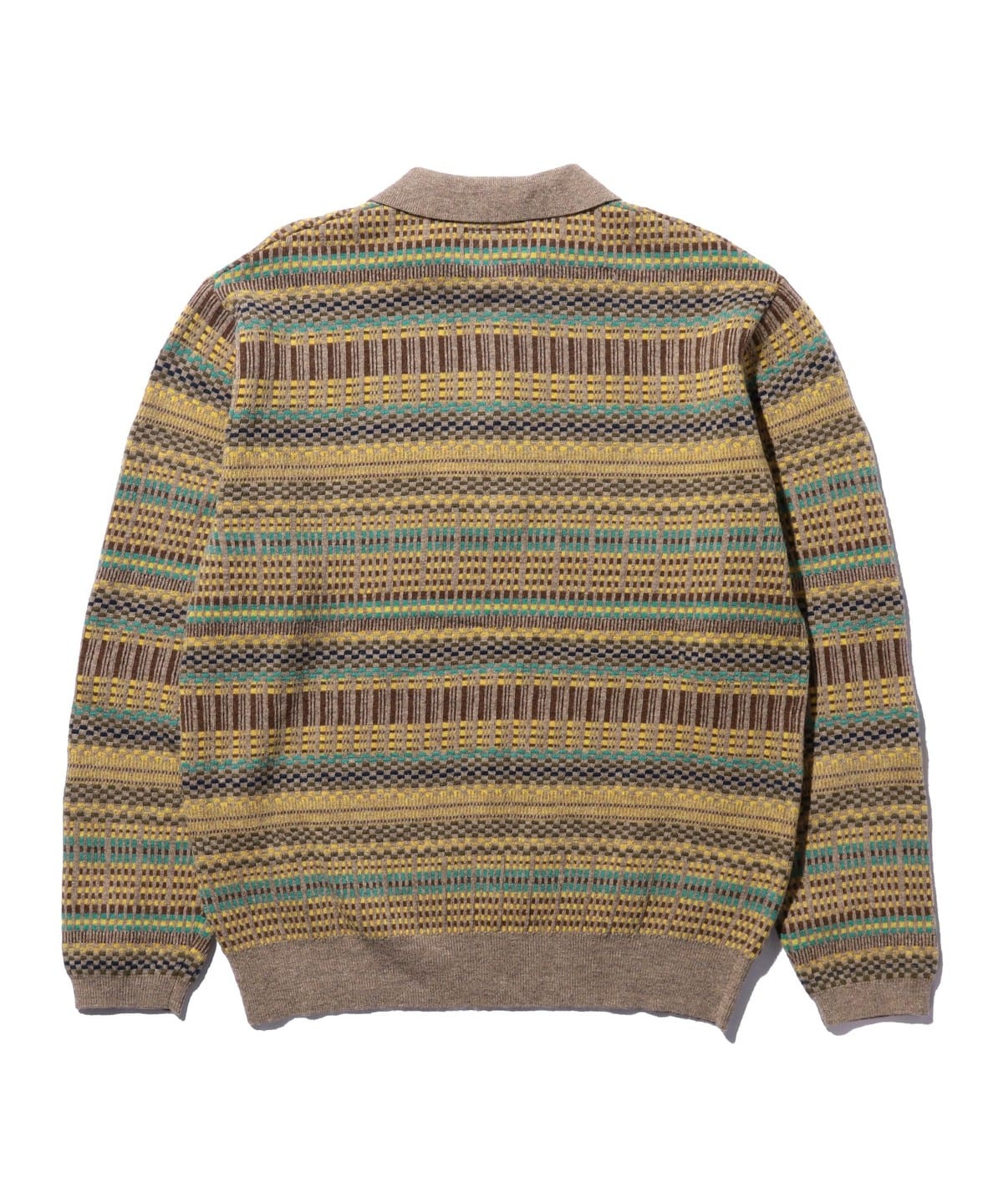 빈티지 폴로셔츠를 모티브로 디자인된 하프지퍼 니트 폴로입니다. 6가지 색상을 조합해 짜올린 복잡한 자카드 패턴입니다. 보온성과 통기성을 가진 울과 가볍고 내구성이 뛰어난 나일론을 50:50으로 혼방한 실을 사용하여 가볍지만 따뜻한 소재입니다.