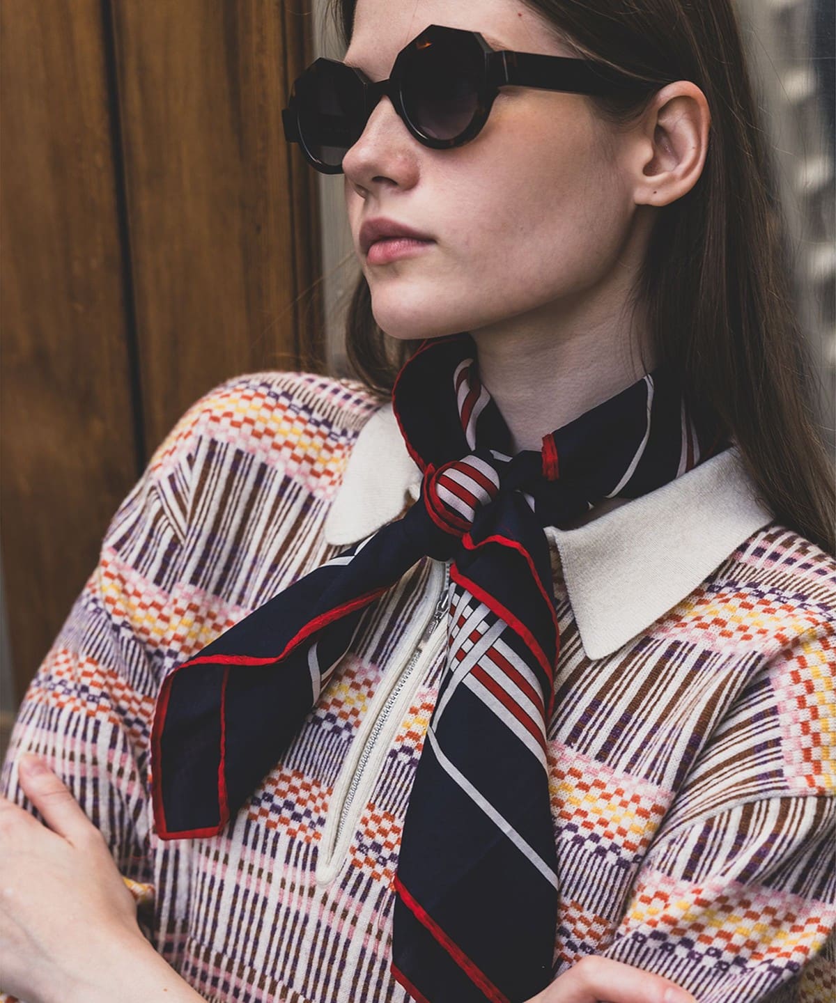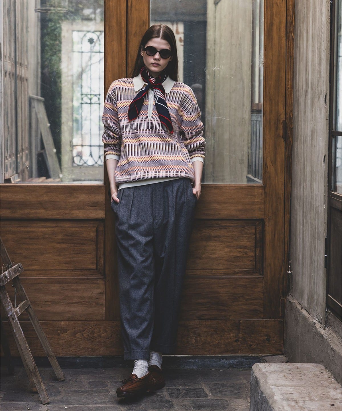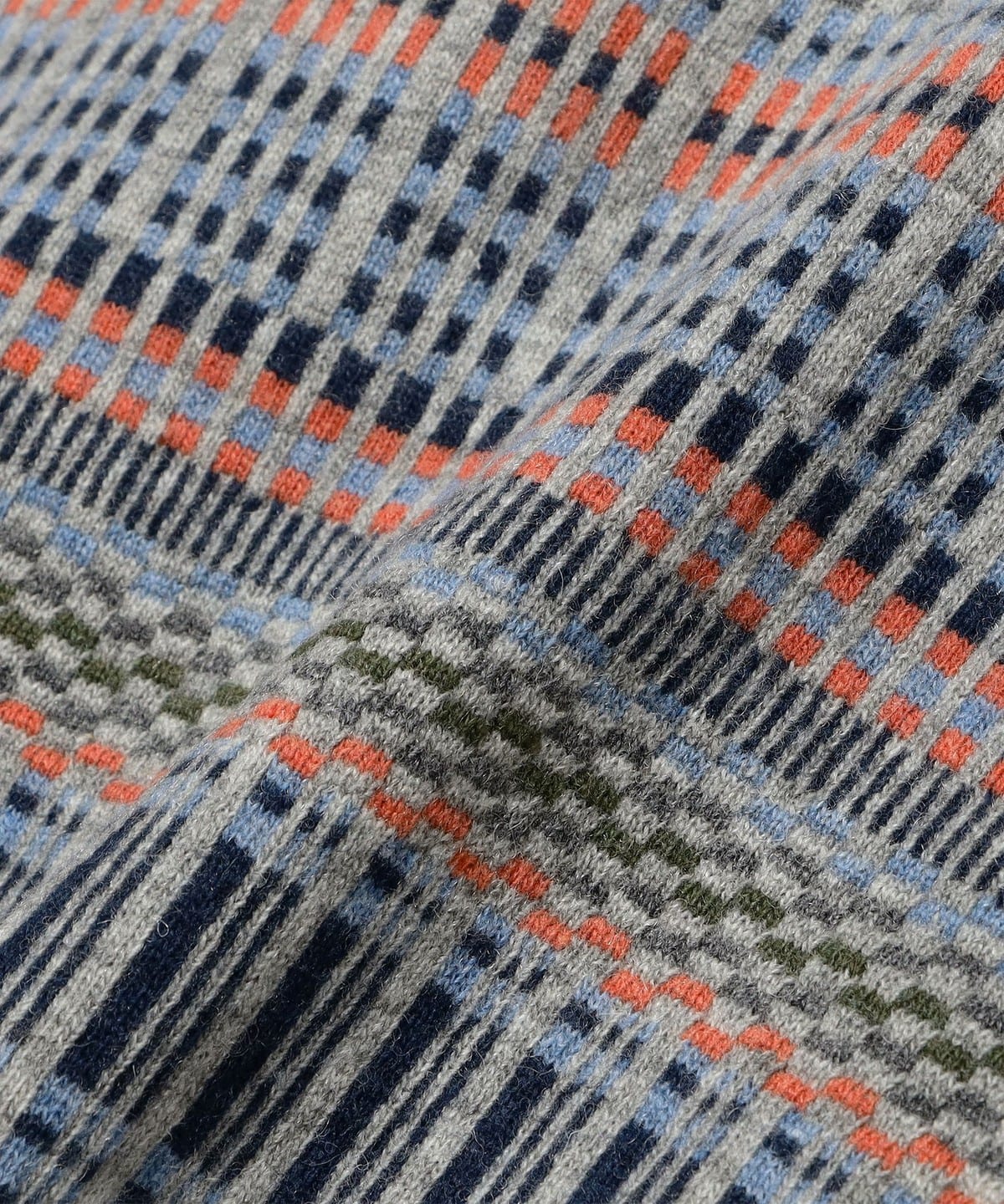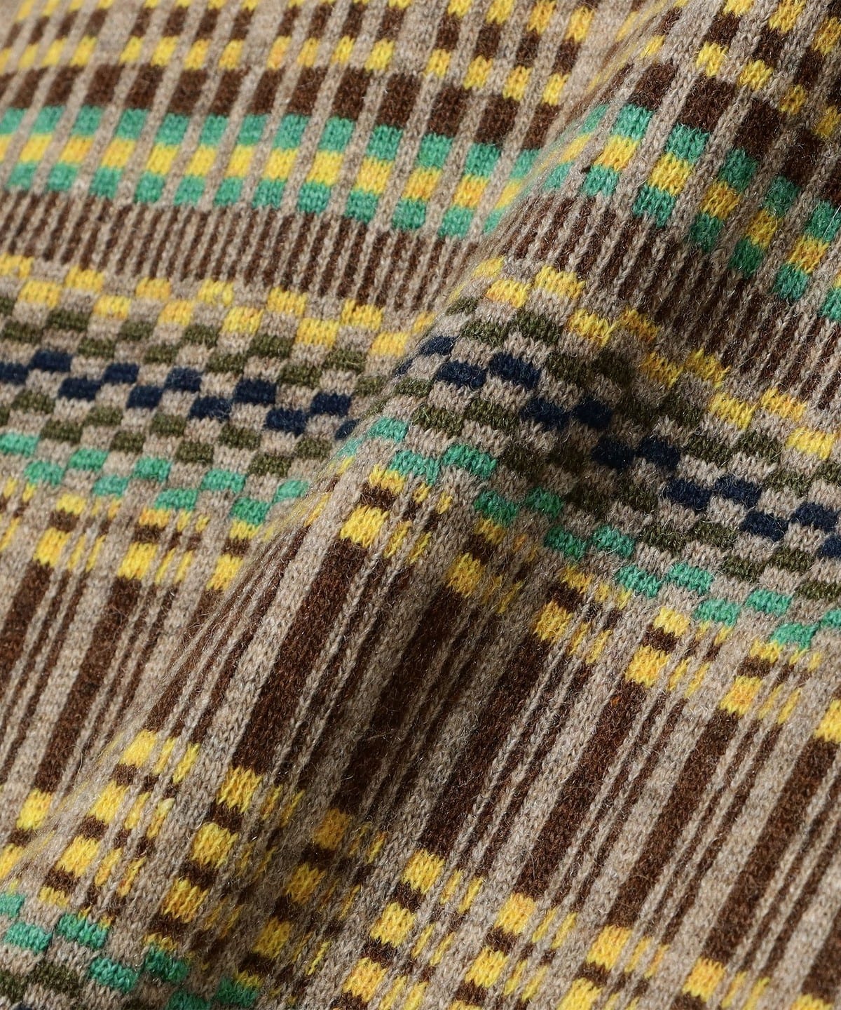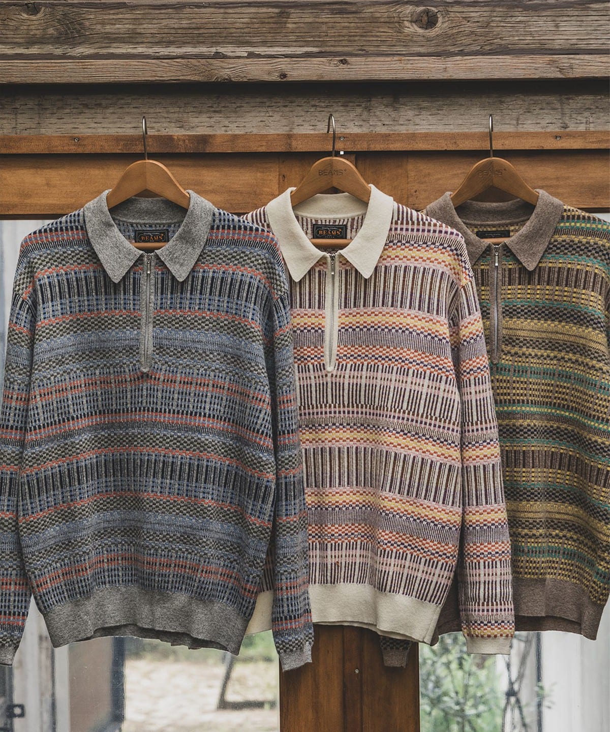 빈티지 폴로셔츠를 모티브로 디자인된 하프지퍼 니트 폴로입니다. 6가지 색상을 조합해 짜올린 복잡한 자카드 패턴입니다. 보온성과 통기성을 가진 울과 가볍고 내구성이 뛰어난 나일론을 50:50으로 혼방한 실을 사용하여 가볍지만 따뜻한 소재입니다.