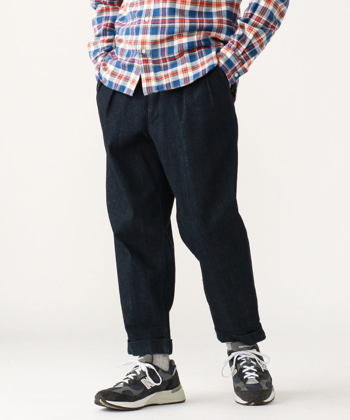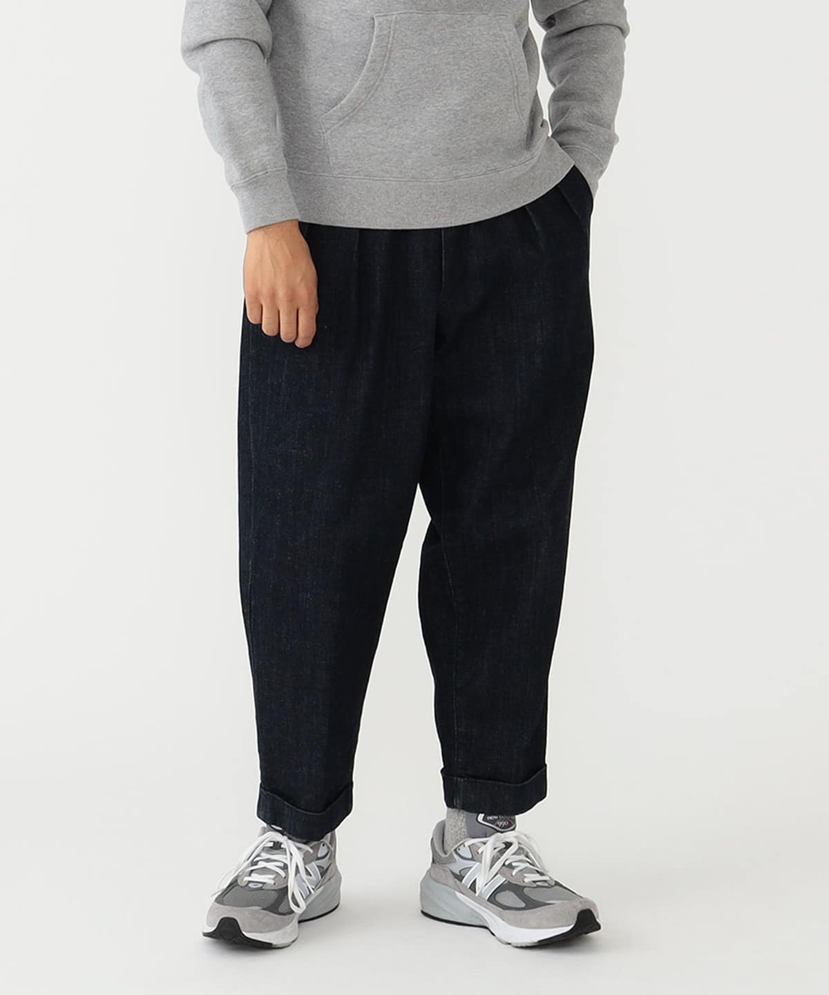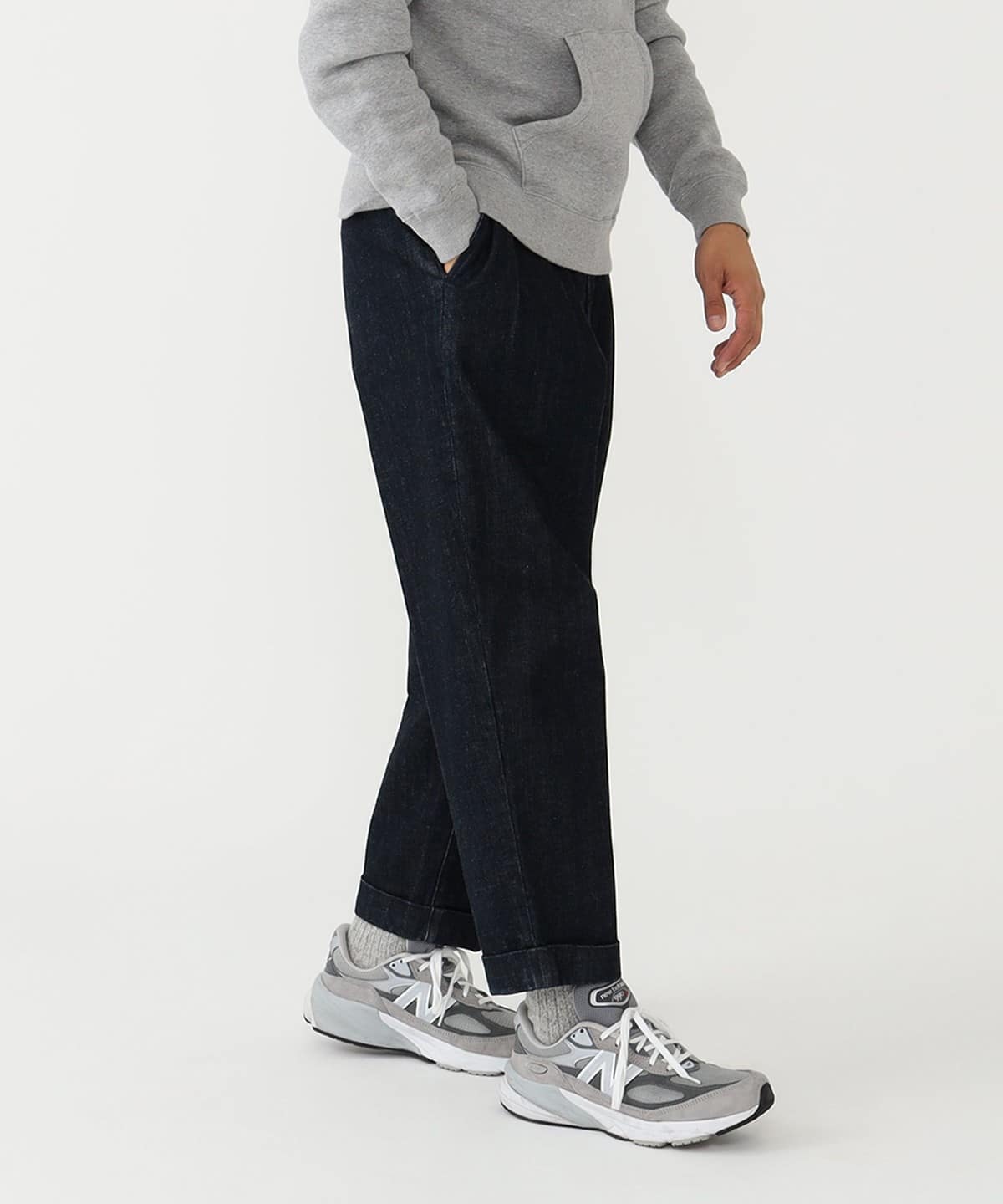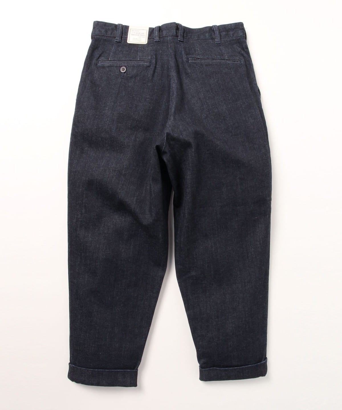클래식한 느낌의 2플리츠 바지. 경사진 아메리칸 포켓, 전통적인 코인 포켓, 양날로 마감된 백포켓이 특징입니다. 엉덩이와 옷자락 주위가 자연스럽게 가늘어지는 실루엣이며 밑단은 9부 길이의 더블 마감입니다. 12oz의 신축성 있는 데님으로 부드러운 질감입니다.