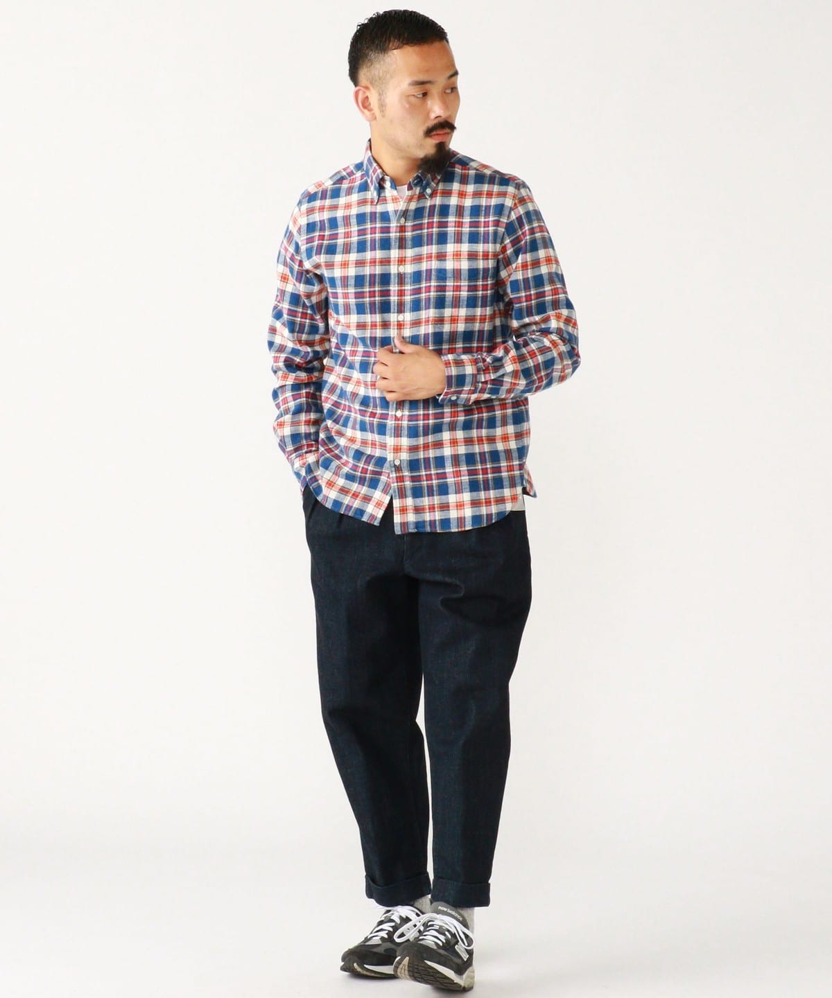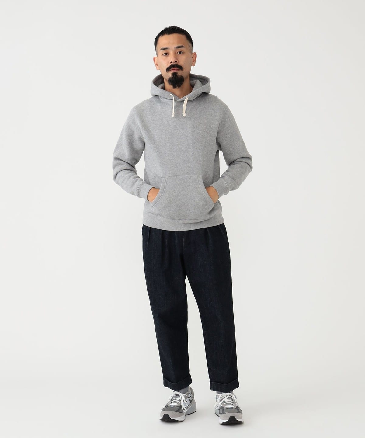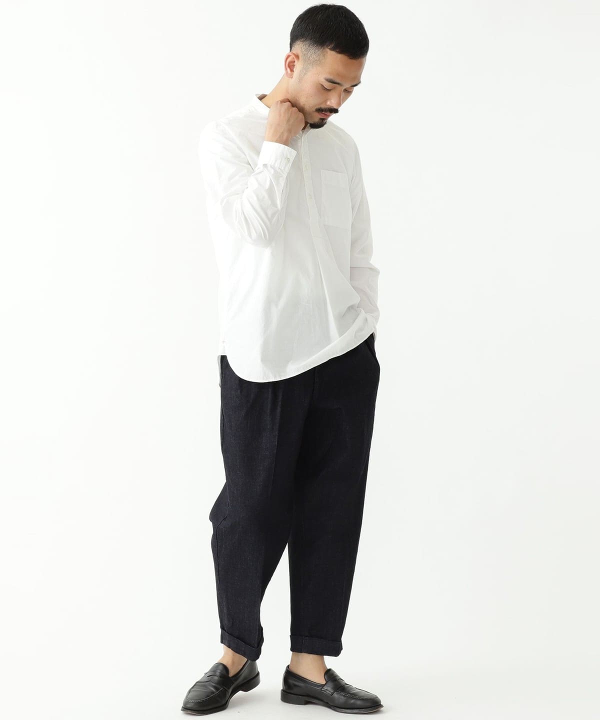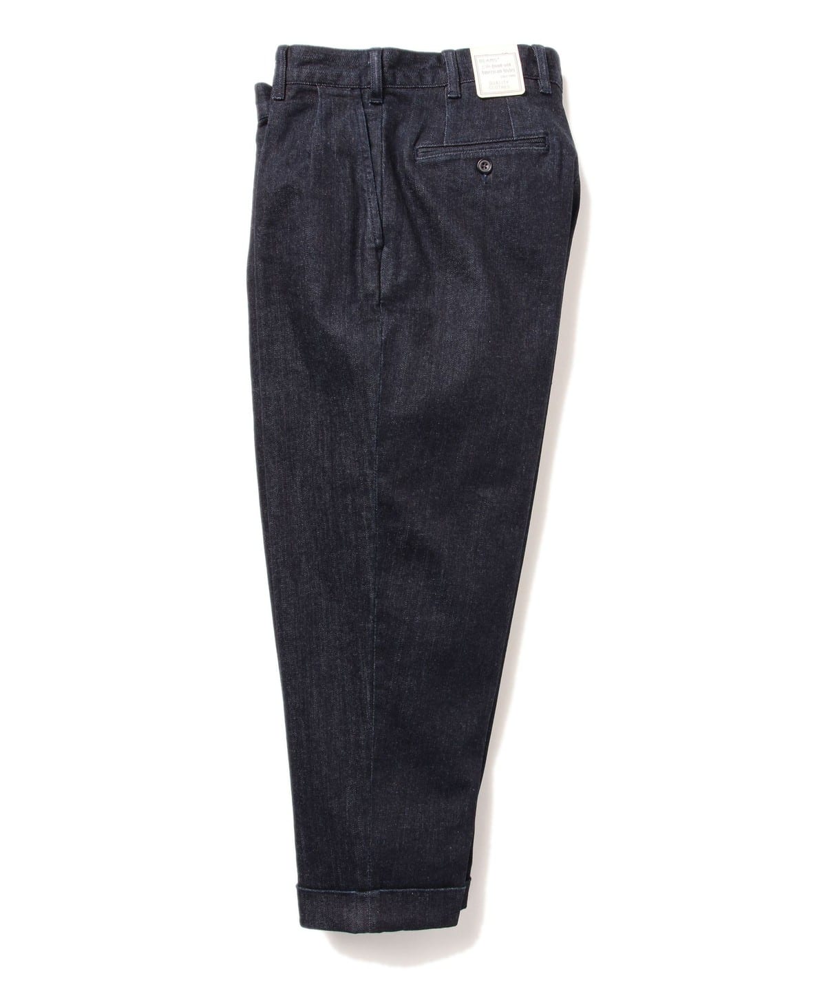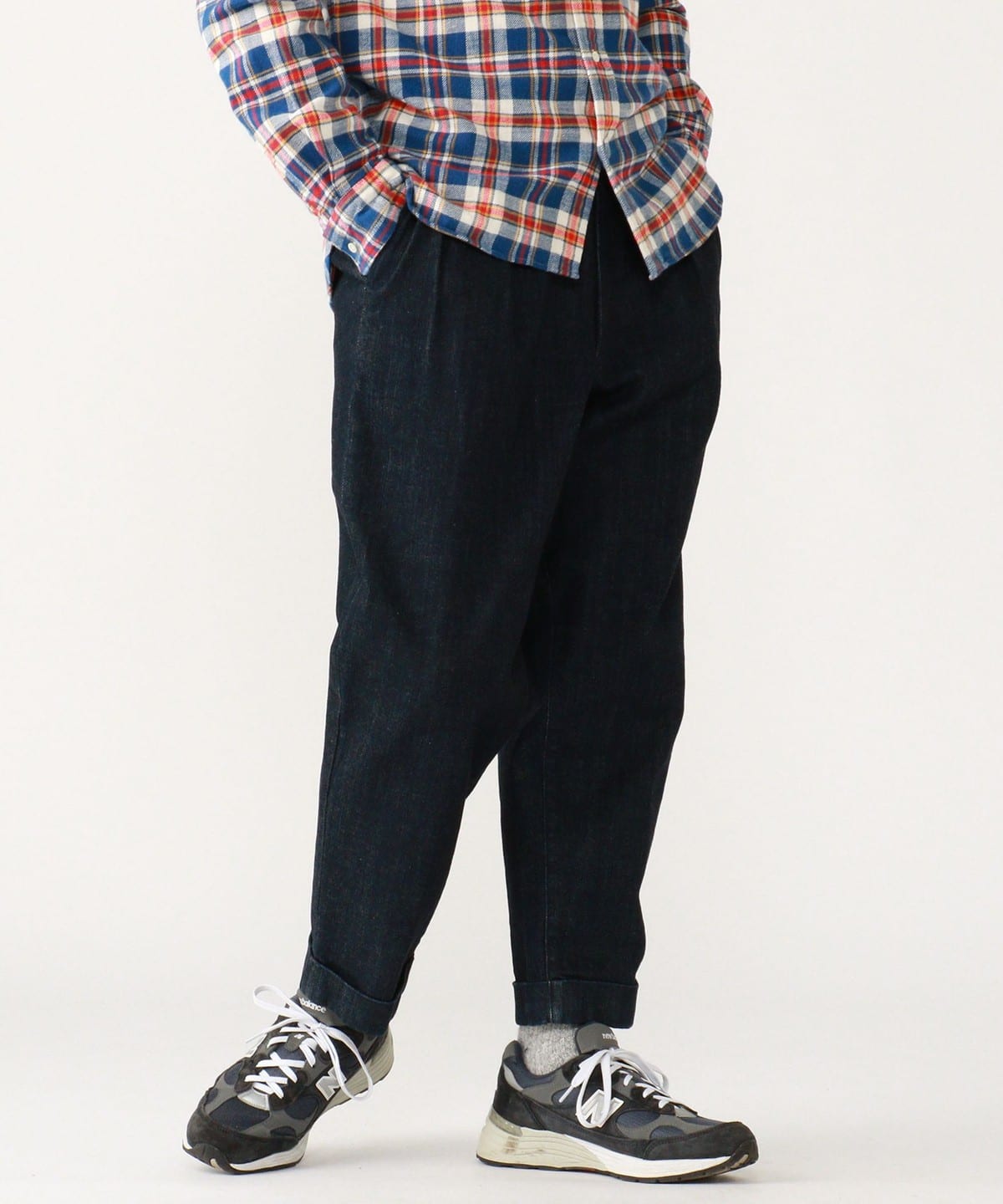 클래식한 느낌의 2플리츠 바지. 경사진 아메리칸 포켓, 전통적인 코인 포켓, 양날로 마감된 백포켓이 특징입니다. 엉덩이와 옷자락 주위가 자연스럽게 가늘어지는 실루엣이며 밑단은 9부 길이의 더블 마감입니다. 12oz의 신축성 있는 데님으로 부드러운 질감입니다.