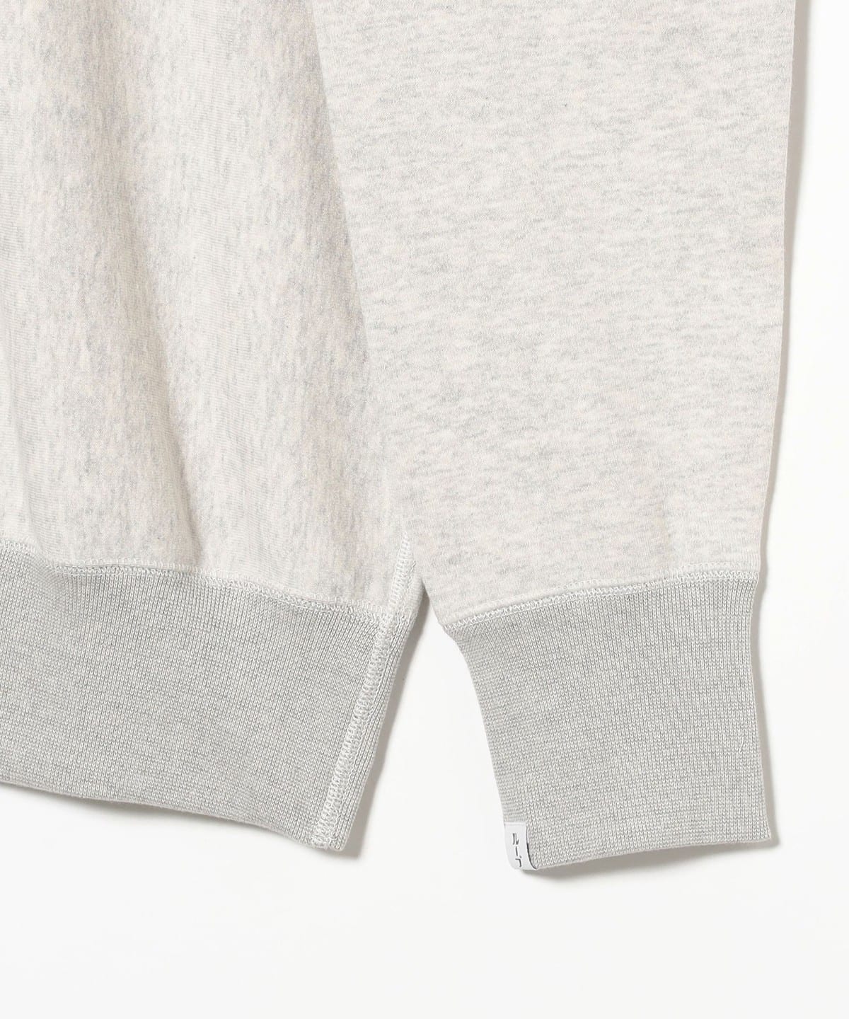 모크넥 스타일로 제작된 루프휠러 커스텀 스웨트 입니다. ‘100년 기모’라 불리는 특수한 츠리우라게 원단을 사용했으며, 일반적인 크루넥과는 다른 레이어드 연출이 가능합니다. 봉제선이 없는 심리스 돌먼슬리브 형태의 패턴을 사용합니다.