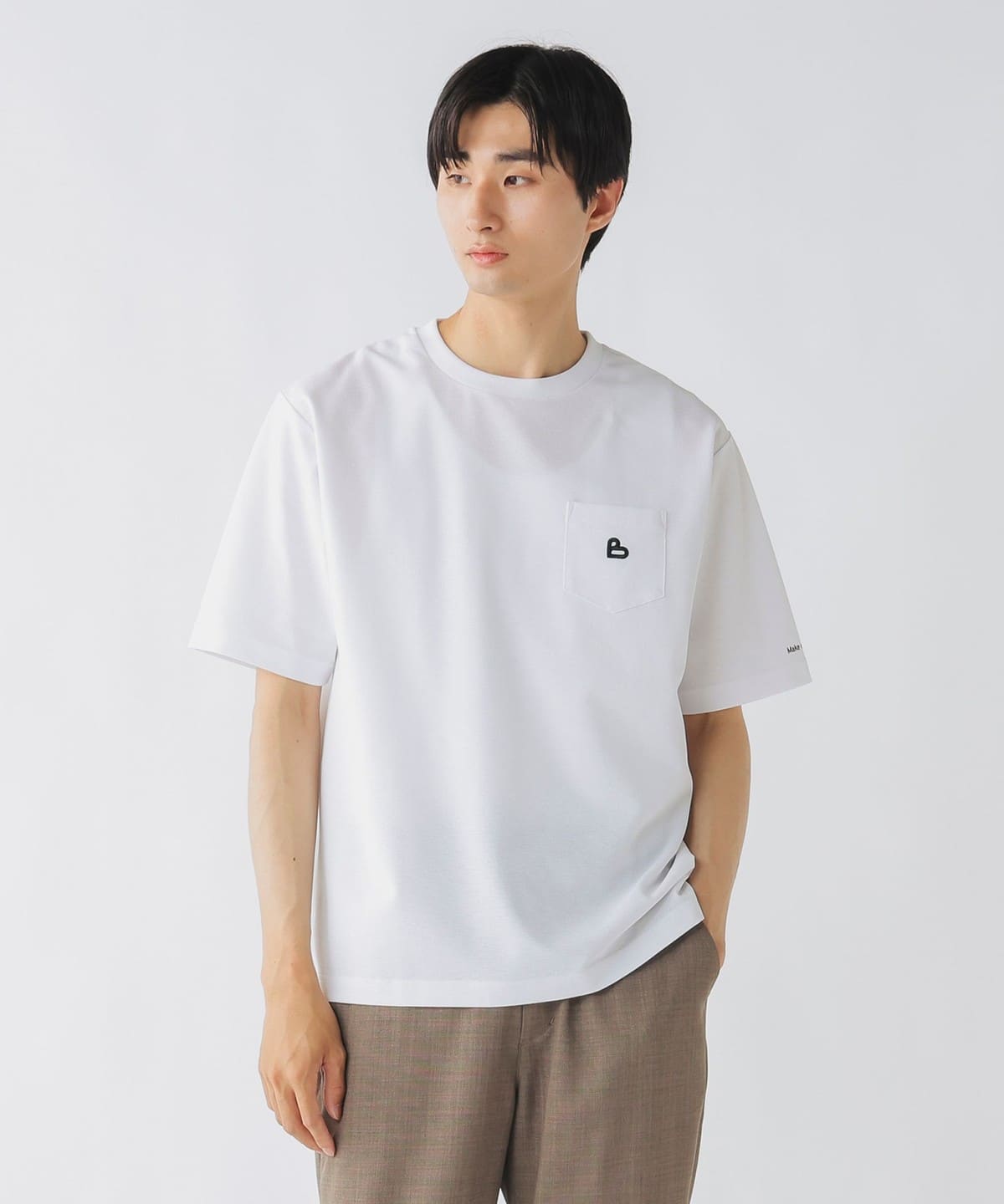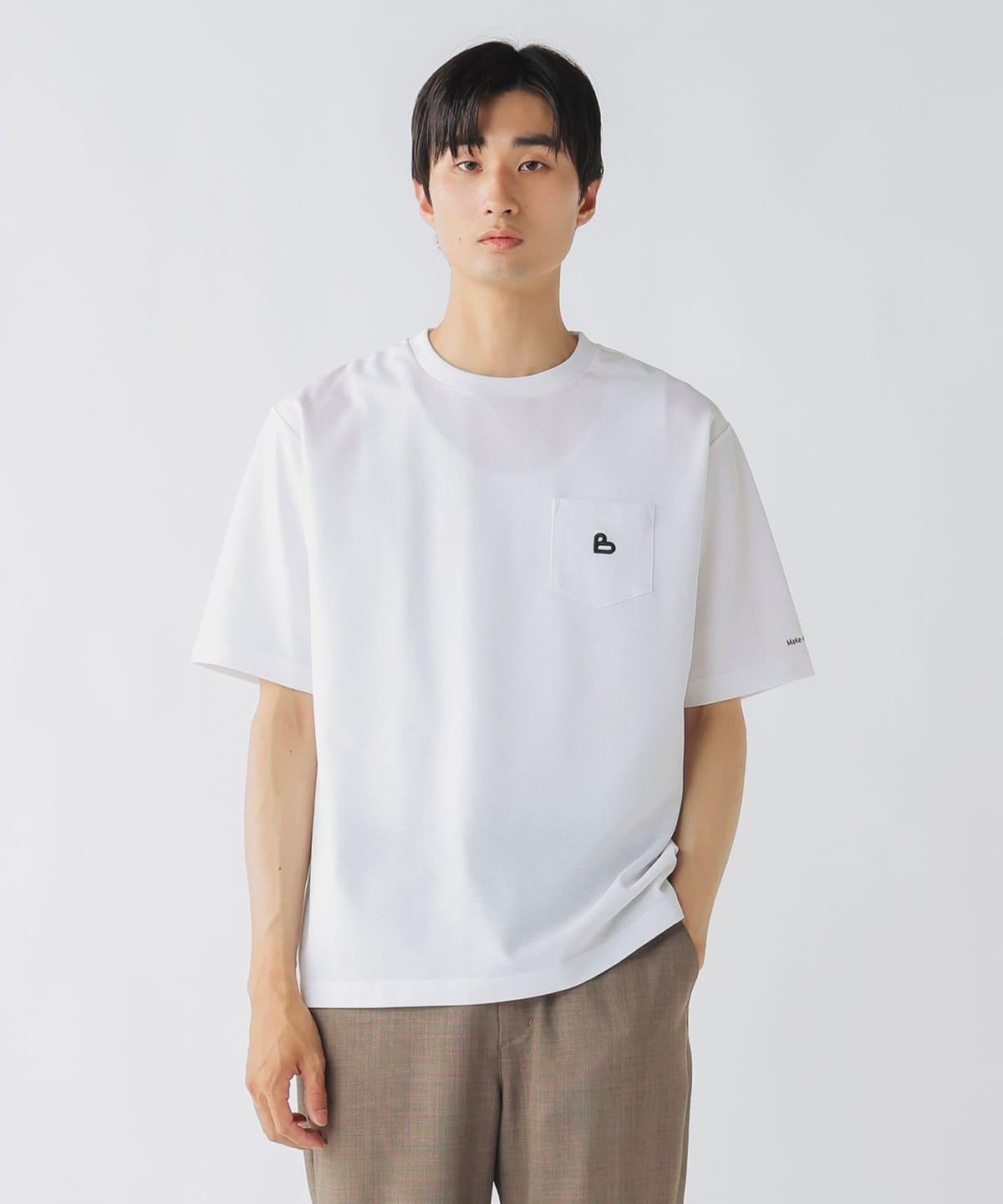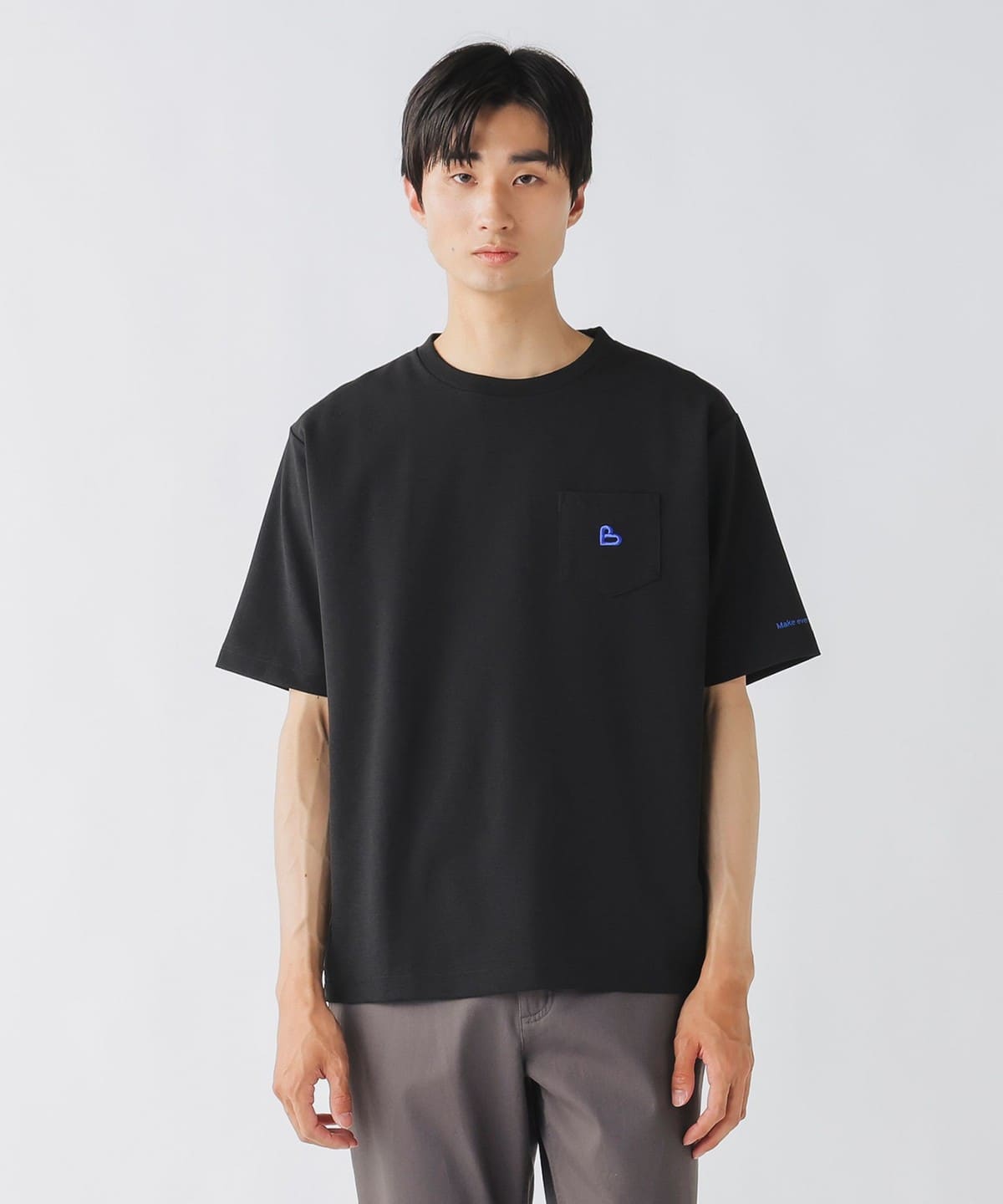 가슴에 B 또는 하트로 보이는 아이콘 자수가 들어간 반팔 티셔츠입니다. 적당한 여유가 있는 릴랙스 핏으로, 밸런스 잡기 쉬운 베이직한 실루엣입니다.