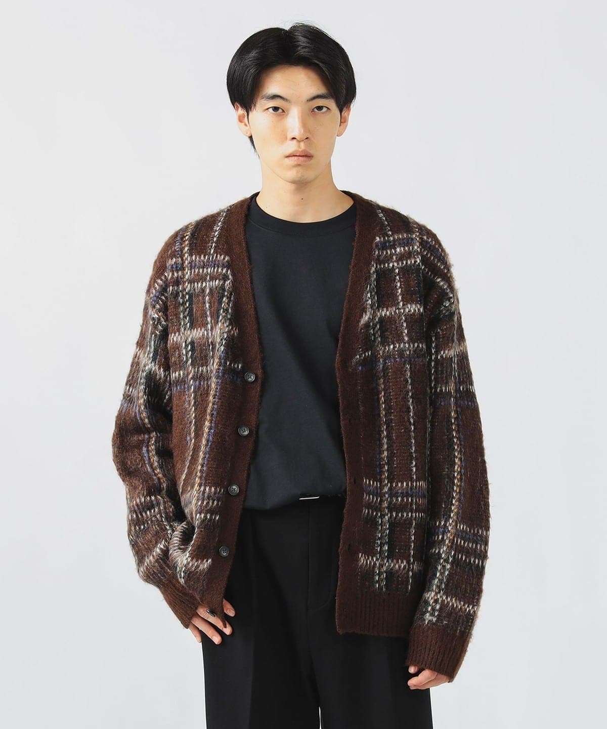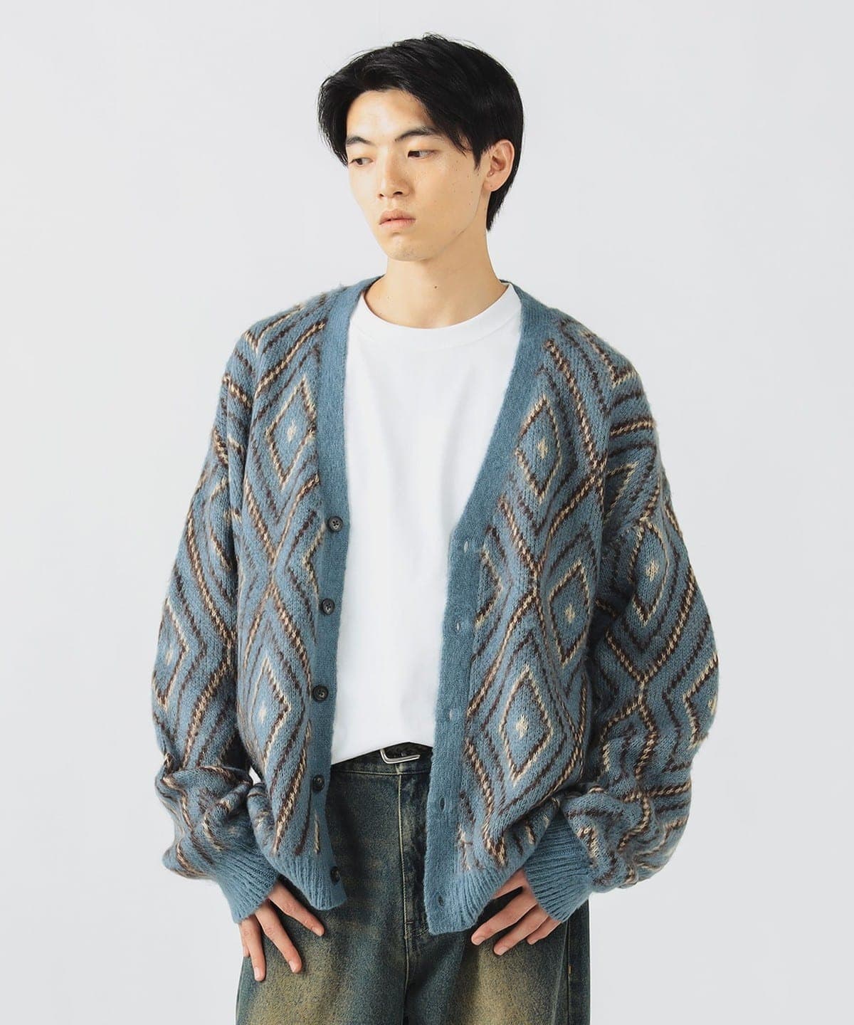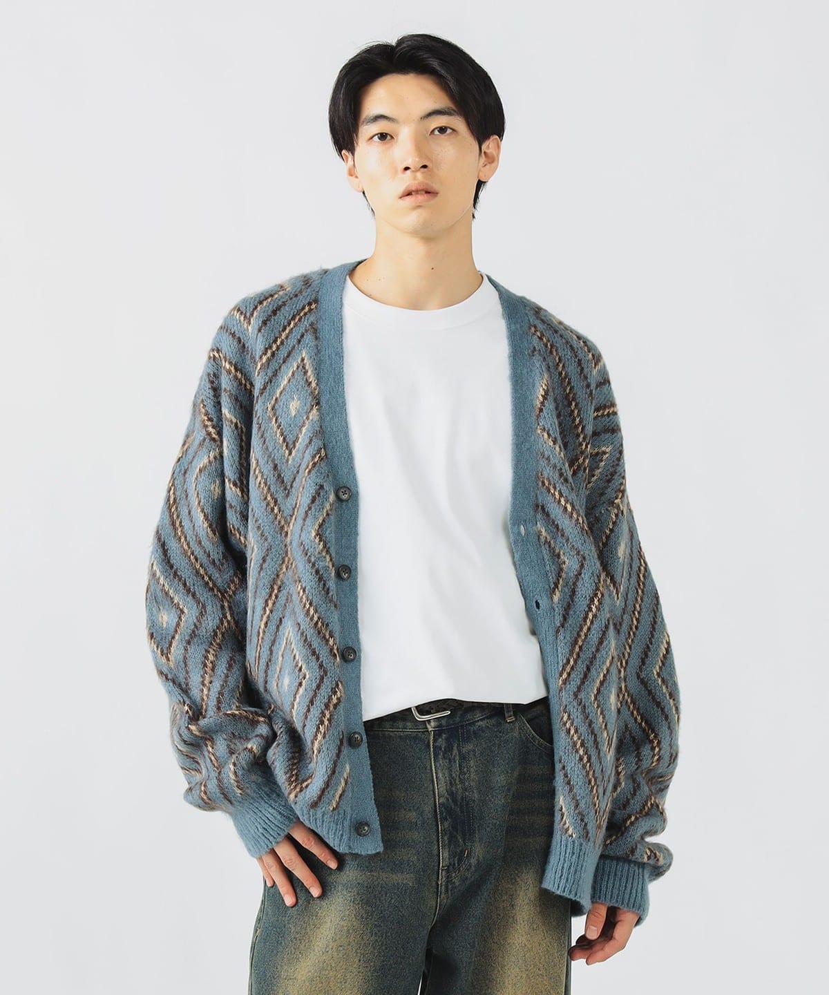 대담한 패턴이 시선을 사로잡는 V넥 카디건입니다. 부드럽고 보송한 샤기 터치의 아크릴 소재를 사용하여, 약간 도톰한 질감이 특징입니다.