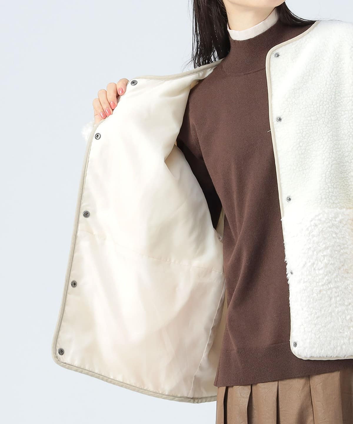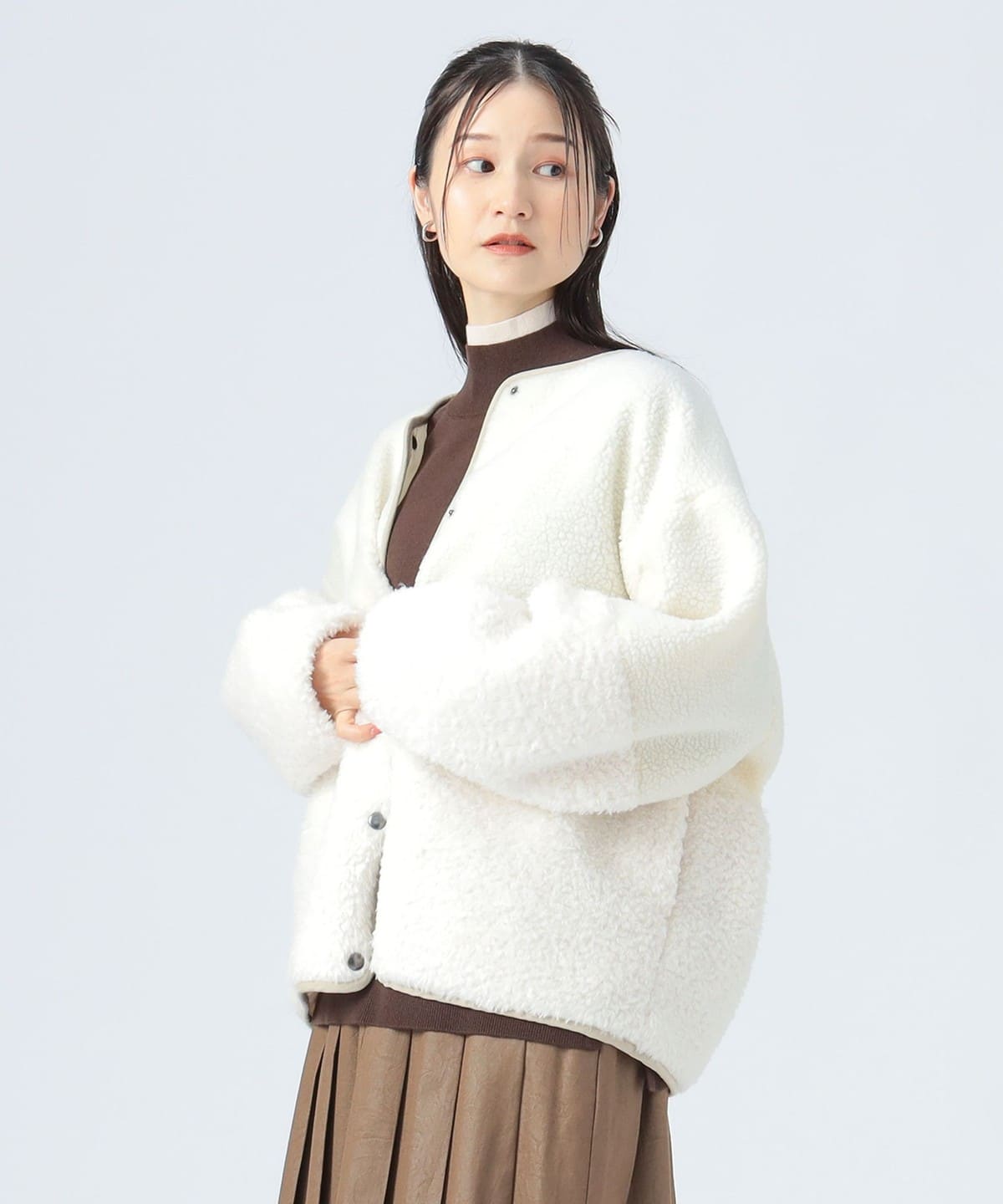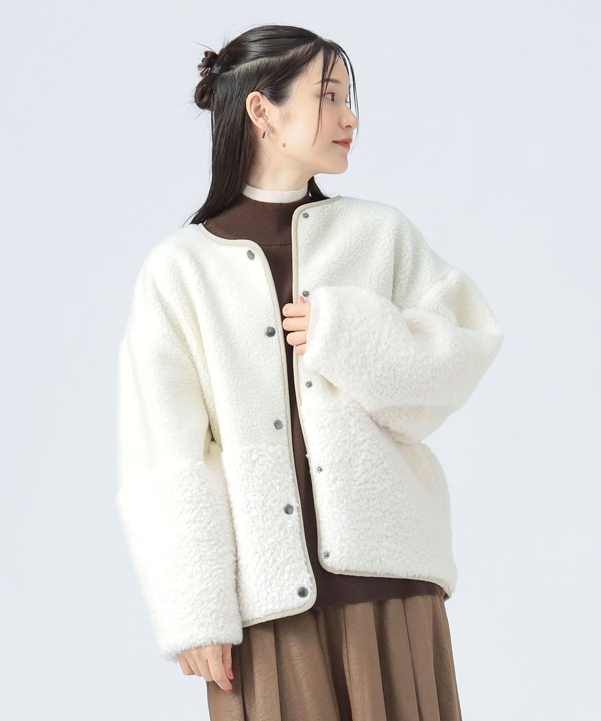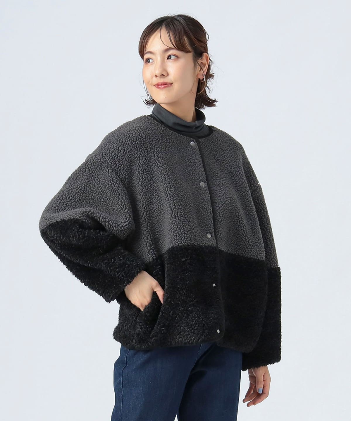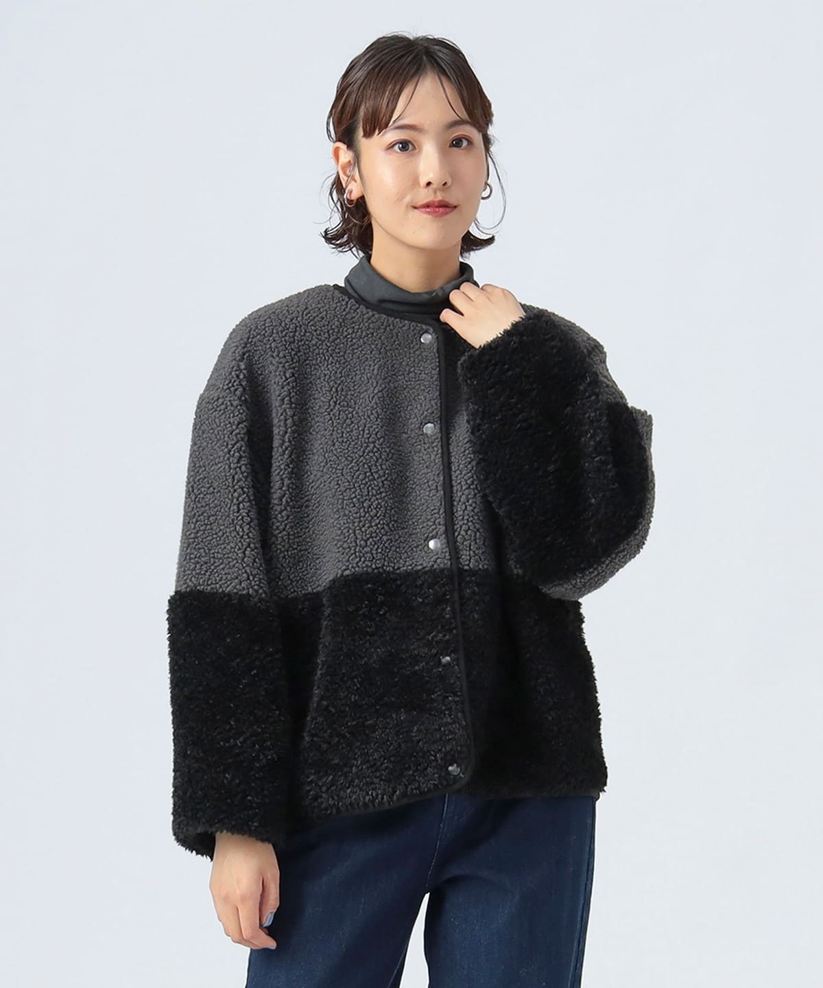두 가지 다른 보아 소재를 조합해 디자인적인 완성도를 높인 블루종. 네크라인과 전면 중앙에 더해진 파이핑 디테일이 전체적인 라인을 잡아주며 적당히 여유 있는 실루엣입니다.