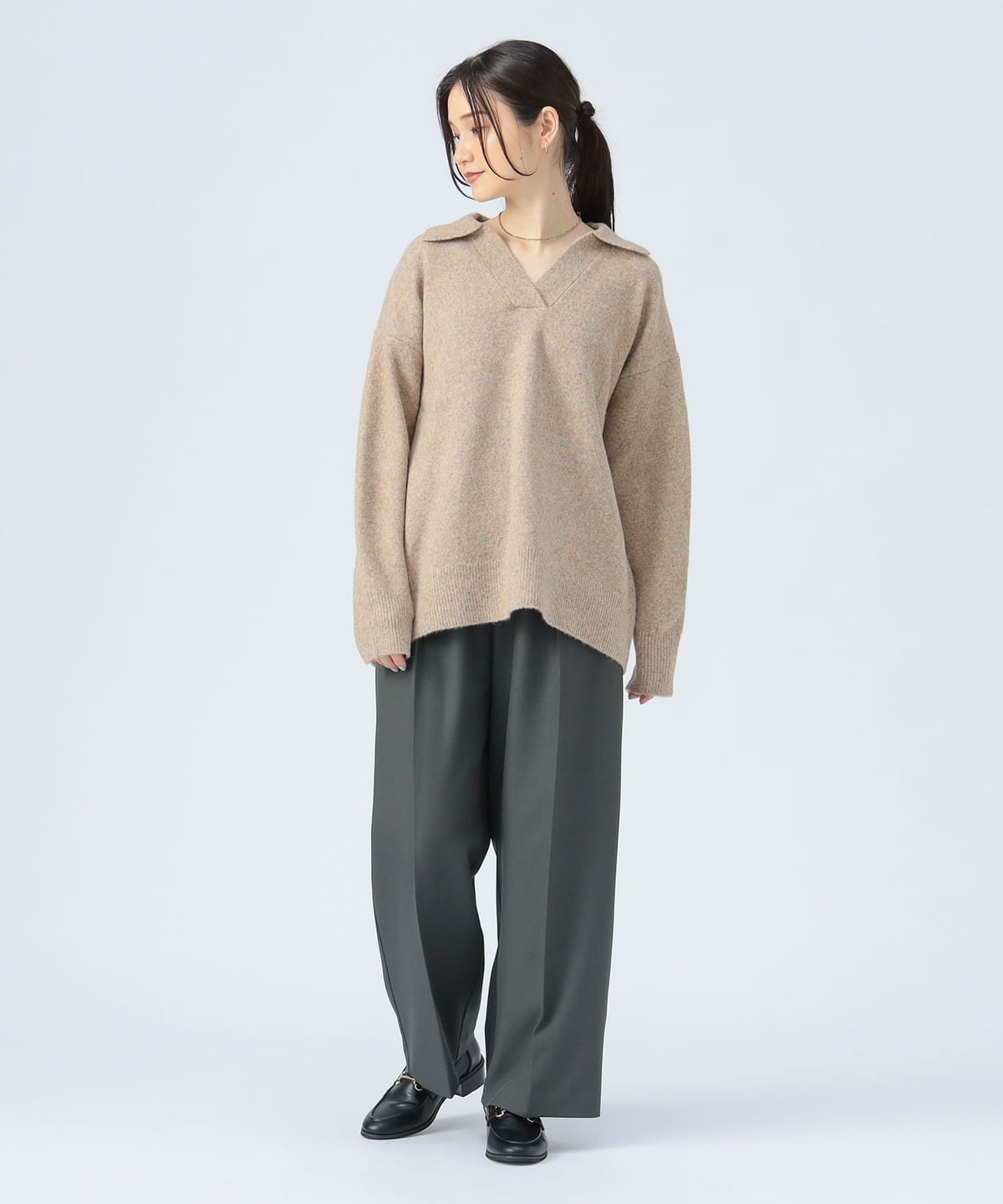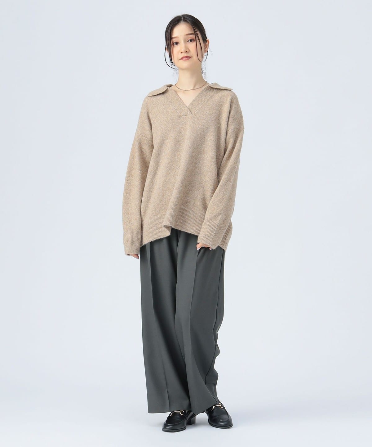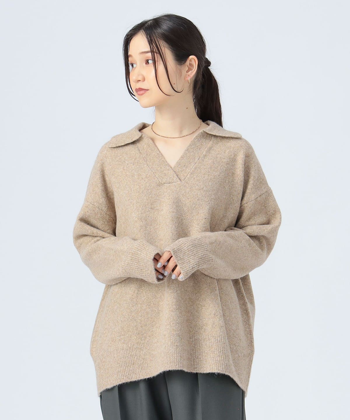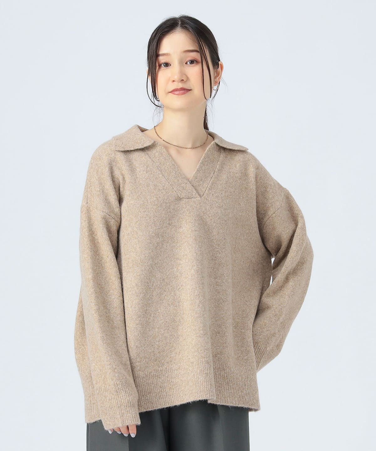 얼굴선을 깔끔하게 보이게 하는 스키퍼 칼라 디자인 이 돋보이는 니트 풀오버입니다. 몸의 라인을 드러내지 않는 오버사이즈 실루엣으로 편안한 착용감을 제공합니다.