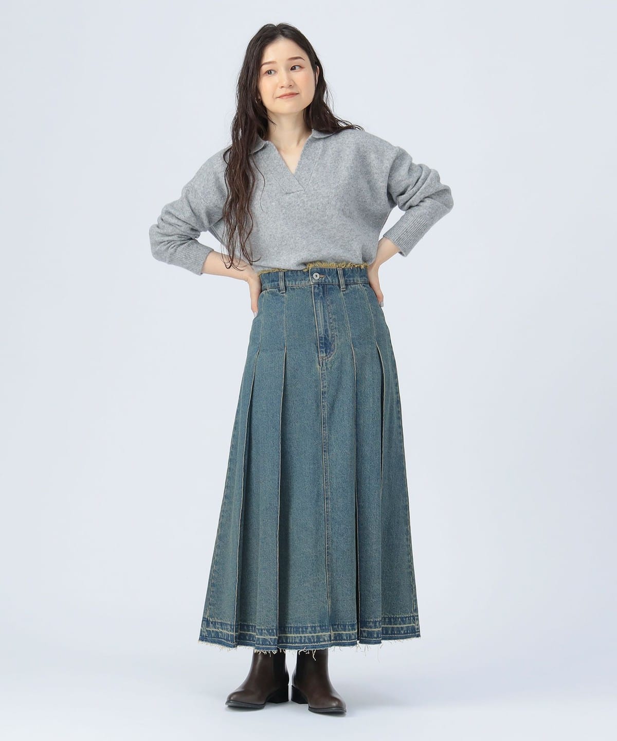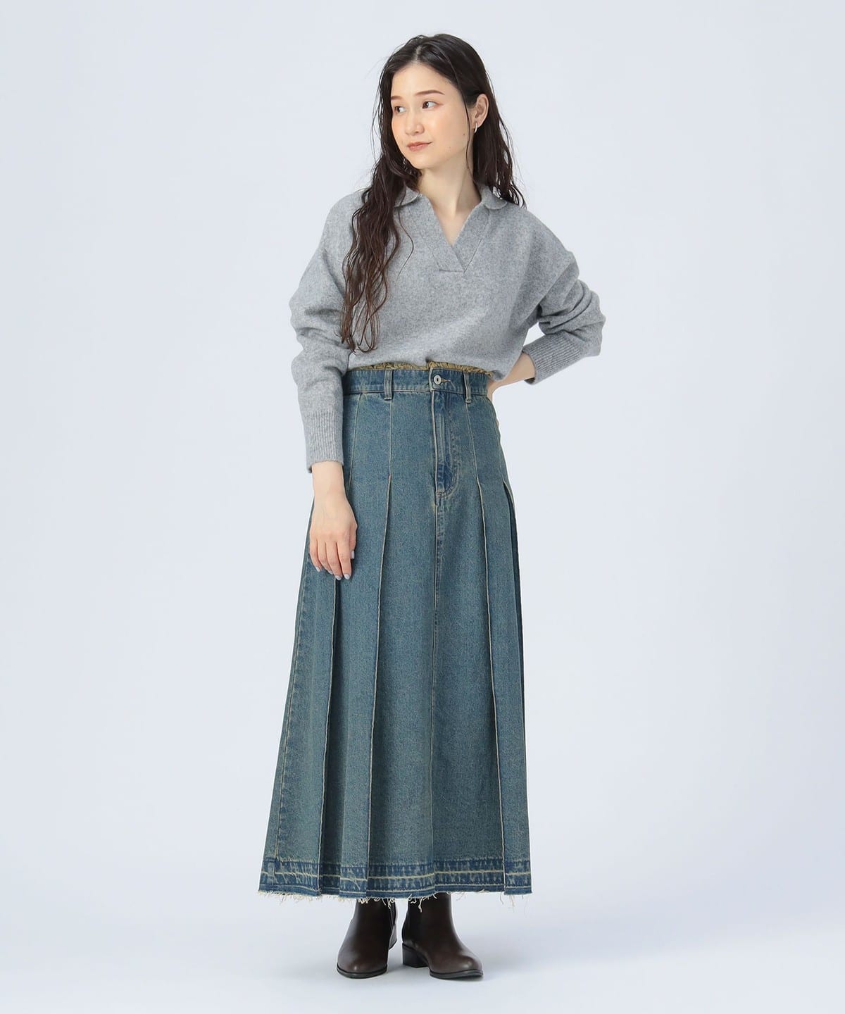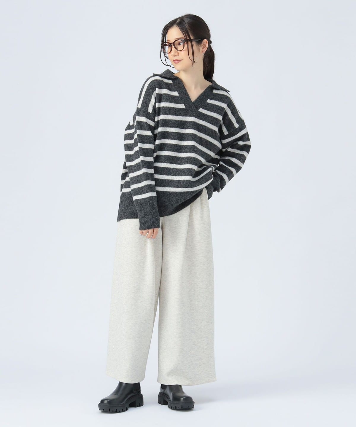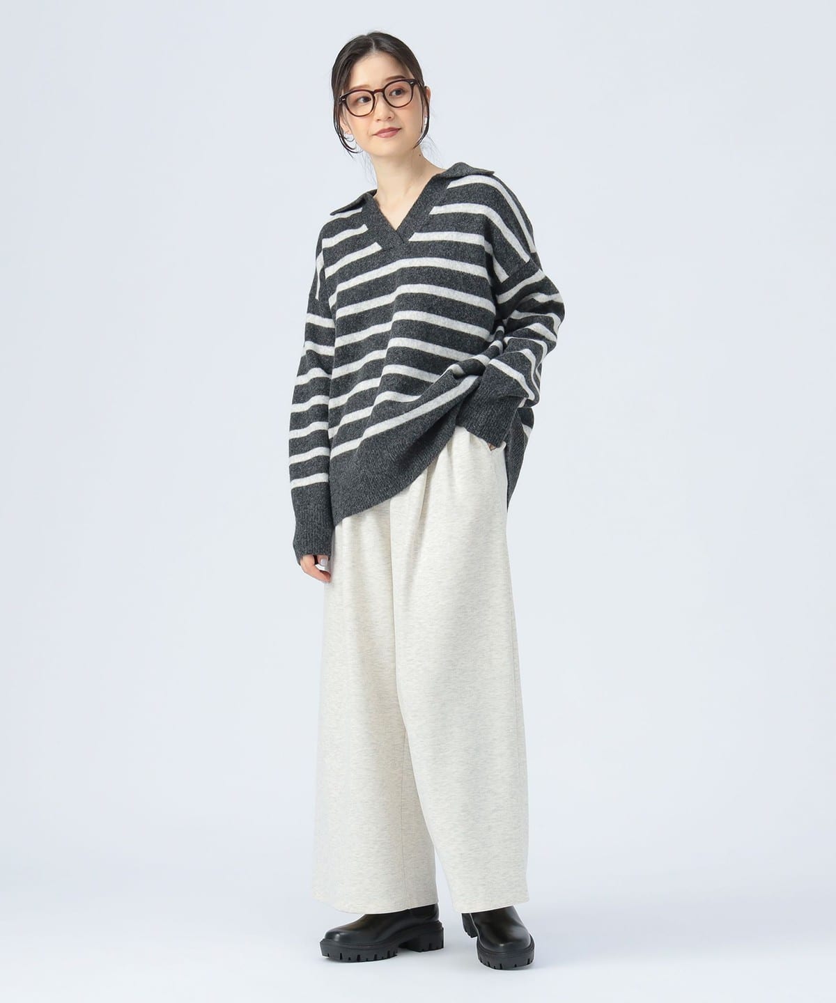 얼굴선을 깔끔하게 보이게 하는 스키퍼 칼라 디자인 이 돋보이는 니트 풀오버입니다. 몸의 라인을 드러내지 않는 오버사이즈 실루엣으로 편안한 착용감을 제공합니다.