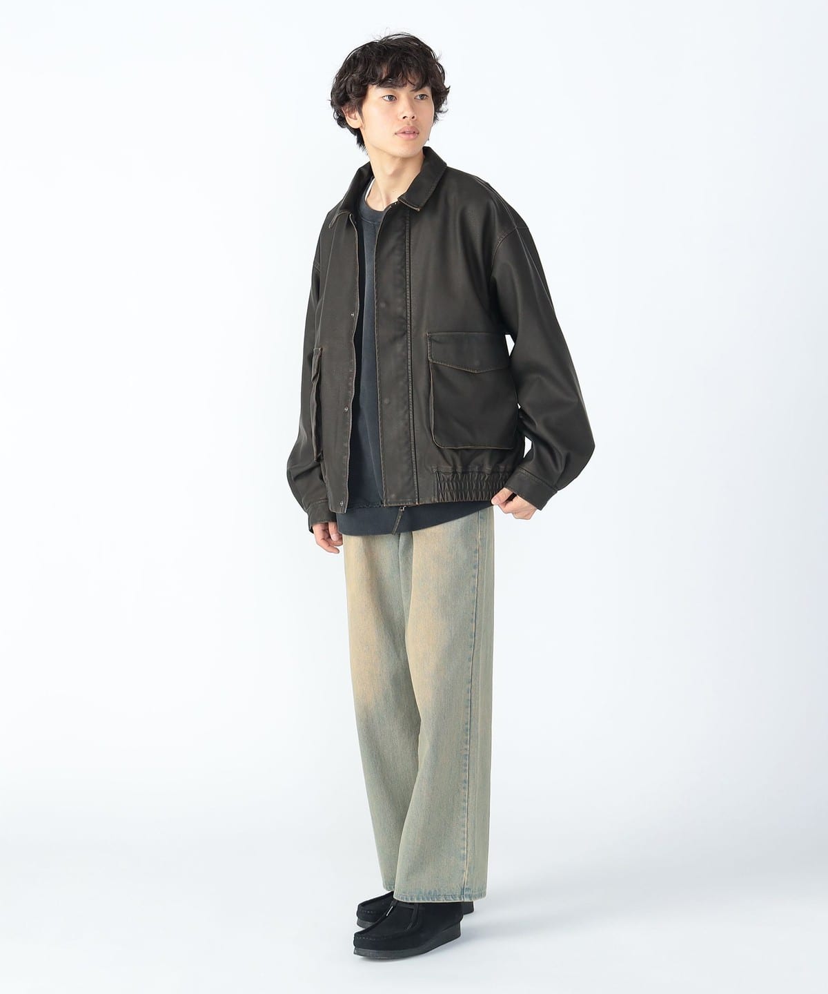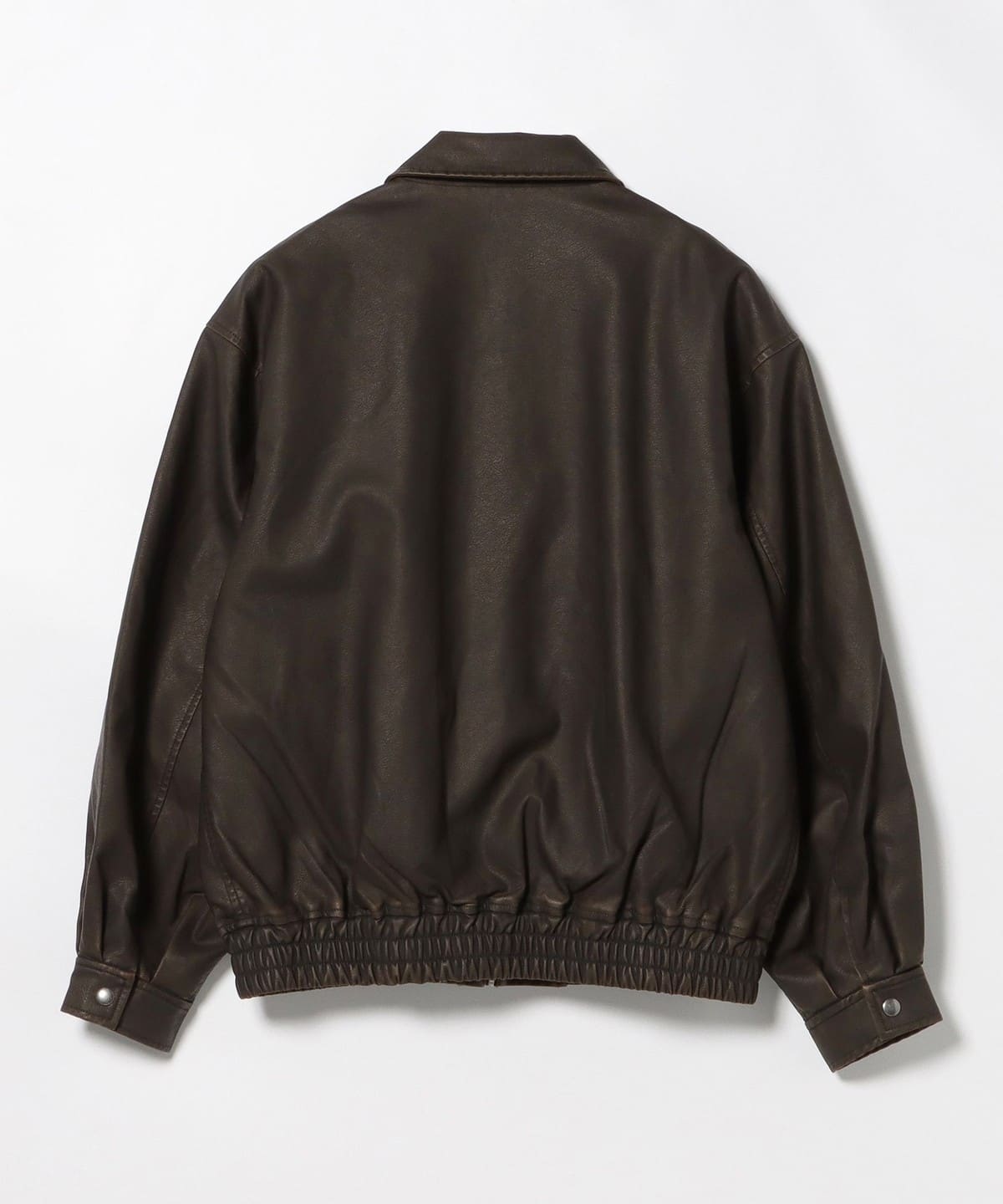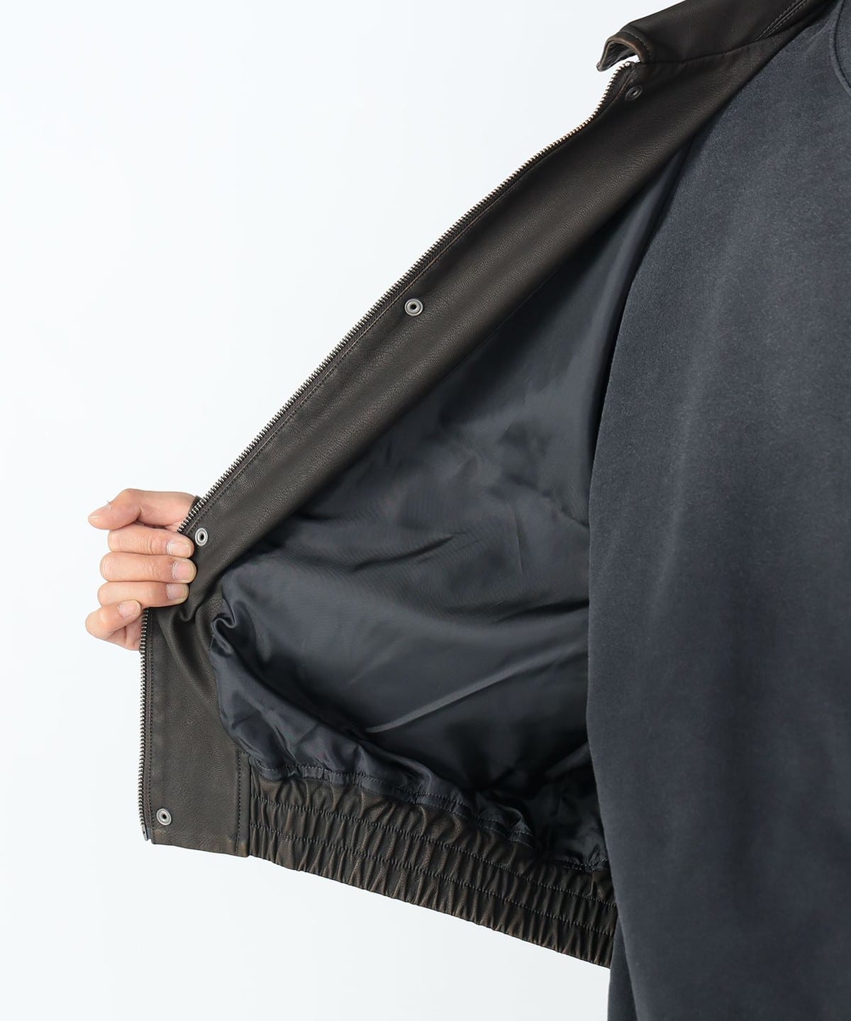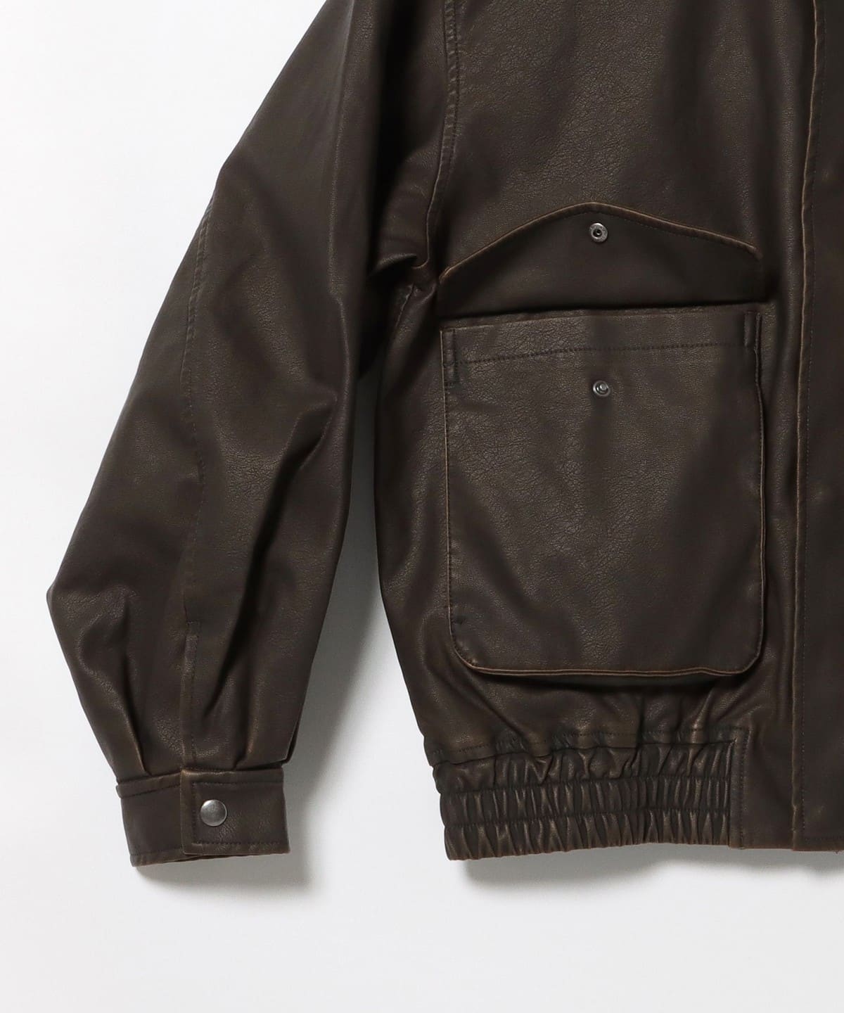 빈티지 밀리터리웨어를 연상시키는 페이크 레더 블루종 입니다. A-2 타입처럼 리브 마감이 아닌, 셔링과 커프스 디테일 을 적용해 투박하면서도 개성 있는 분위기를 연출했습니다.