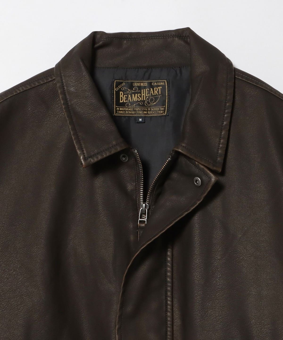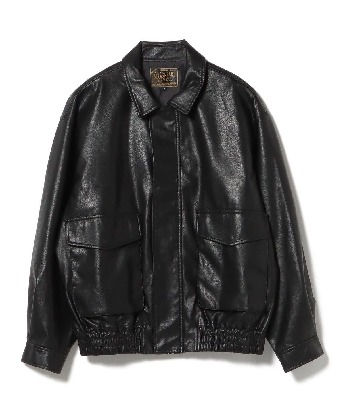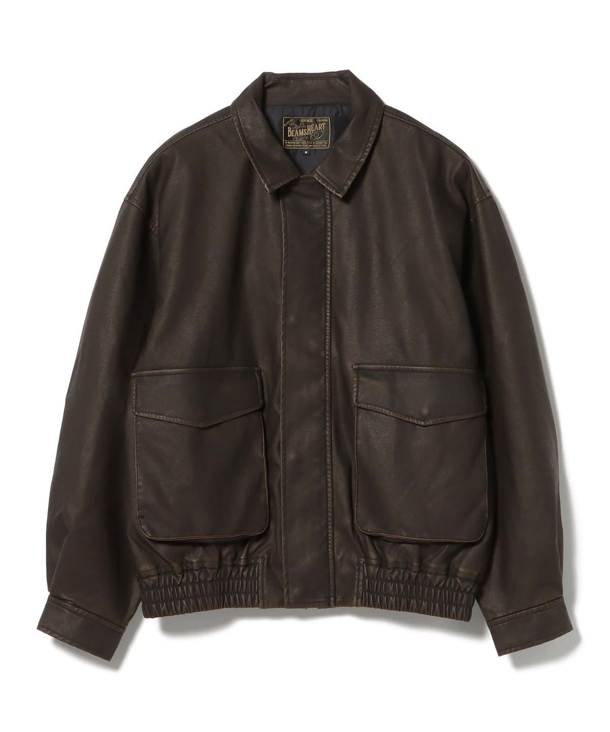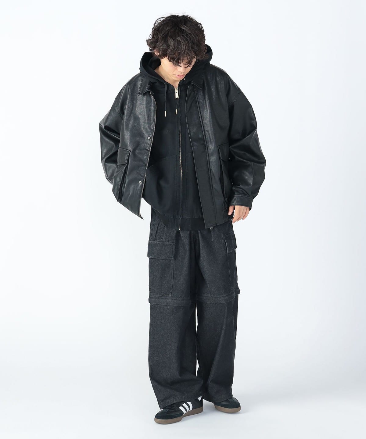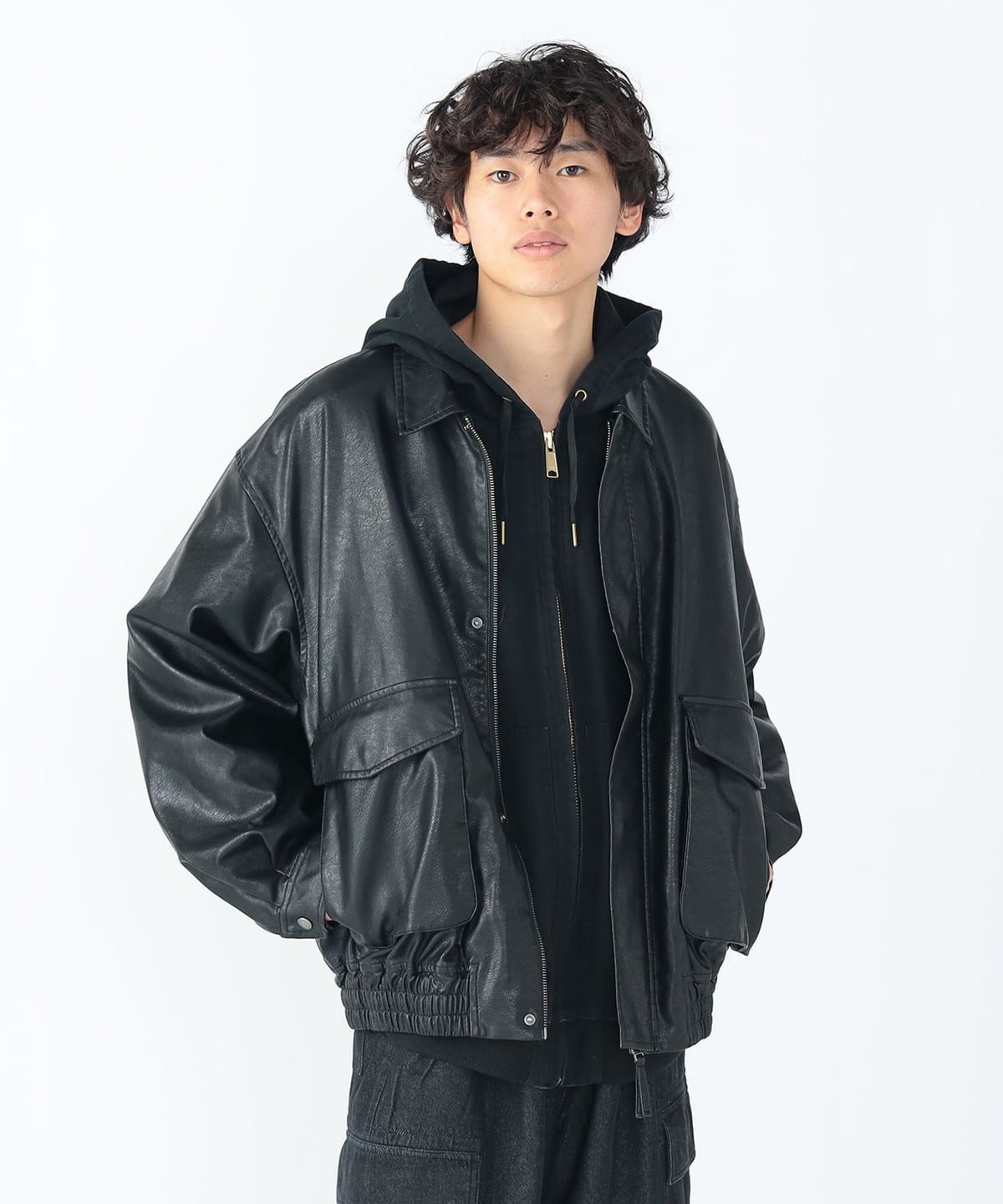 빈티지 밀리터리웨어를 연상시키는 페이크 레더 블루종 입니다. A-2 타입처럼 리브 마감이 아닌, 셔링과 커프스 디테일 을 적용해 투박하면서도 개성 있는 분위기를 연출했습니다.