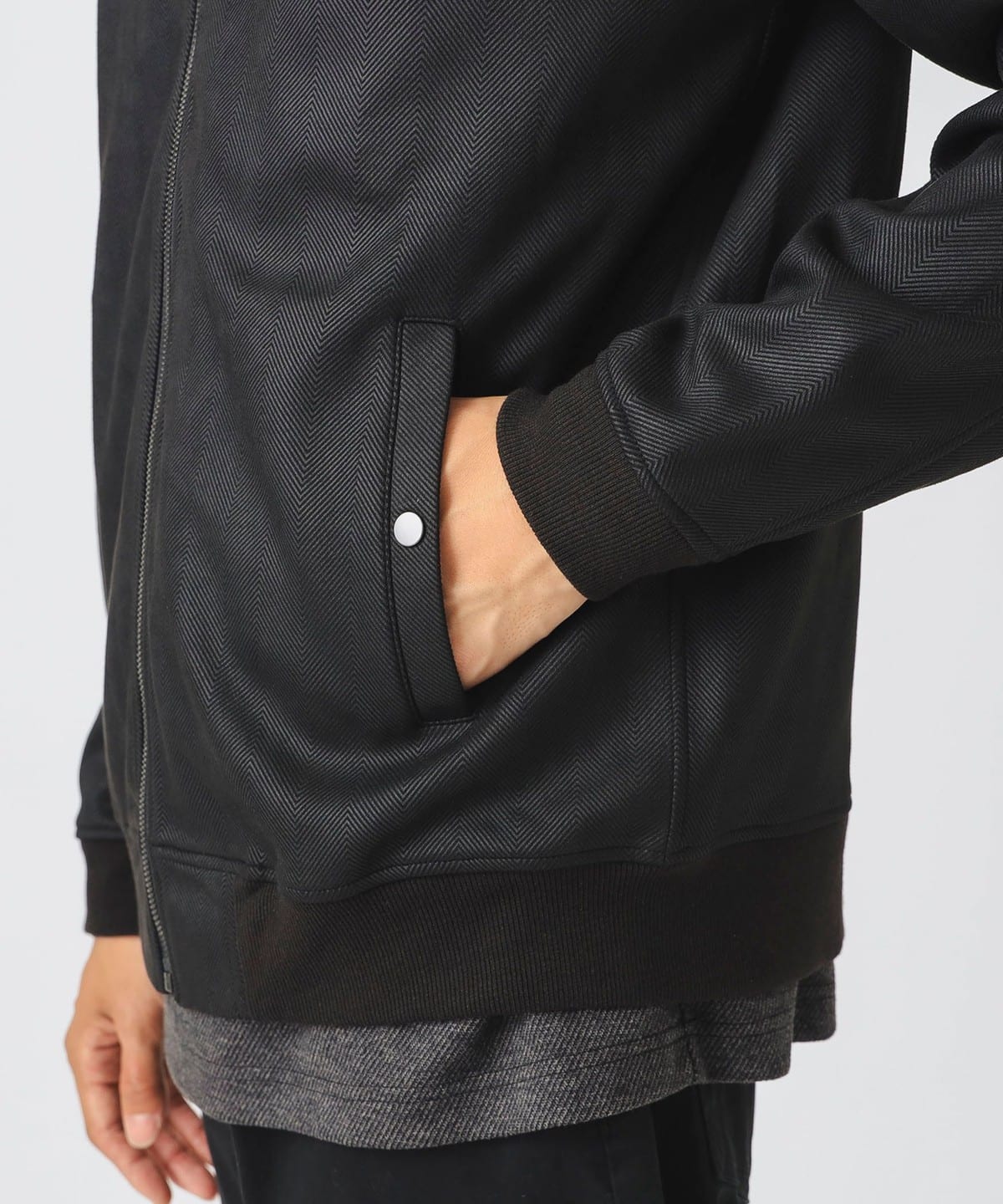 부드러운 페이크 스웨이드 원단에 투명 염료로 프린트를 입히는 독특한 공법을 사용하여, 동일한 색상의 명암 차이로 은은한 패턴을 표현했습니다. 프론트 지퍼는 메탈릭 마감으로, 은은한 광택과 고급스러움을 더했습니다.