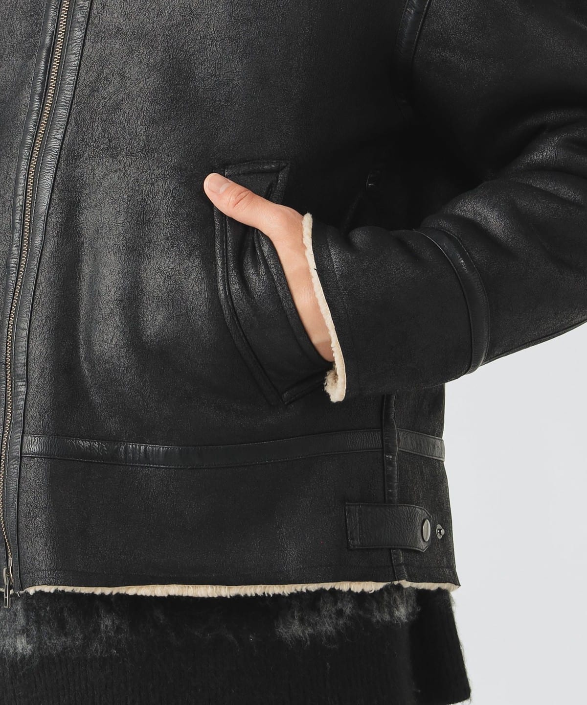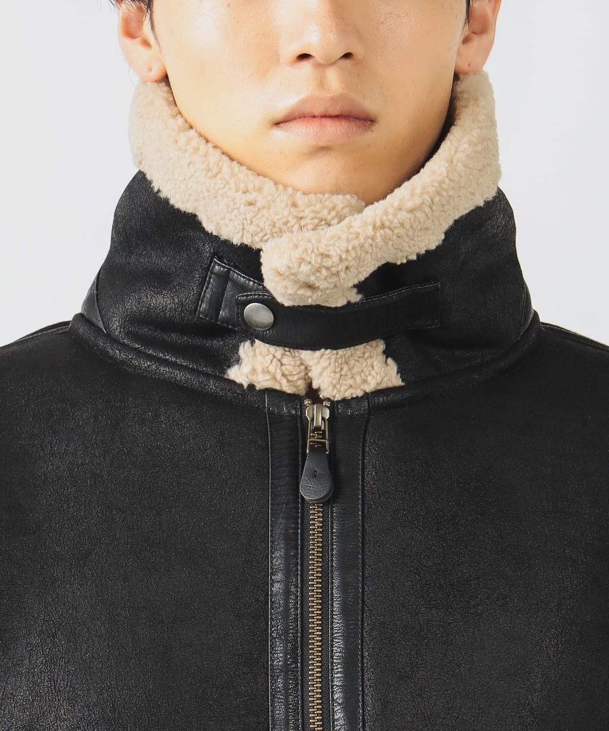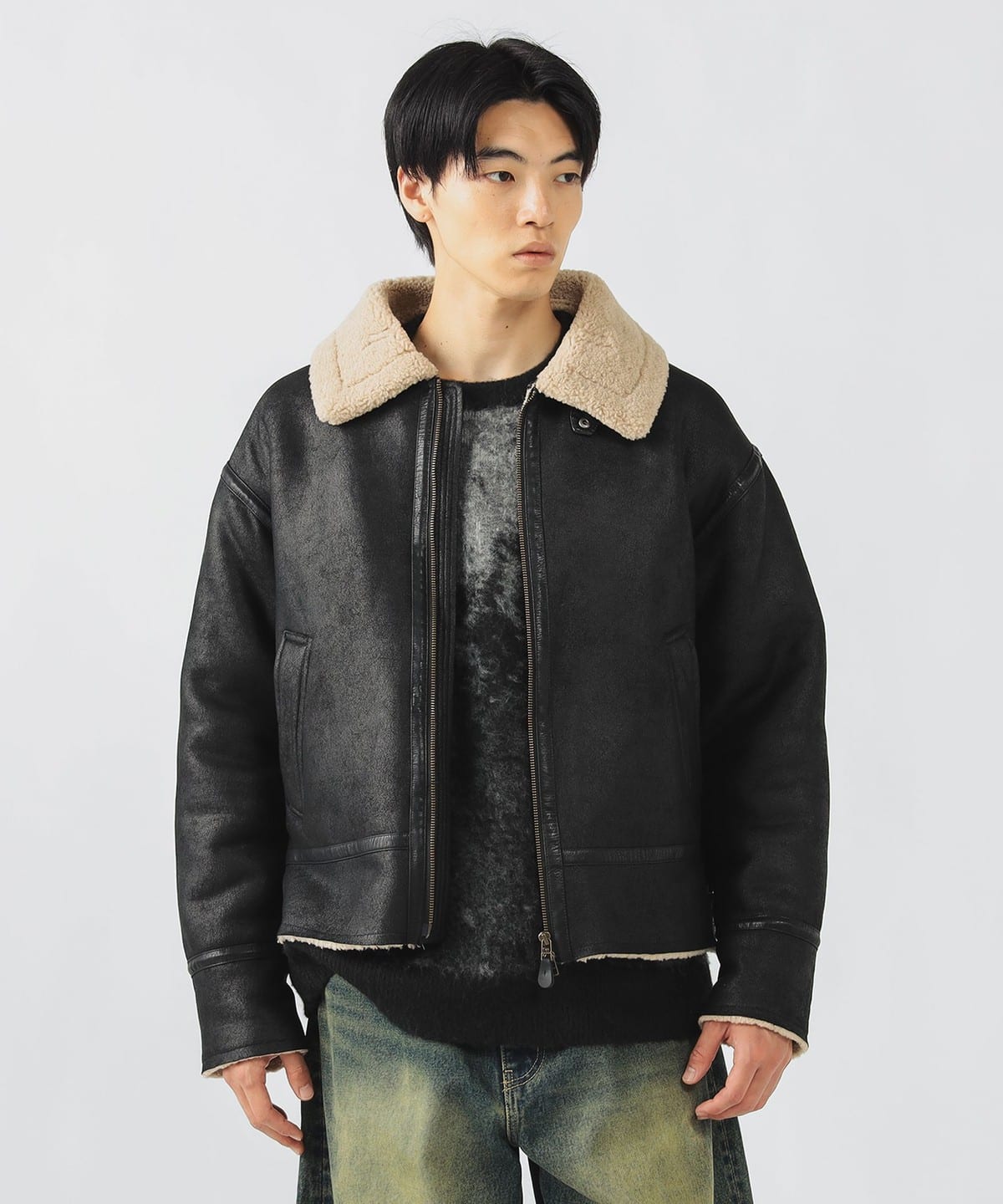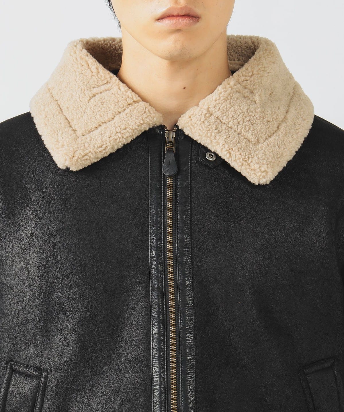 거친 크랙 가공이 더해진 페이크 무스탕 소재와 컷오프된 밑단이 빈티지한 분위기를 연출하는 B-3 블루종 재킷입니다. 여유 있는 릴랙스 핏과 적당한 기장감으로 트렌디한 실루엣을 완성했으며, 소매를 롤업해 길이를 조절할 수 있습니다.