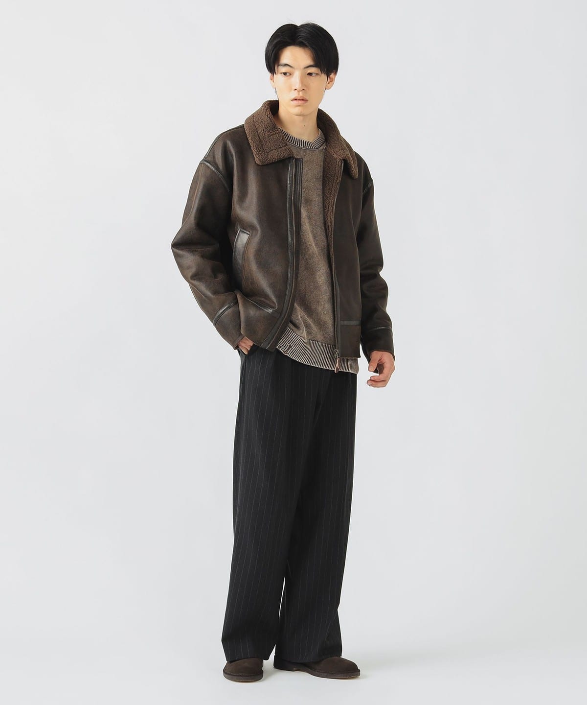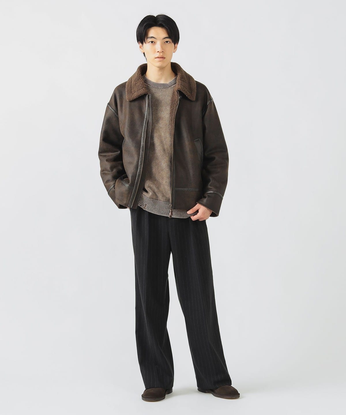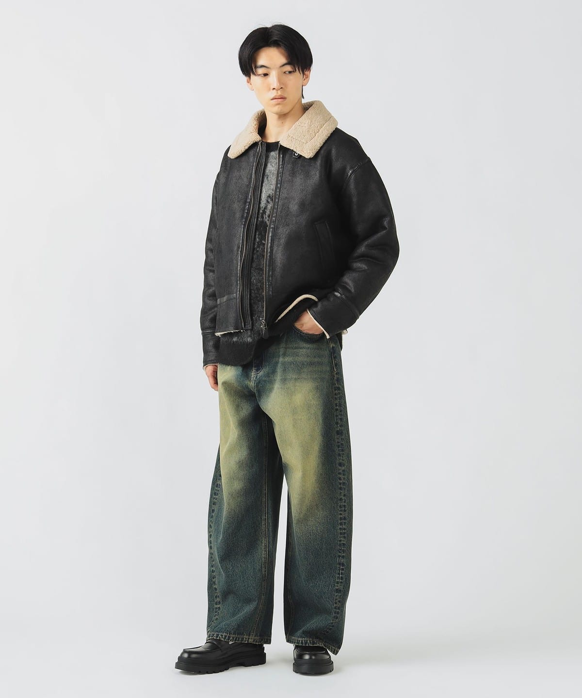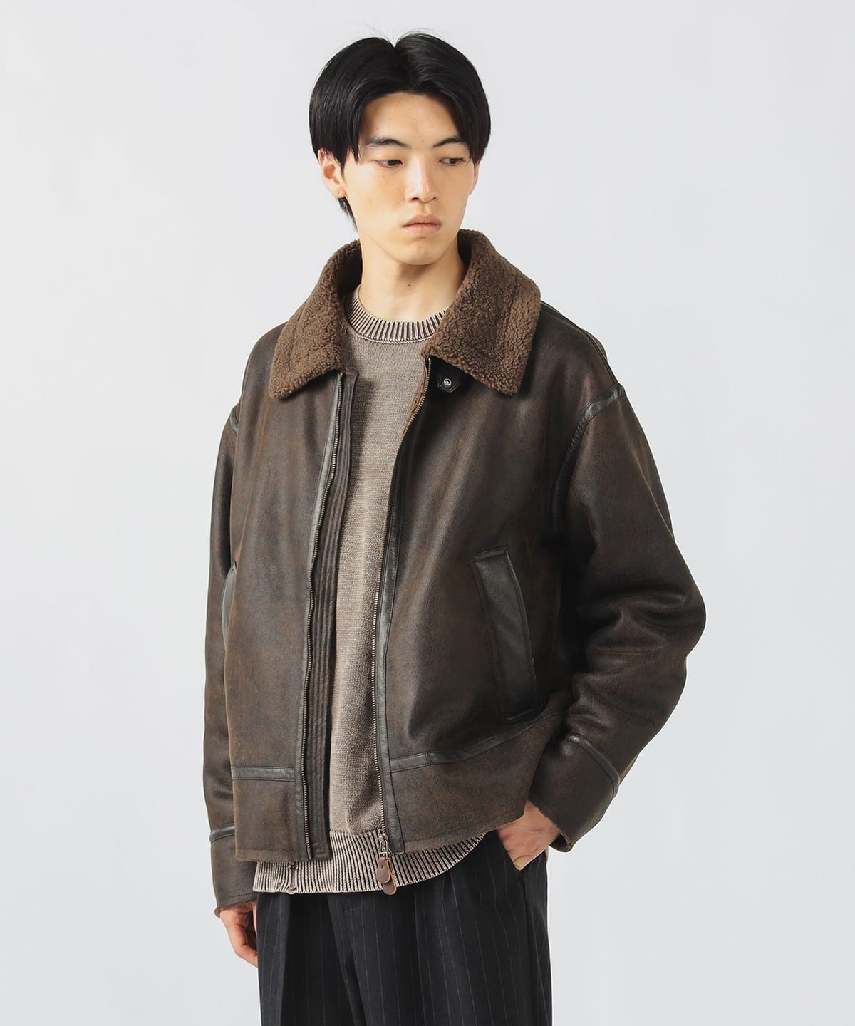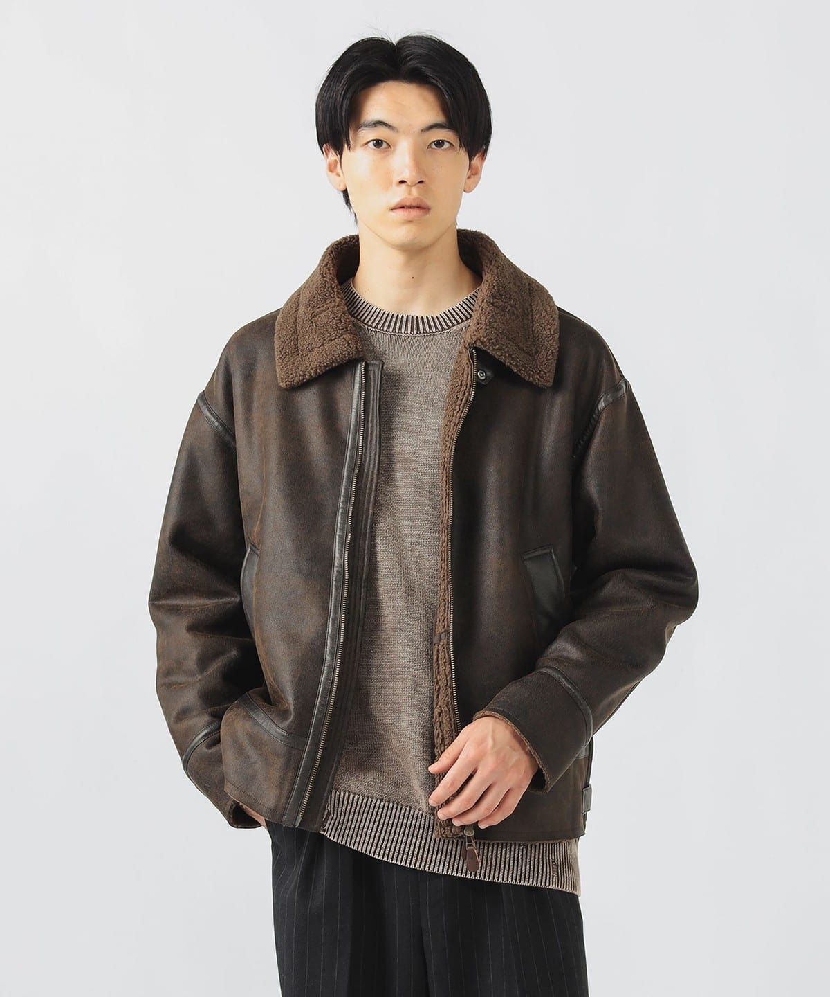 거친 크랙 가공이 더해진 페이크 무스탕 소재와 컷오프된 밑단이 빈티지한 분위기를 연출하는 B-3 블루종 재킷입니다. 여유 있는 릴랙스 핏과 적당한 기장감으로 트렌디한 실루엣을 완성했으며, 소매를 롤업해 길이를 조절할 수 있습니다.