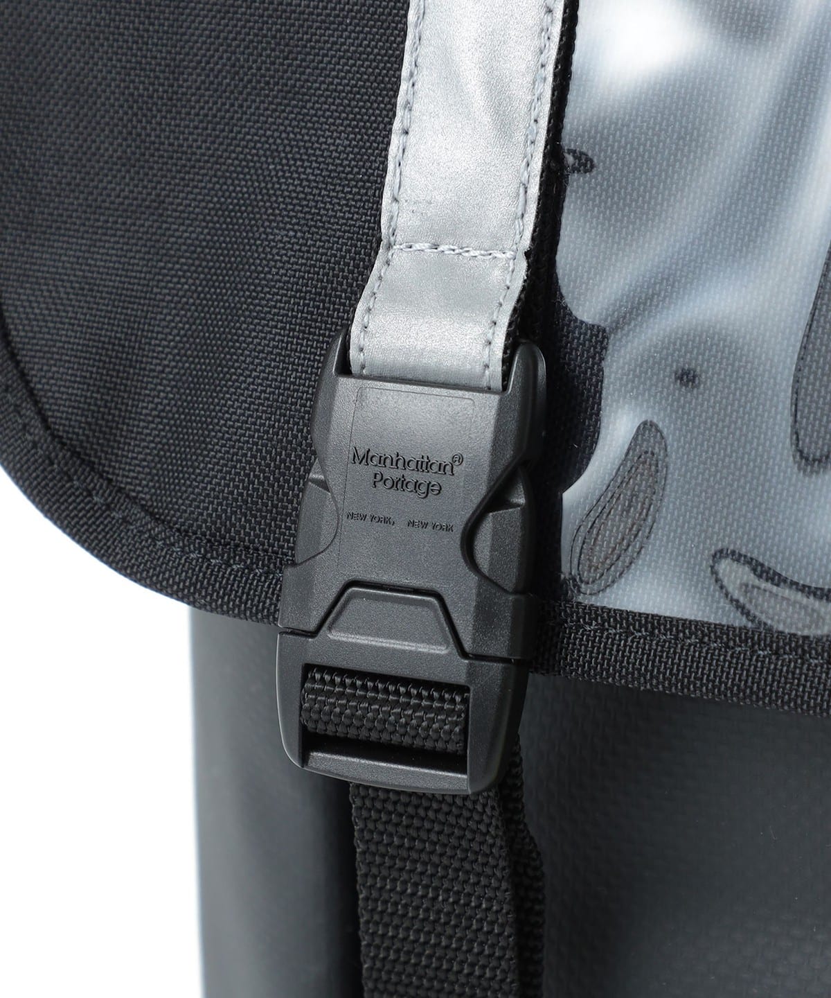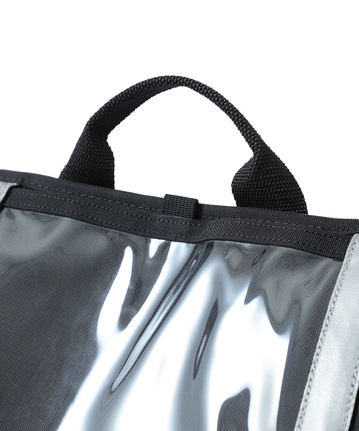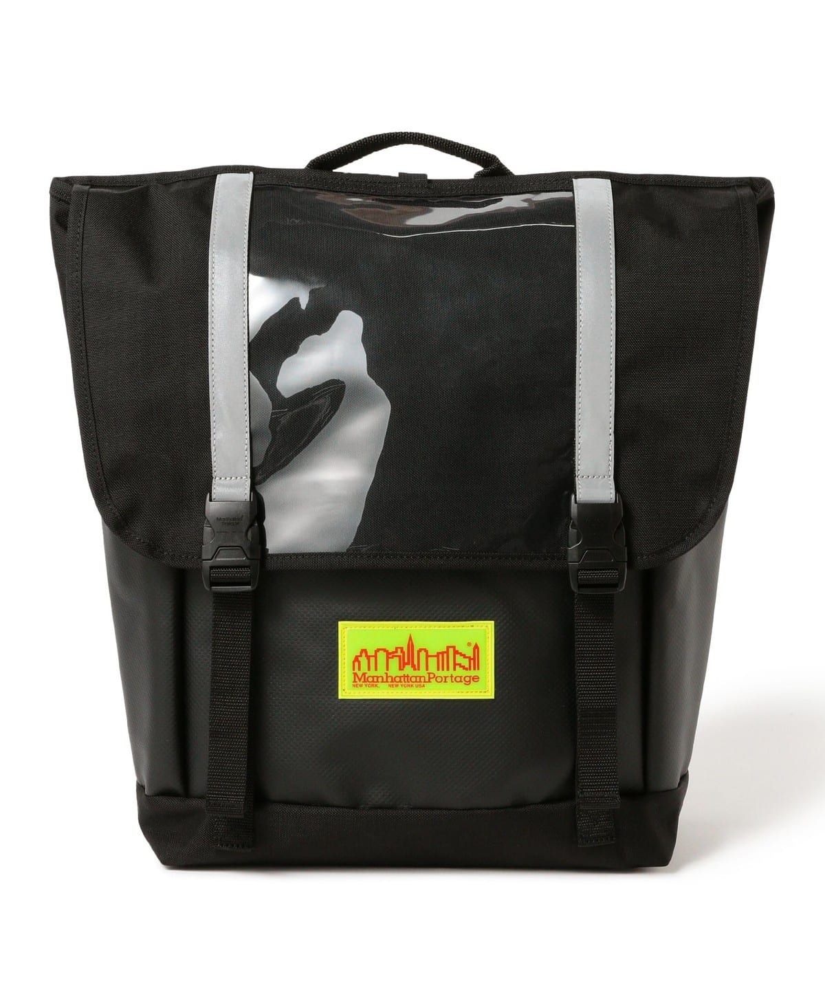 플랩에는 투명 비닐 포켓과 리플렉터 테이프가 있습니다. 기존 프론트 포켓에 더해 사이드까지 연장된 포켓은 접이식 우산이나 작은 물건을 수납하기 좋습니다.