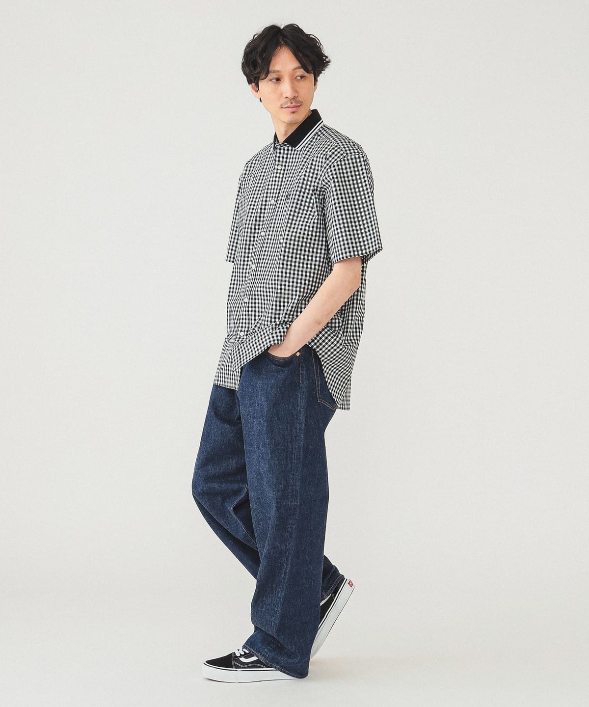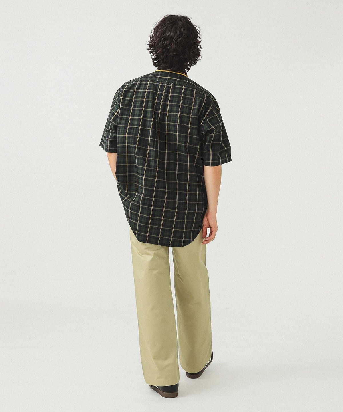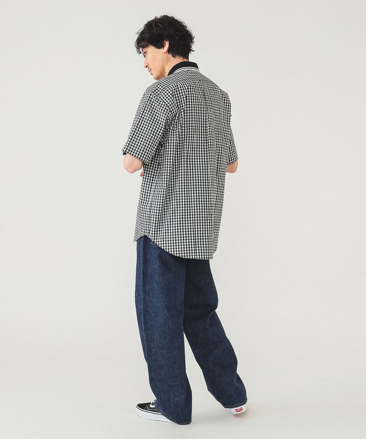 넥라인은 리브 칼라 디자인이며 체크 패턴이 스타일링의 시각적 포인트가 됩니다.