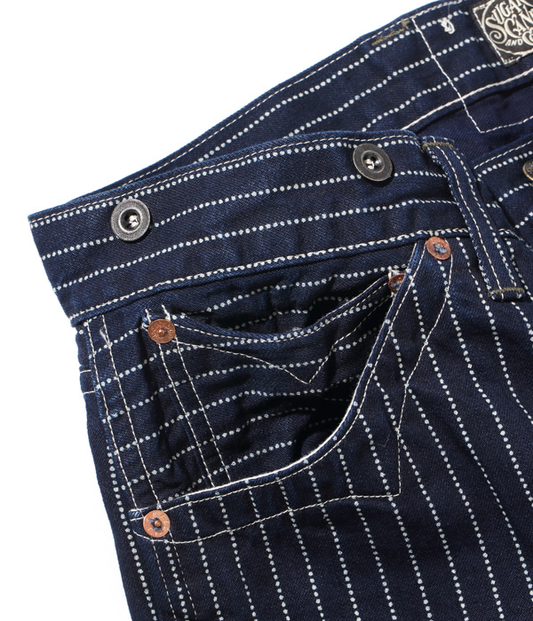 20세기 초 워크 팬츠에서 볼 수 있는 곡선형 포켓 형태와 포켓 입구의 스티치 작업 등 정교하고 고급스러운 디테일이 특징입니다. 빈티지 베이스 모델에는 지퍼 프론트 타입이 존재하지 않지만, 역사적 증거의 일관성을 보장하기 위해 같은 시대의 빈티지 재킷에 사용되는 HOOKLESS 지퍼를 사용합니다.