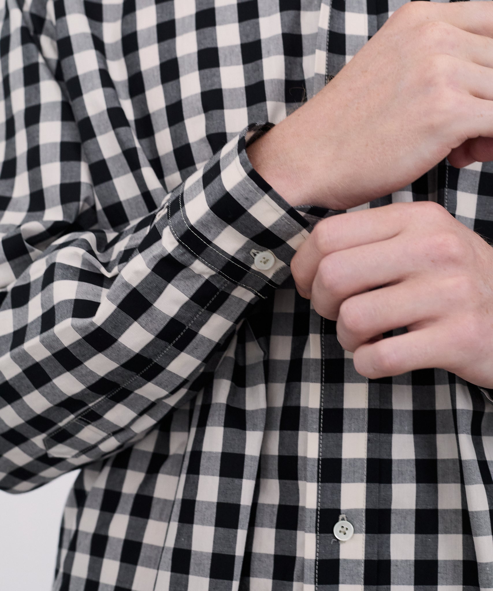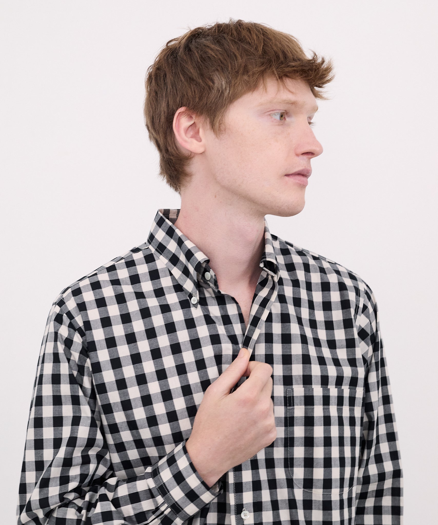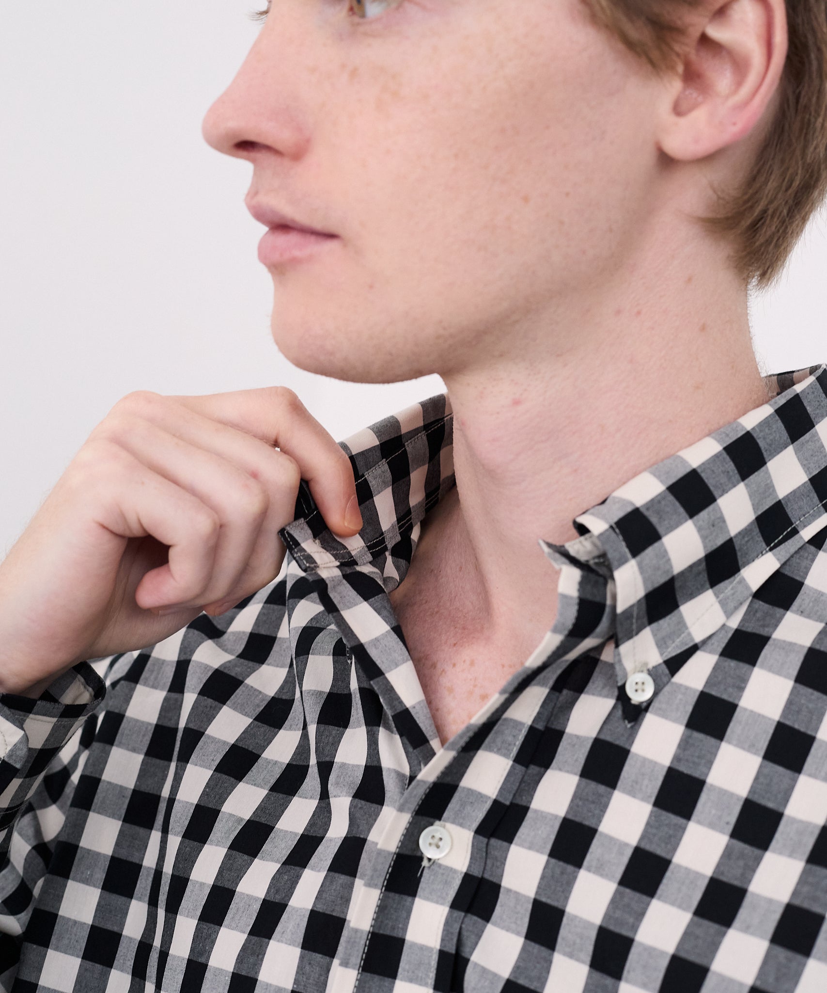 특징적인 여섯 개 버튼 구성과 함께, 목라인은 셔츠의 ‘롤’이 아름답게 드러나도록 고안된 3핑거 롤 디자인입니다.