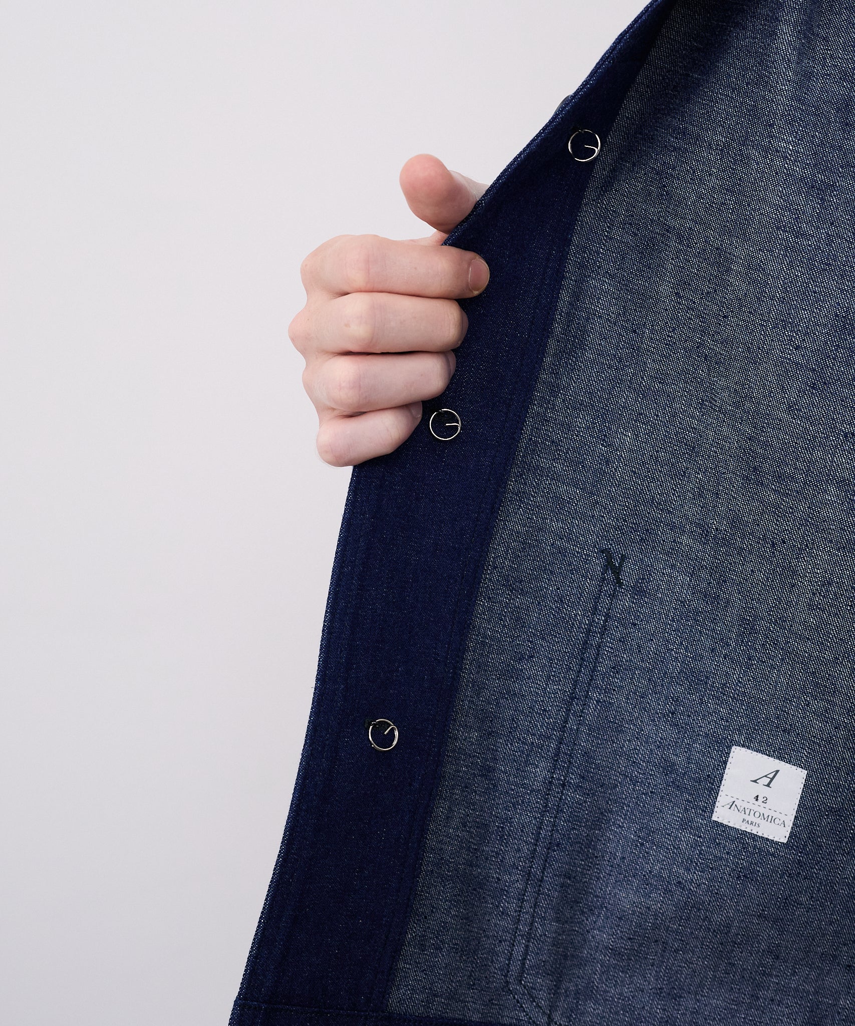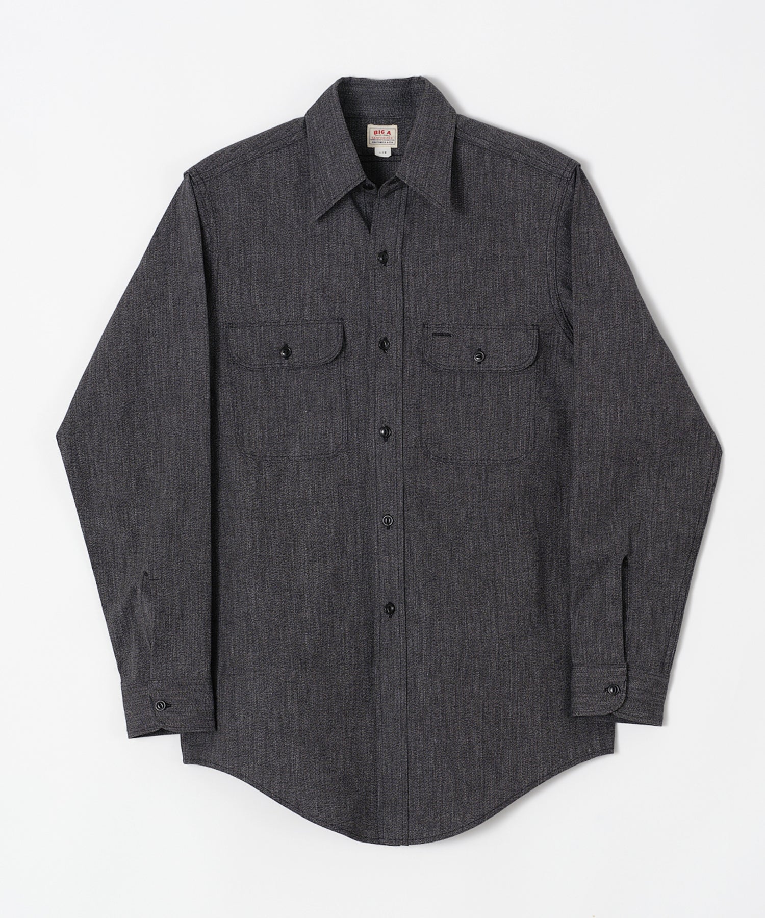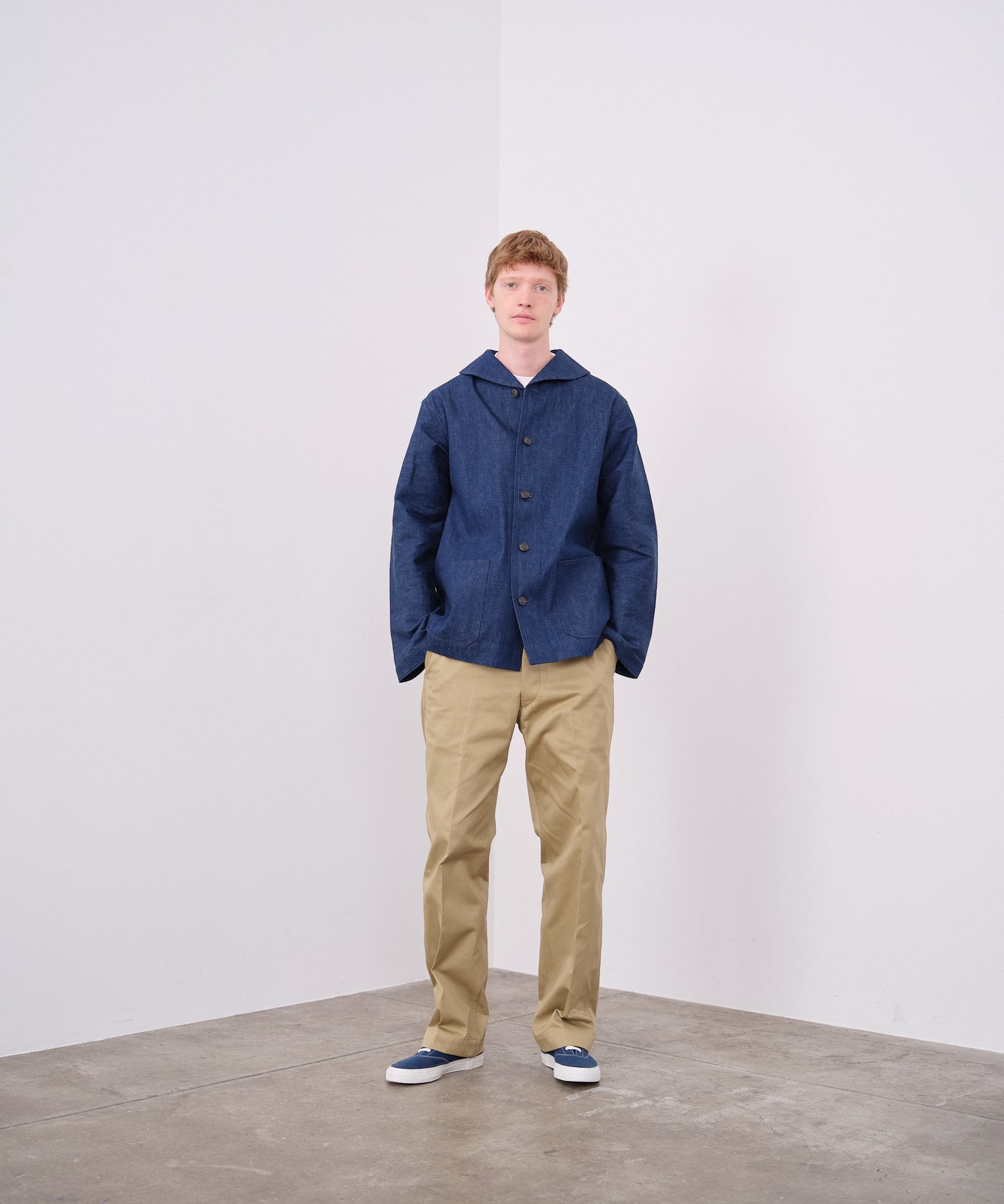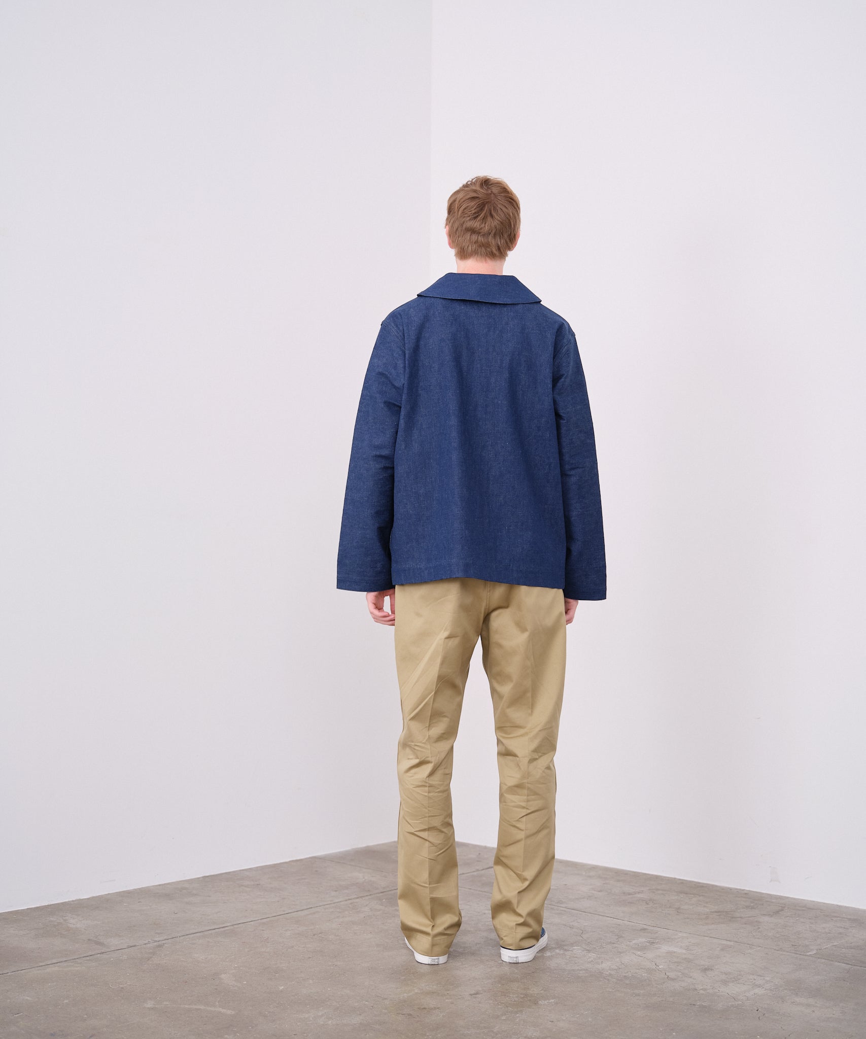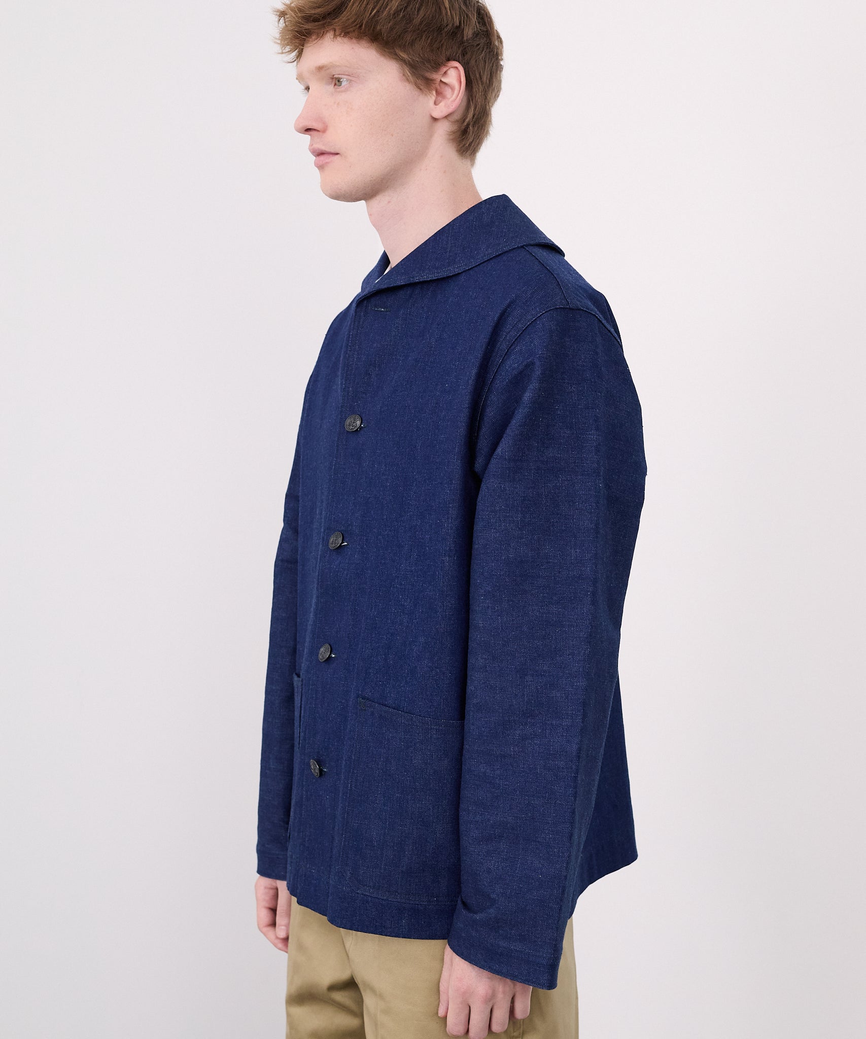 1940년대 U.S.NAVY 숄 컬러의 데님 작업복을 재현한 재킷. 차콜 그레이 스티치, 와인딩 스티치를 사용합니다. 버튼에는 앵커 마크와 NAVY가 새겨져 있습니다.