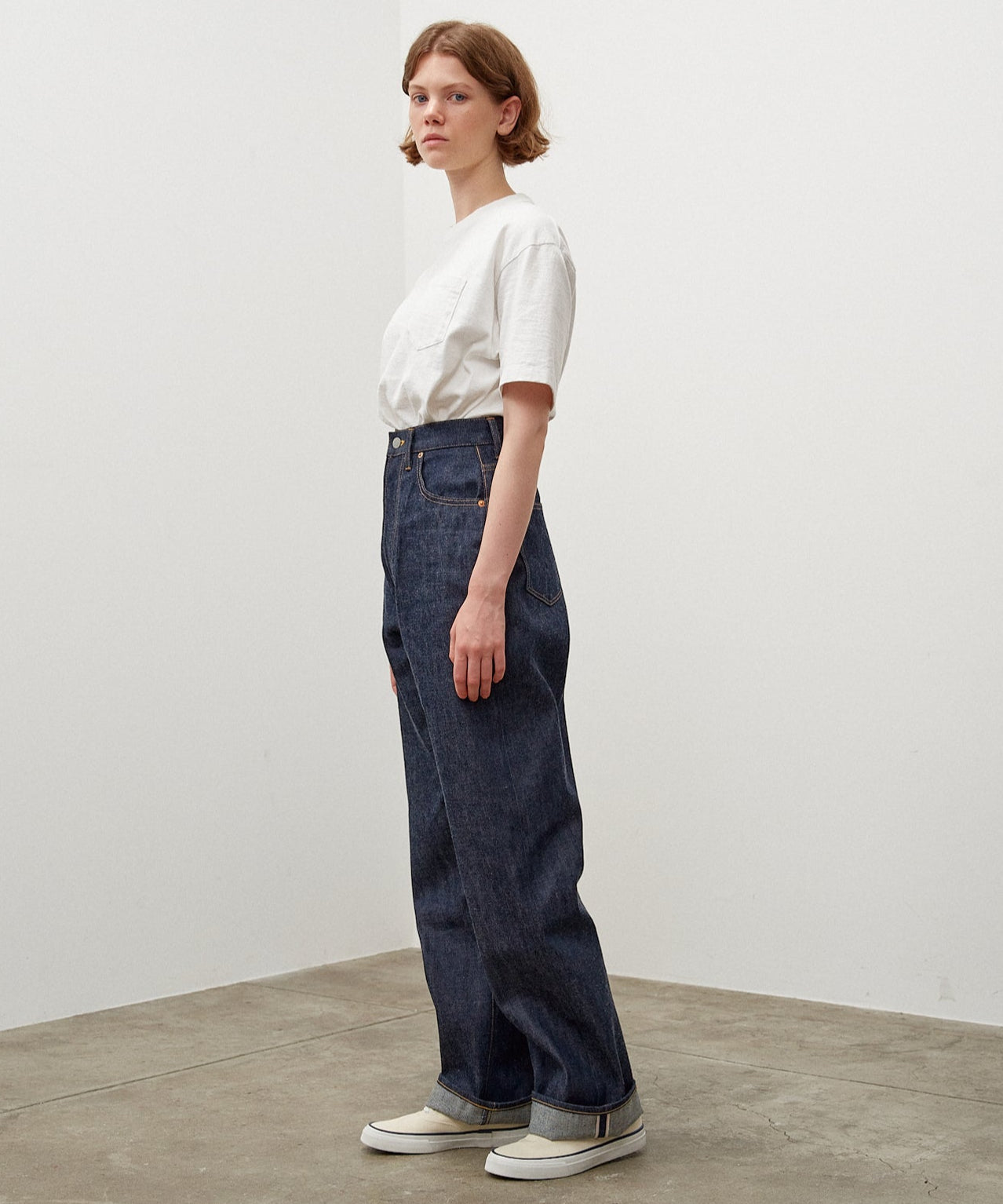 - 밑위가 깊어 다리가 길어 보이는 효과 도 기대할 수 있으며, 상의를 넣어 입는 스타일 이 이 팬츠의 매력을 가장 잘 살릴 수 있는 코디입니다.