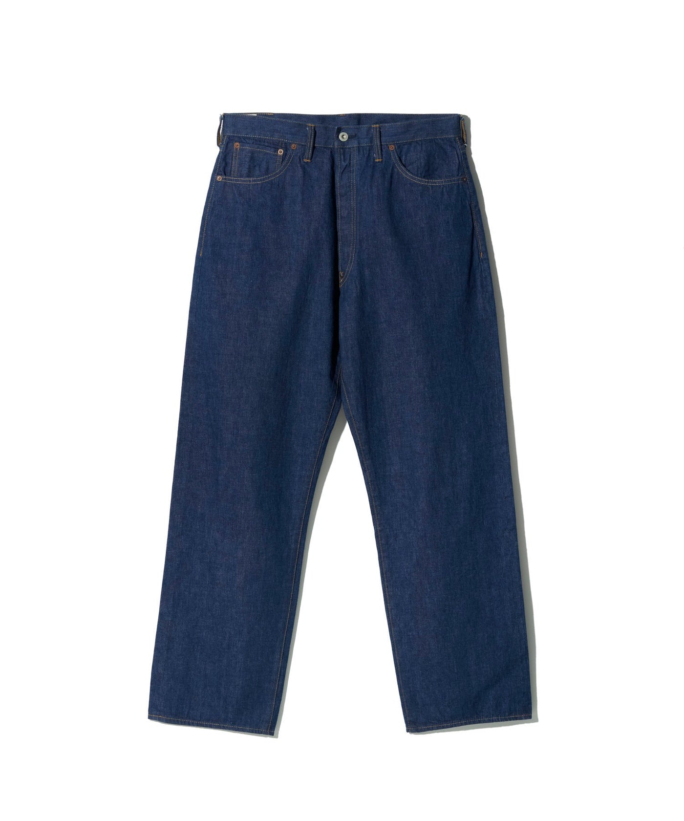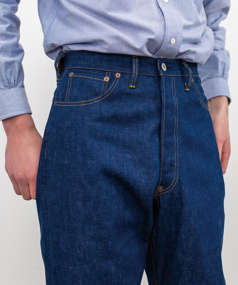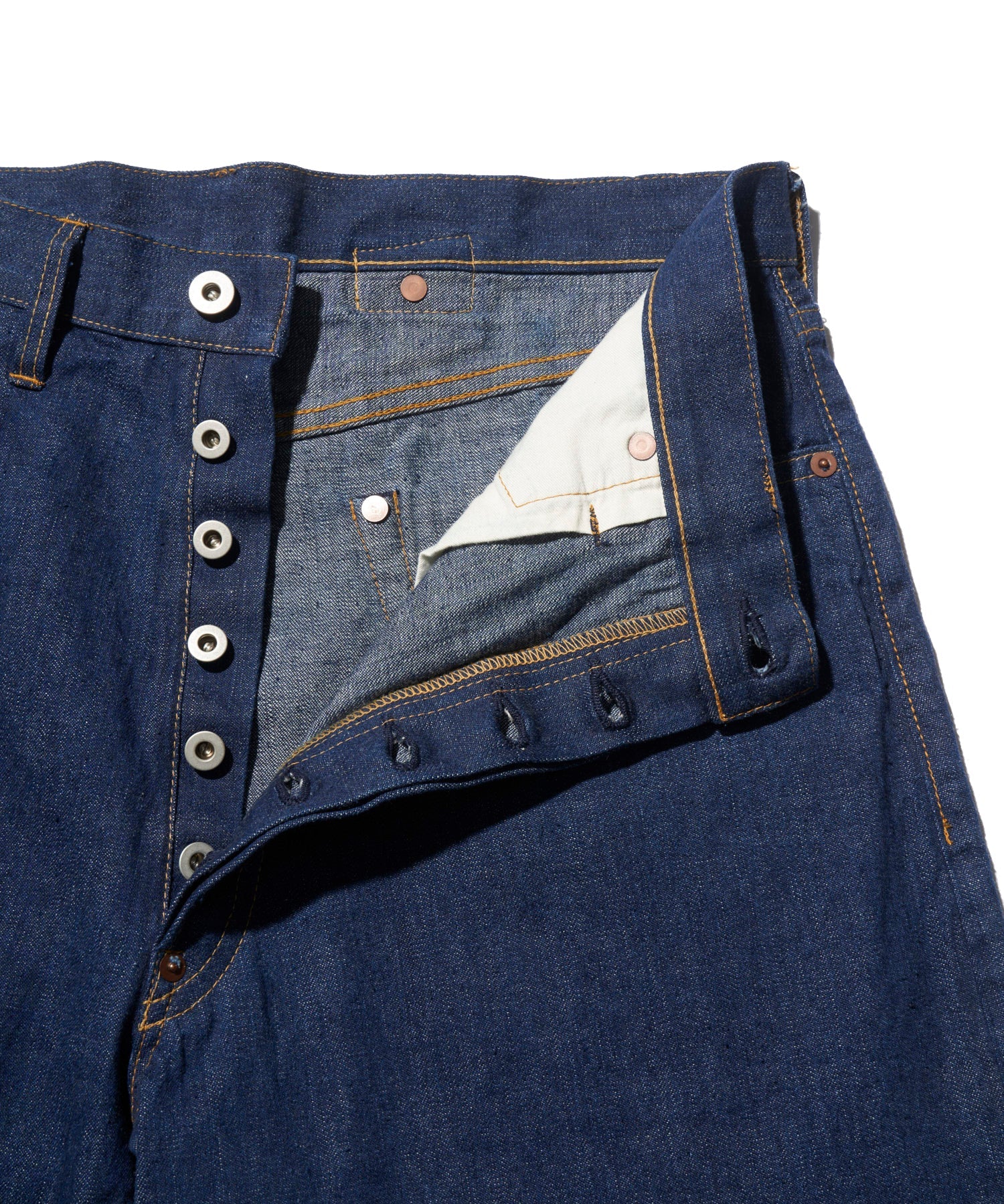 앞면은 버튼 플라이, 가랑이 아래쪽의 리벳, 뒷면의 신치 백, 천 라벨, 오렌지와 옐로우의 투톤 스티치 워크로 빈티지를 충실히 재현했습니다.