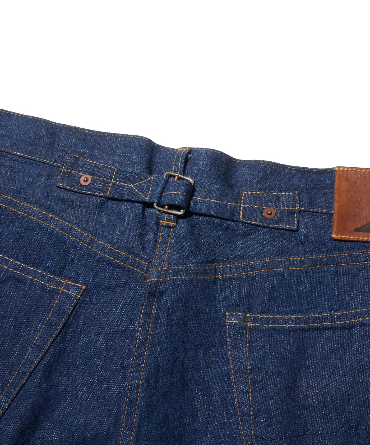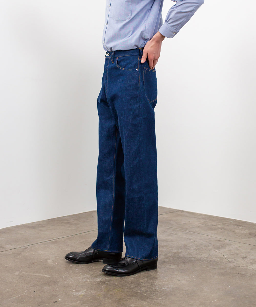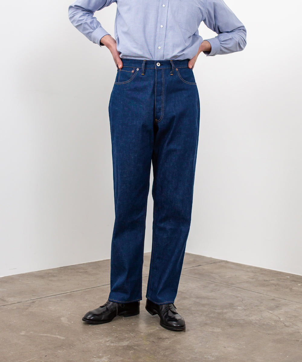 앞면은 버튼 플라이, 가랑이 아래쪽의 리벳, 뒷면의 신치 백, 천 라벨, 오렌지와 옐로우의 투톤 스티치 워크로 빈티지를 충실히 재현했습니다.