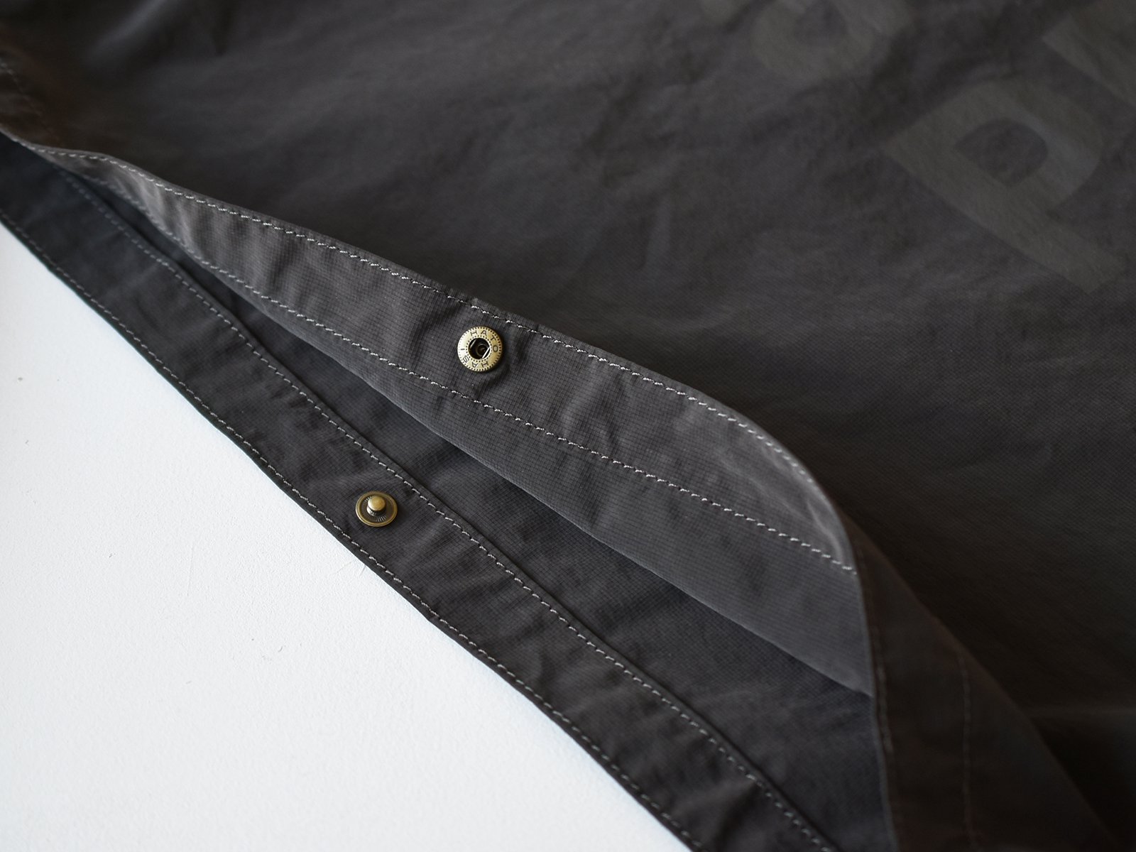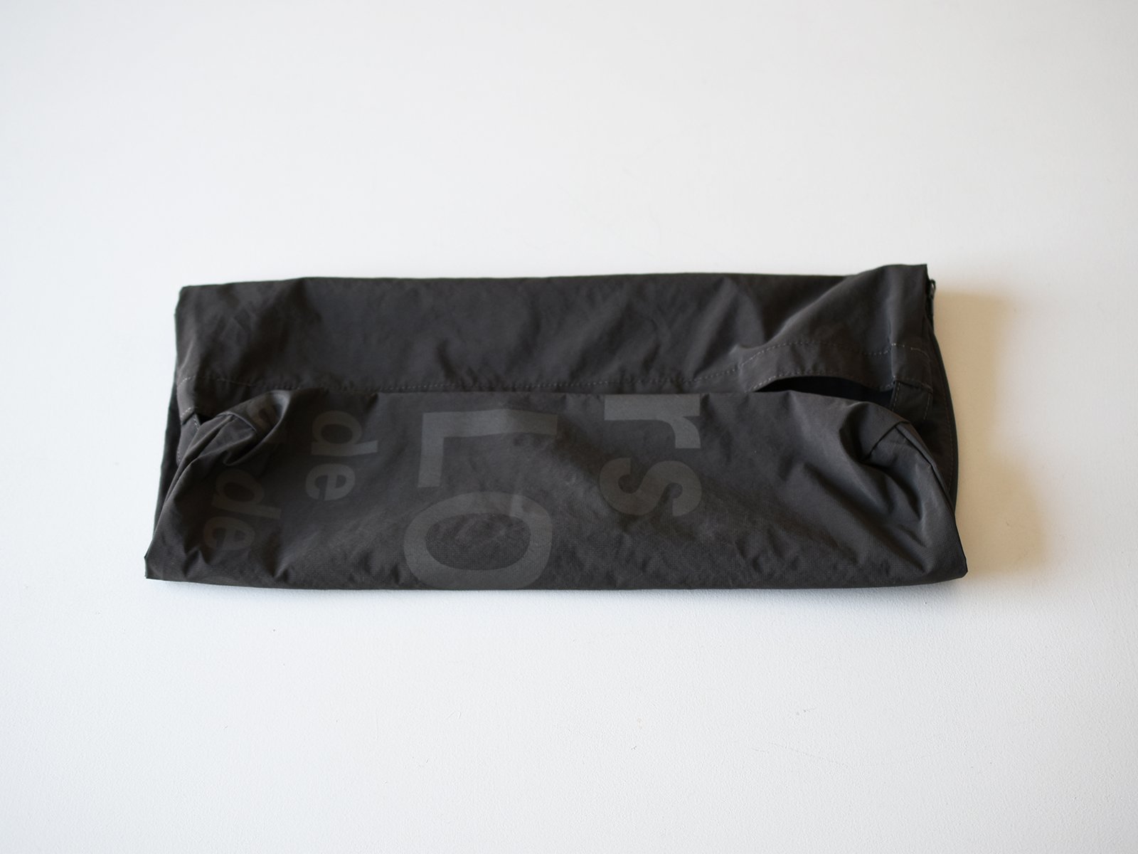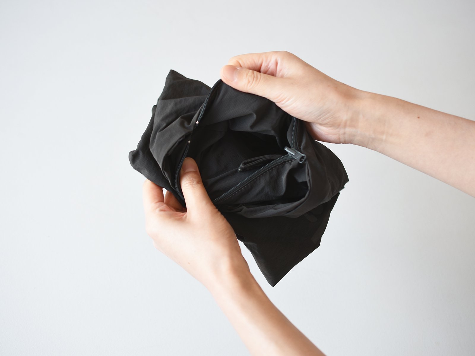 입가에 후크가 붙어 있습니다. 바디 사이드에는 지퍼가 달린 포켓이 붙어 있어, 포켓의 입구 폭에 맞춰 3단 으로 접어 작게 말아 넣어 포켓 안쪽에서 밀어내도록 뒤집으면, 컴팩트한 파우치 사이즈로 가지고 다닐 수 있습니다.