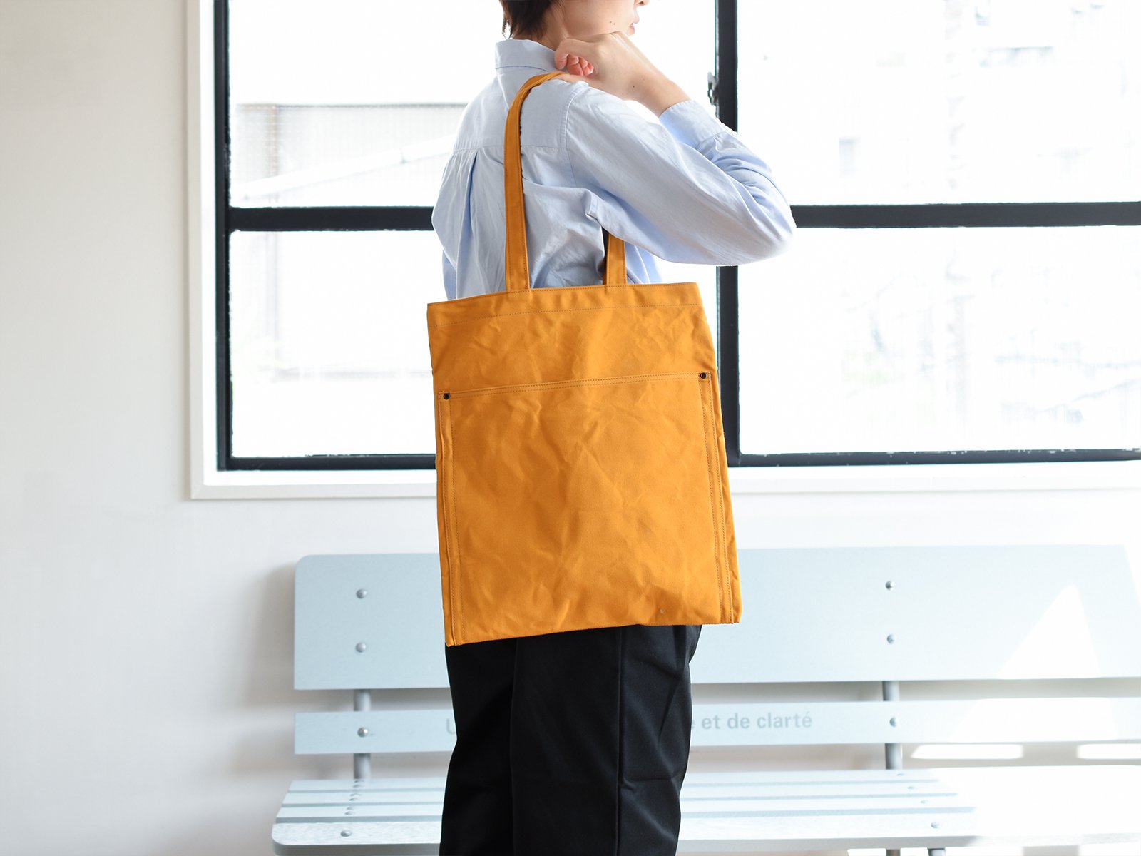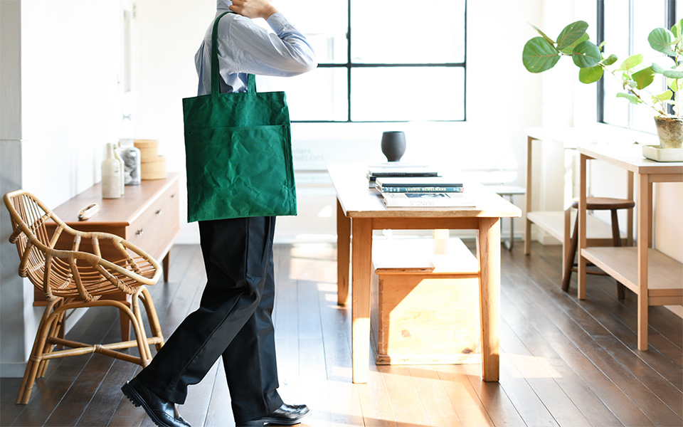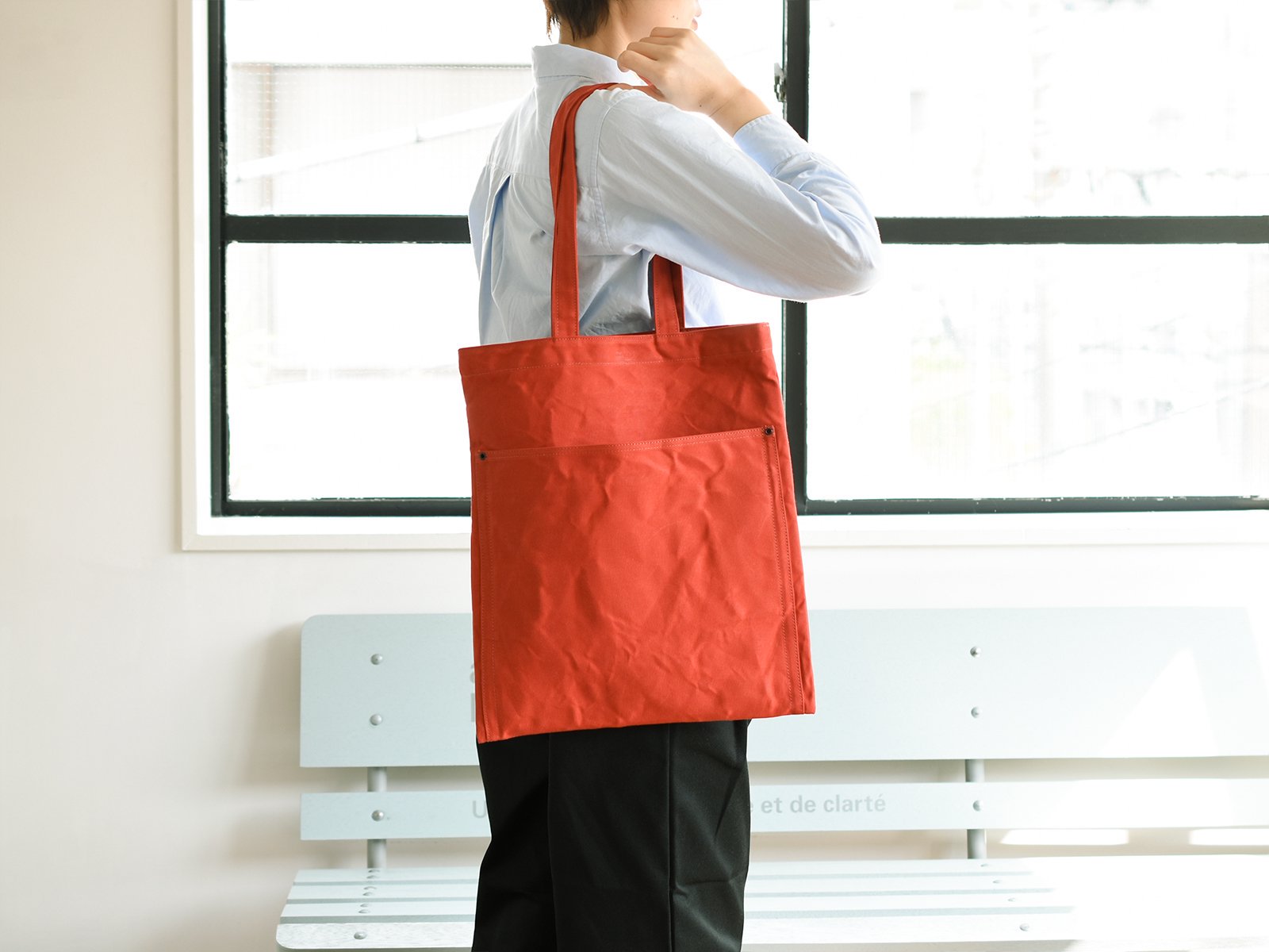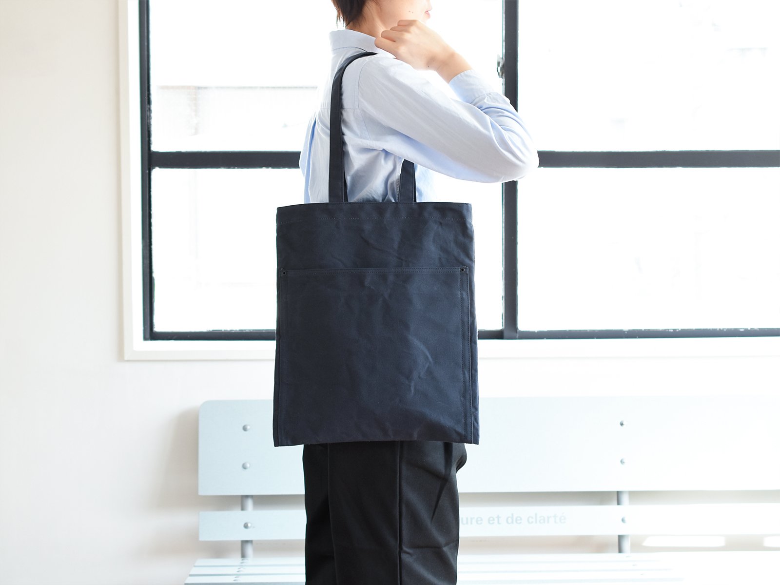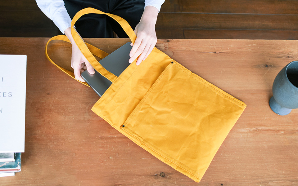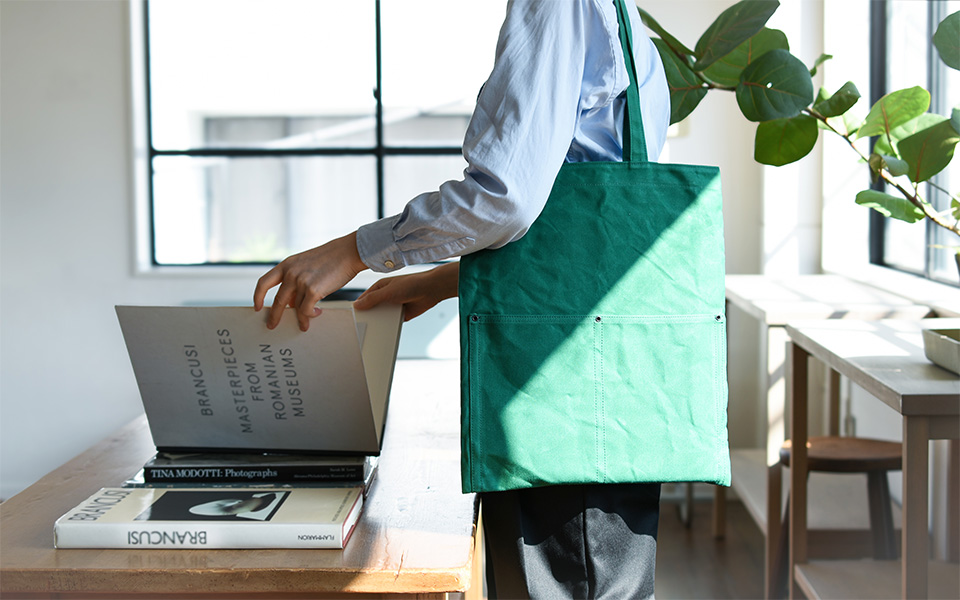 10호 파라핀 범포를 사용한 슬림한 디자인의 토트백. 서류나 노트북 수납에 적합한 사이즈로 어깨에 걸치기 쉽도록 핸들이 긴 디자인입니다. 총 7개의 포켓이 있어 수납이 편리합니다.