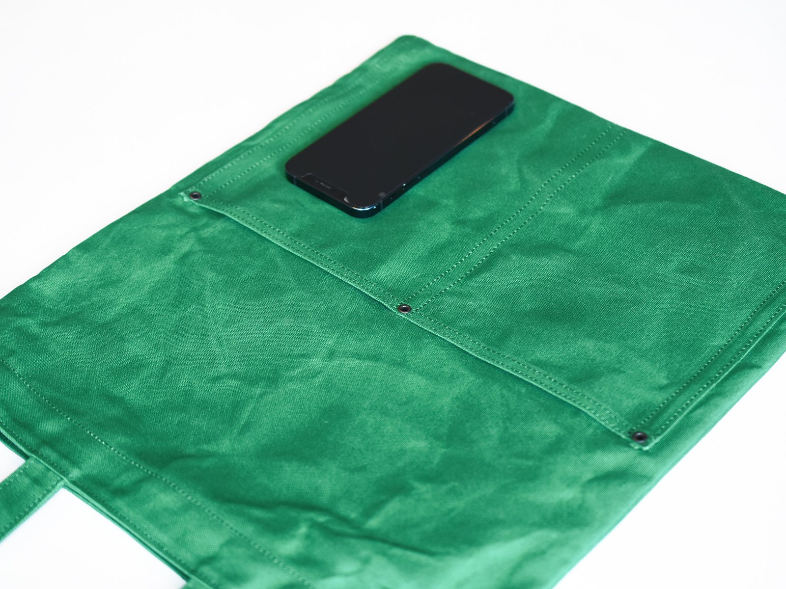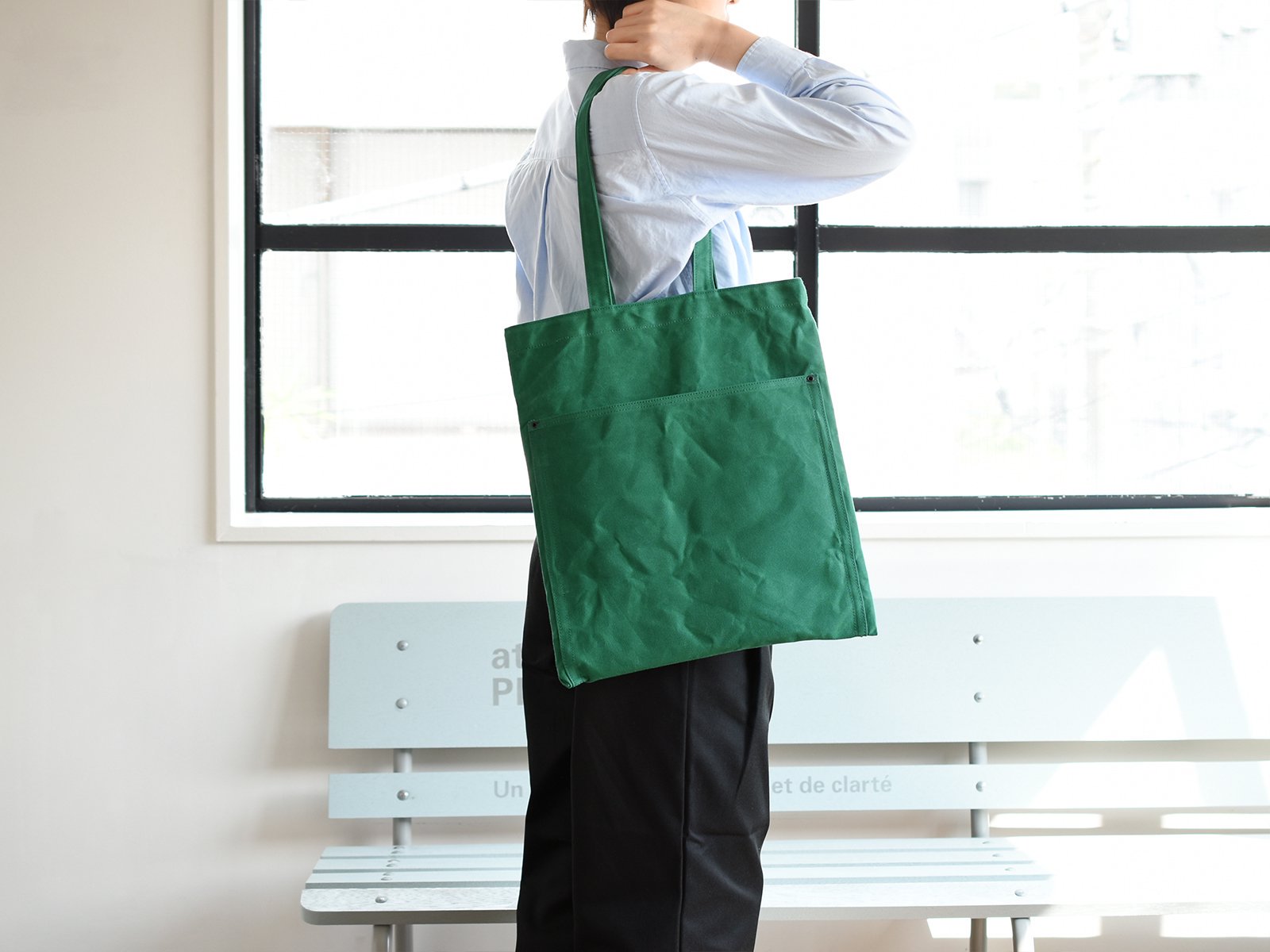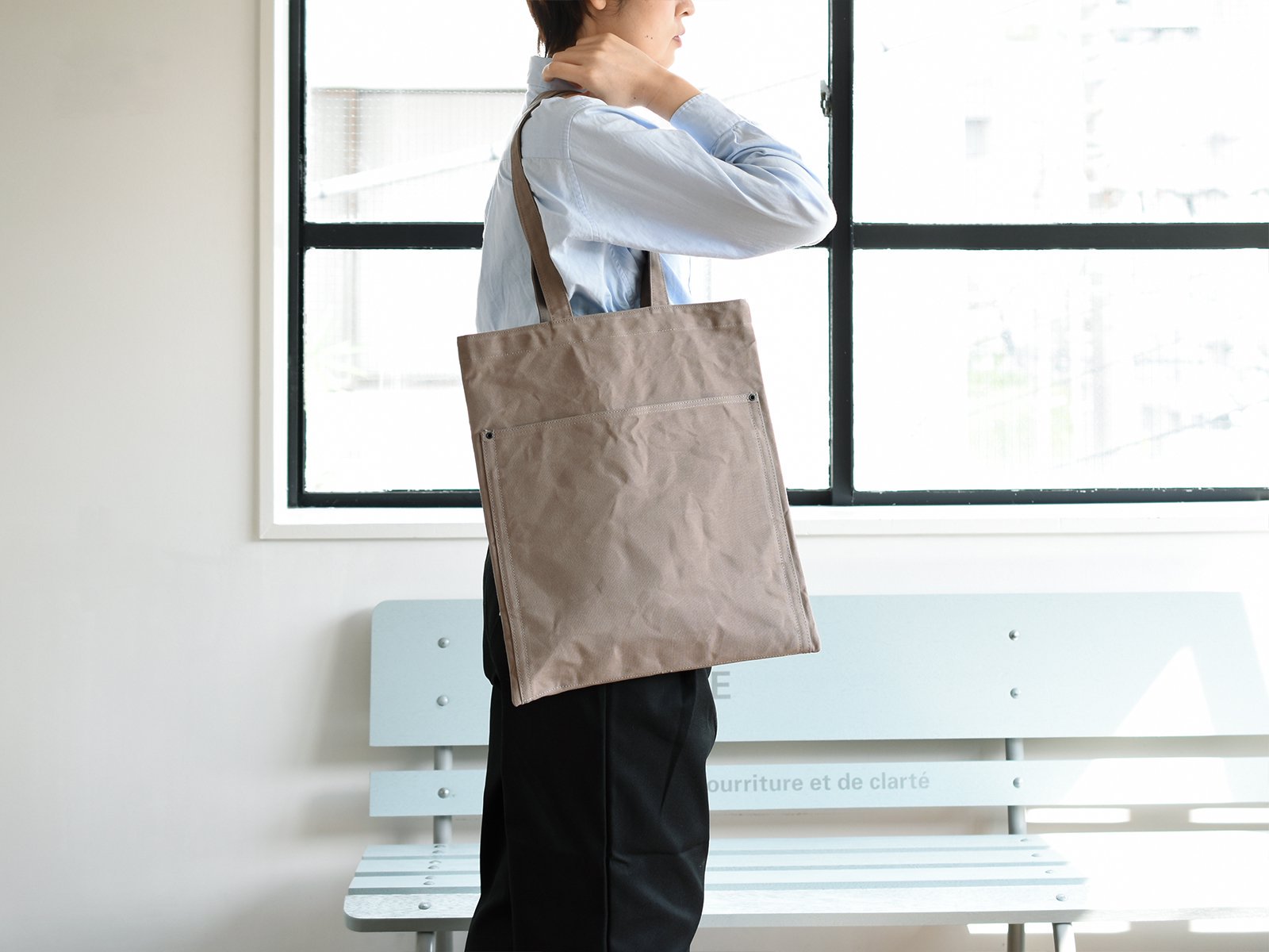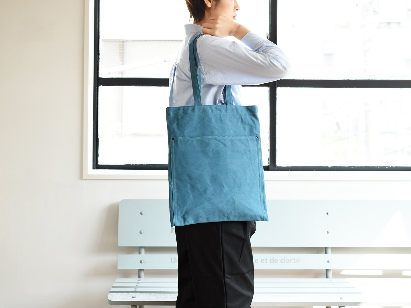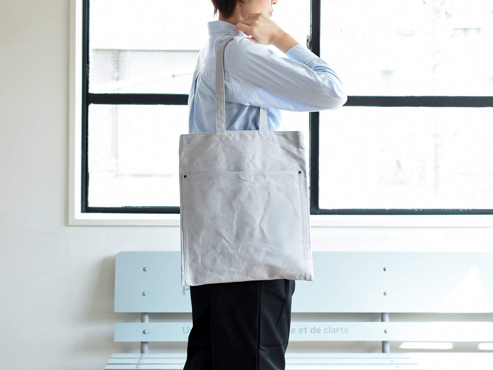 10호 파라핀 범포를 사용한 슬림한 디자인의 토트백. 서류나 노트북 수납에 적합한 사이즈로 어깨에 걸치기 쉽도록 핸들이 긴 디자인입니다. 총 7개의 포켓이 있어 수납이 편리합니다.