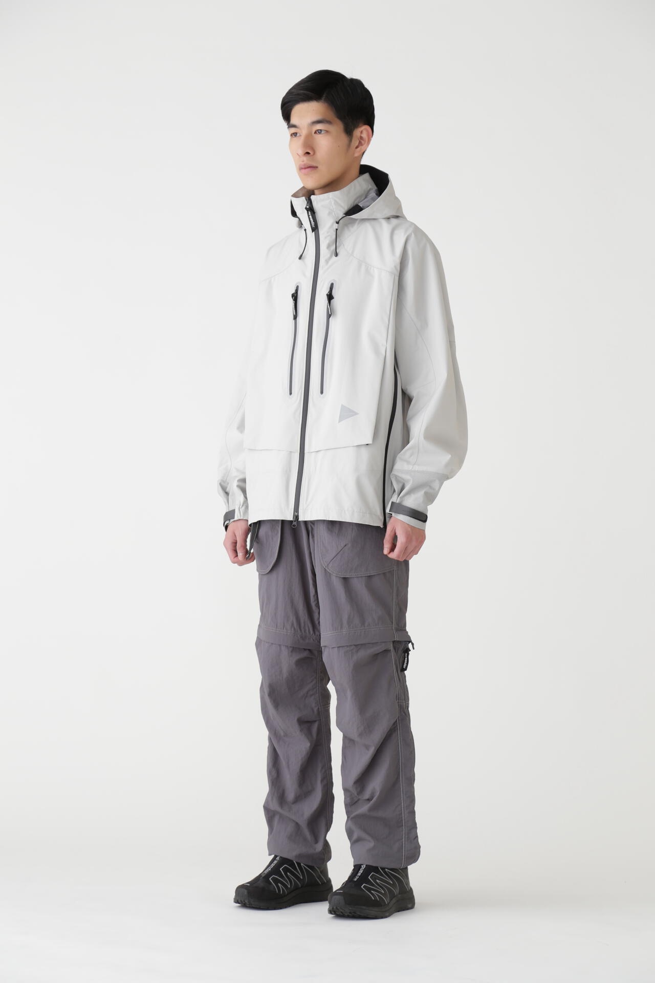 강도와 내구성을 갖춘 가벼운 나일론 태피터는 방수성과 자외선 차단 기능을 갖춥니다. 밑단 부분은 허벅지의 지퍼로 반바지로 입을 수 있습니다. 오른쪽 왼쪽 지퍼 컬러가 달라 구분하기 편합니다.