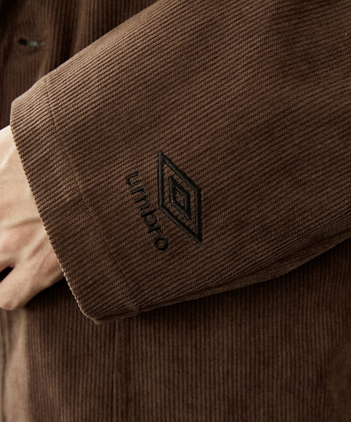 가슴 포켓이 없는 심플한 디자인이며 약간 루즈한 박스핏입니다. 밑단에는 패치 포켓이 있으며 왼쪽 소매단에 작게 엄브로 로고가 있습니다.