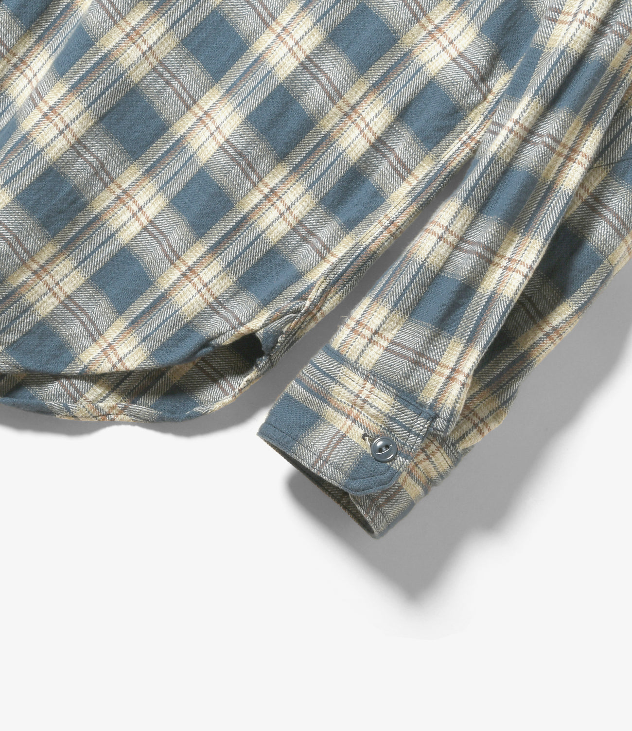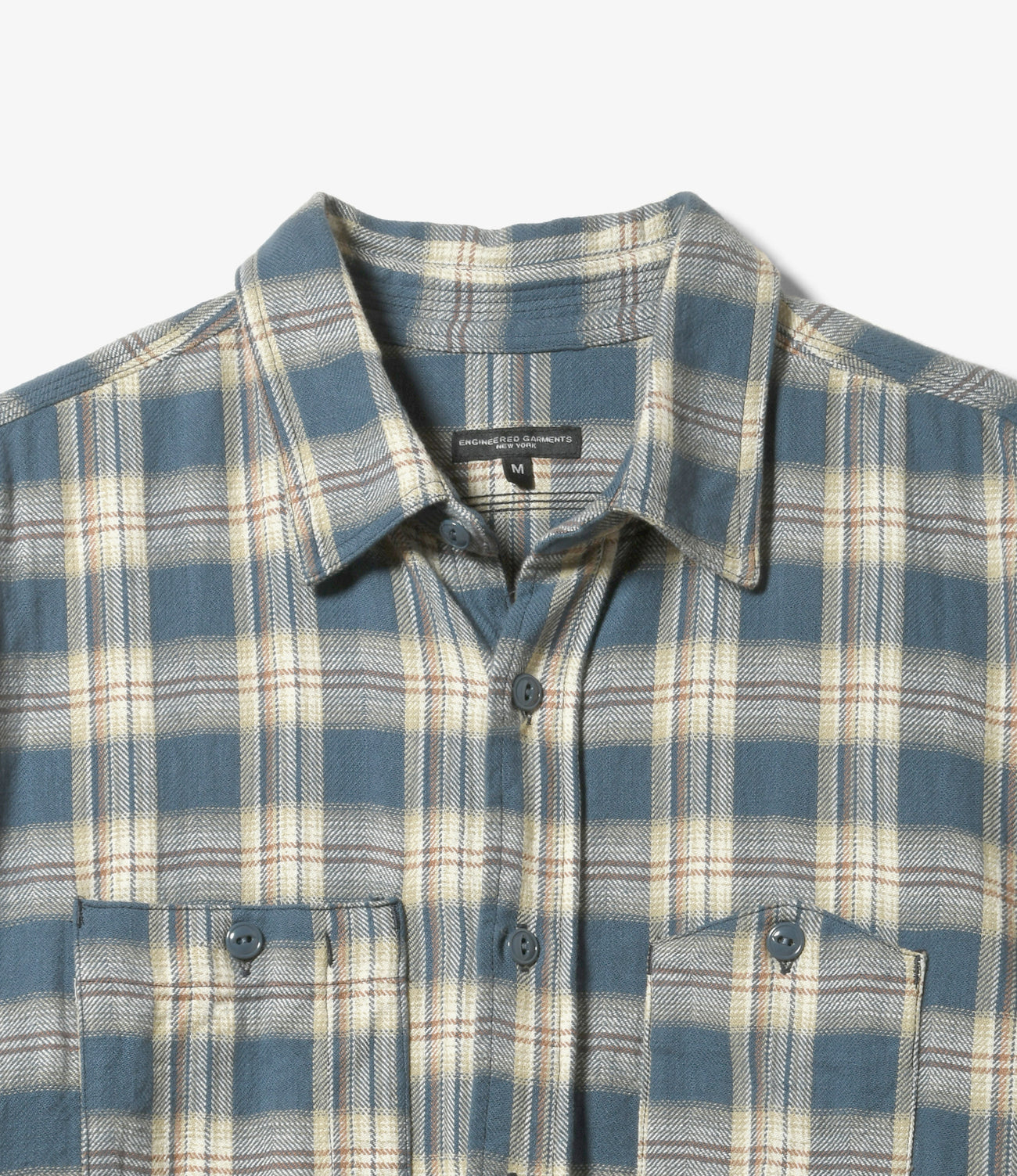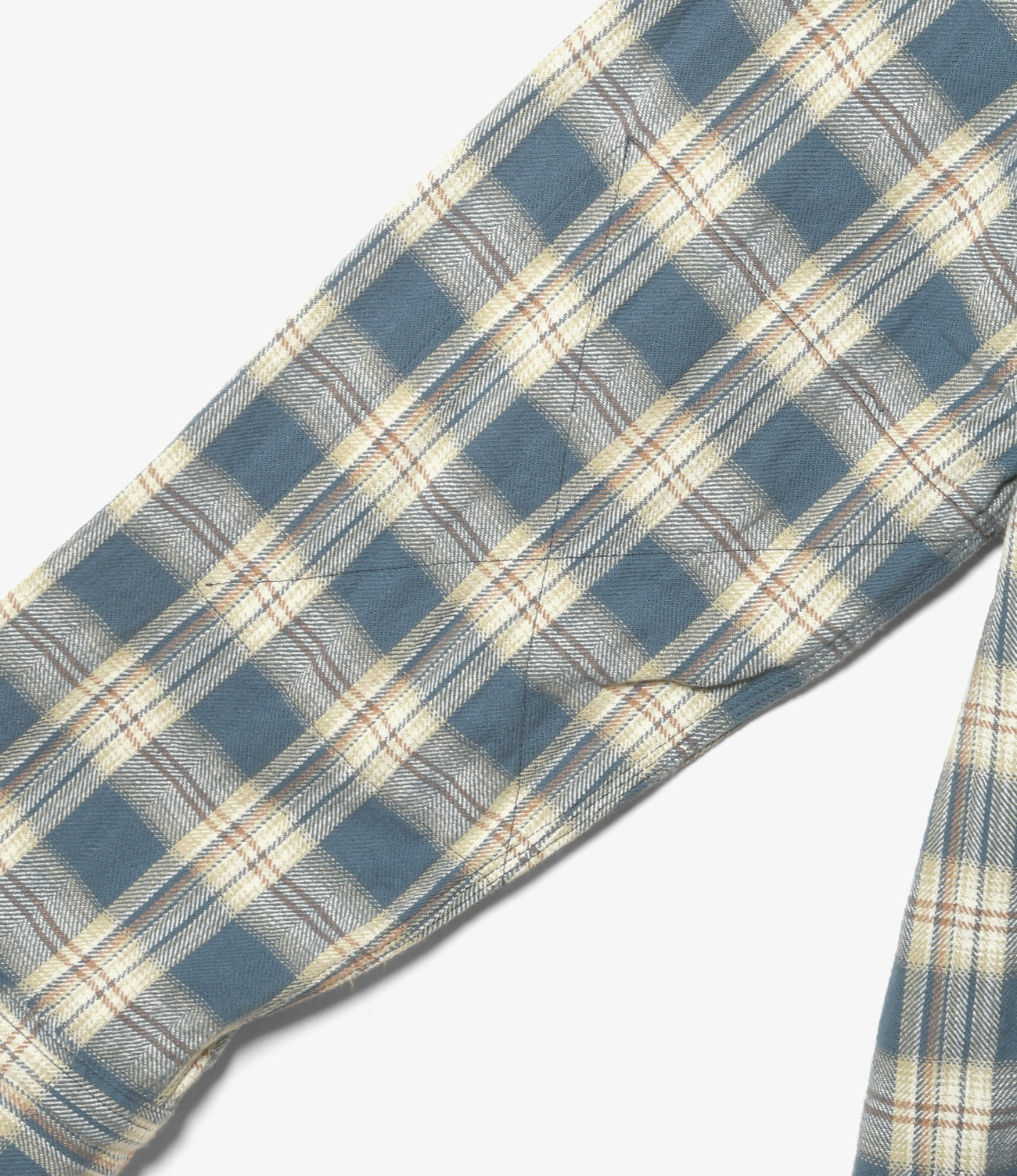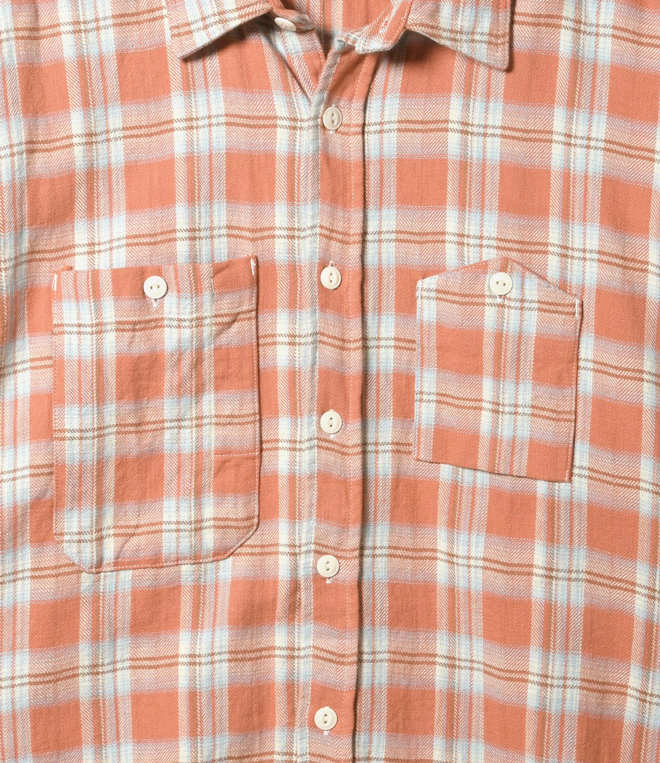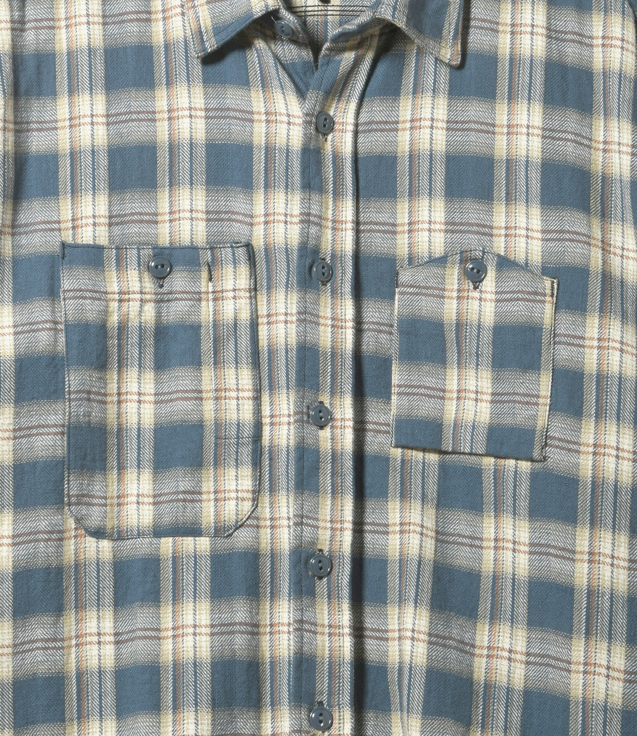 좌우 비대칭의 가슴 포켓, 팔꿈치 보강 원단, 빈티지 셔츠에서 볼 수 있는 고양이 눈 모양 버튼 등 디테일이 살아있는 디자인이 특징입니다.
